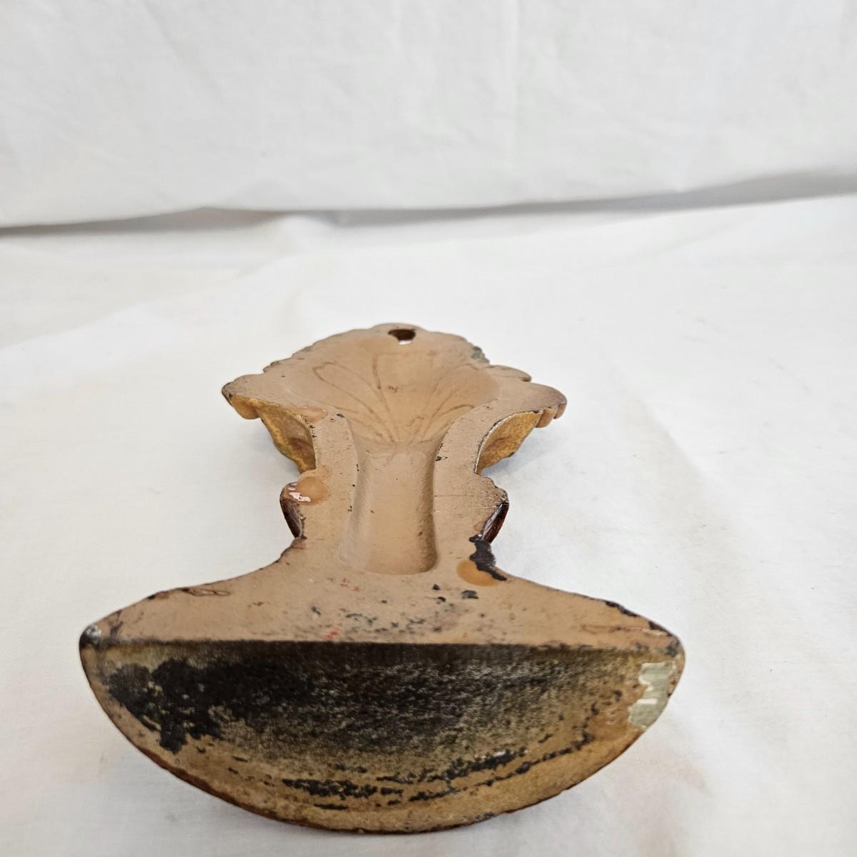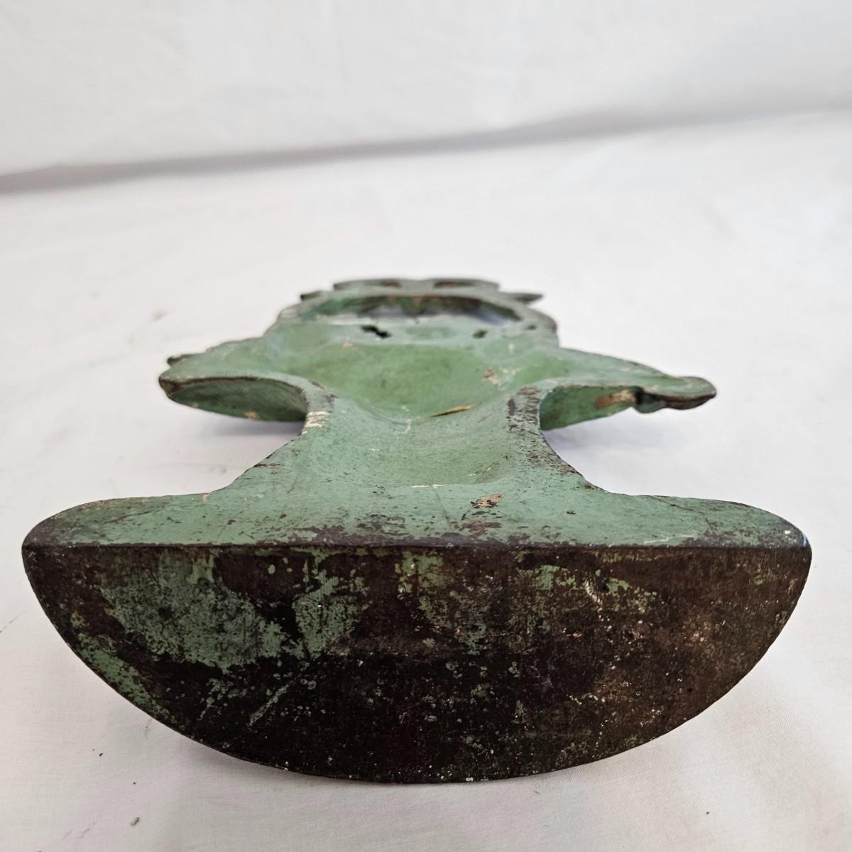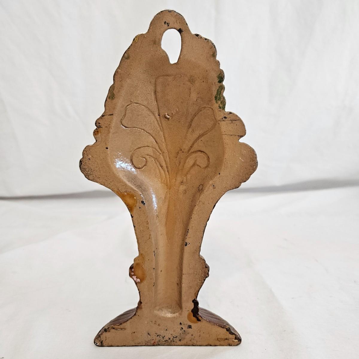 A pair of vintage cast iron door stops that have a floral design. The largest stop with the bow measures approximately 5.5" x 2.25" x 11"H. Shipping available