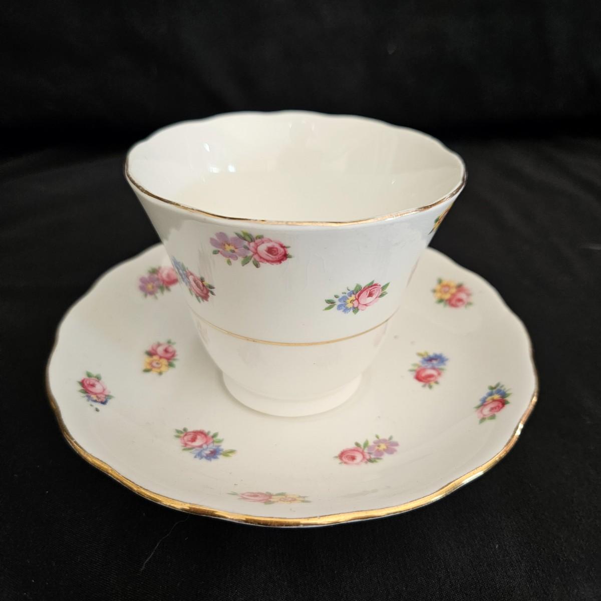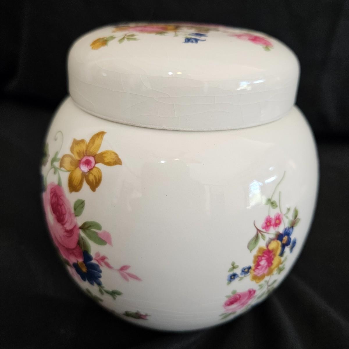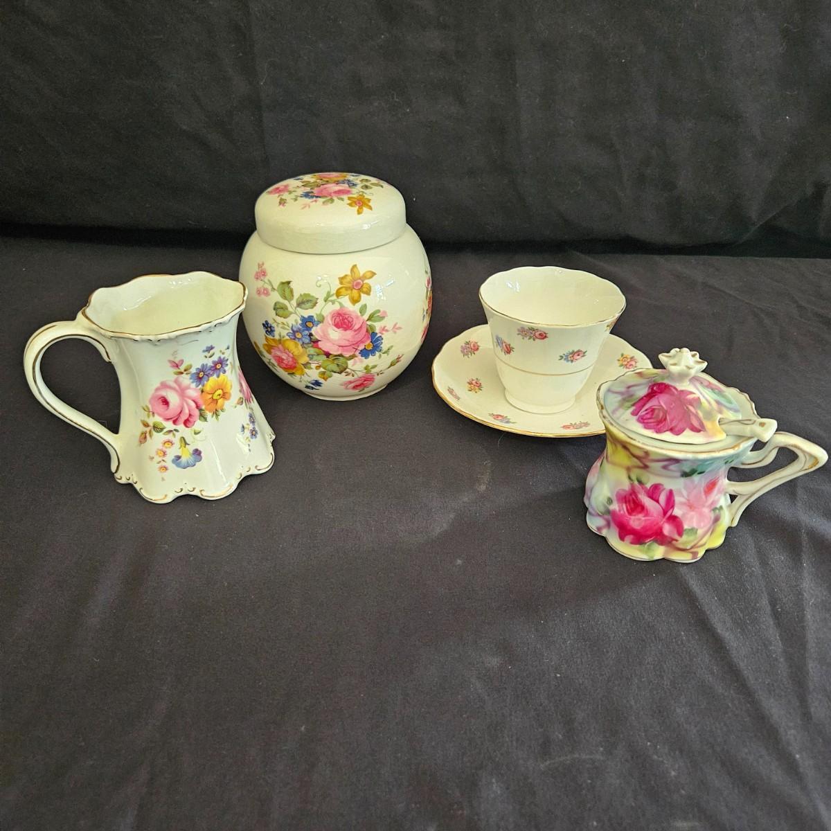 Five pieces of China with a floral theme from manufacturers like Colclough, Sagler and St George. The lidded jar measures approximately 4.5"D x 5.5"H. Shipping available