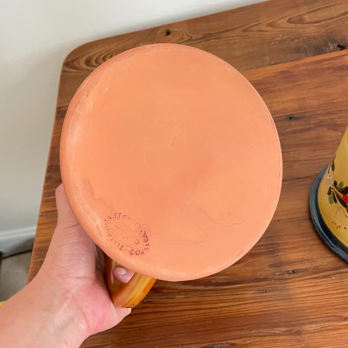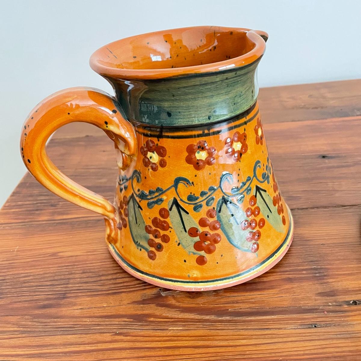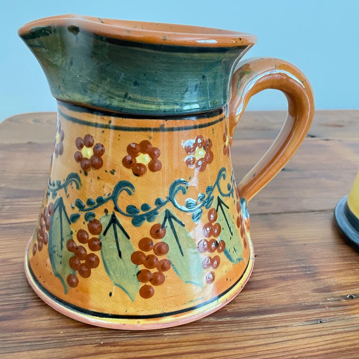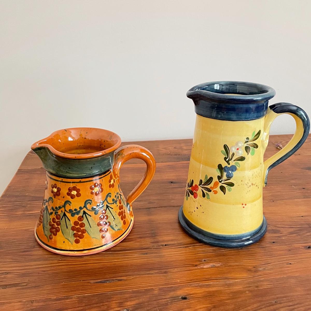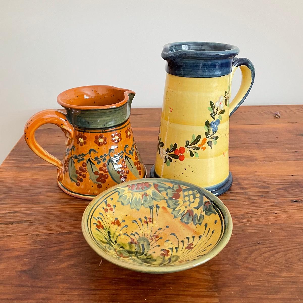Two stamped ceramic pitchers. The taller is 5.75” x 9”, the shortest is 6.25”s x 6”. The shallow bowl is 7”d x 2” and has the same mark as the shorter pitcher. Shipping available.