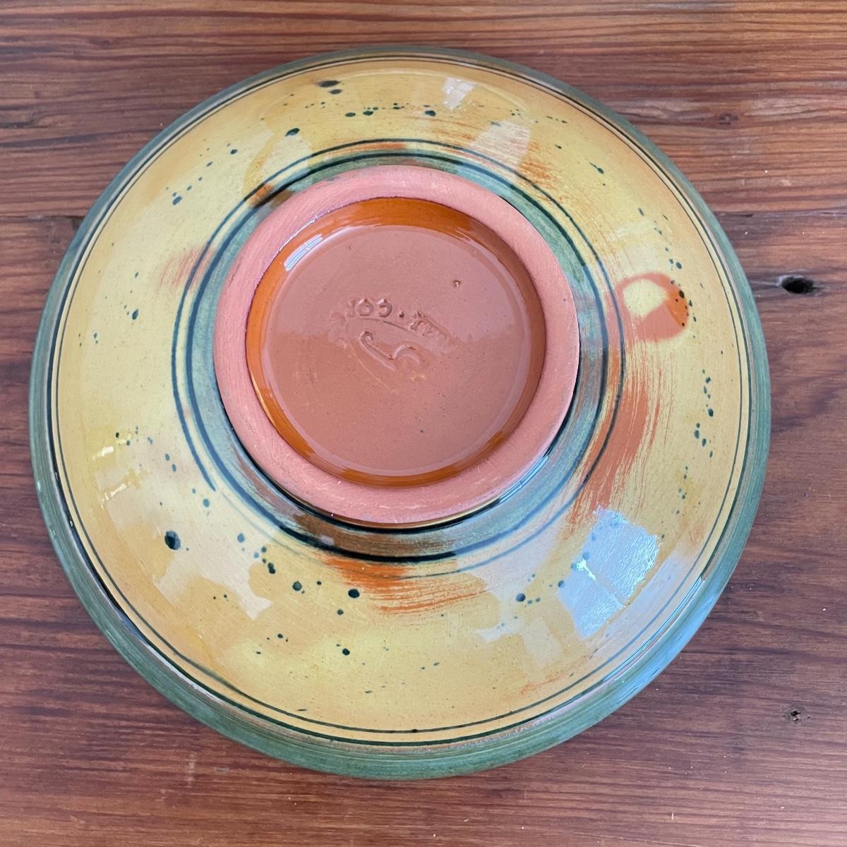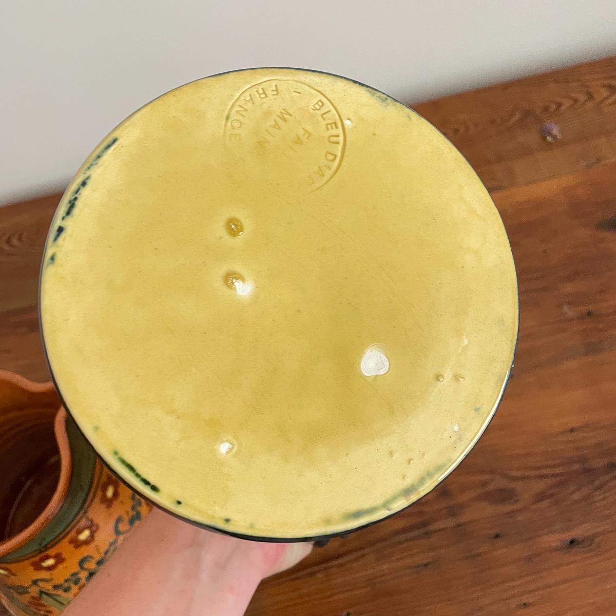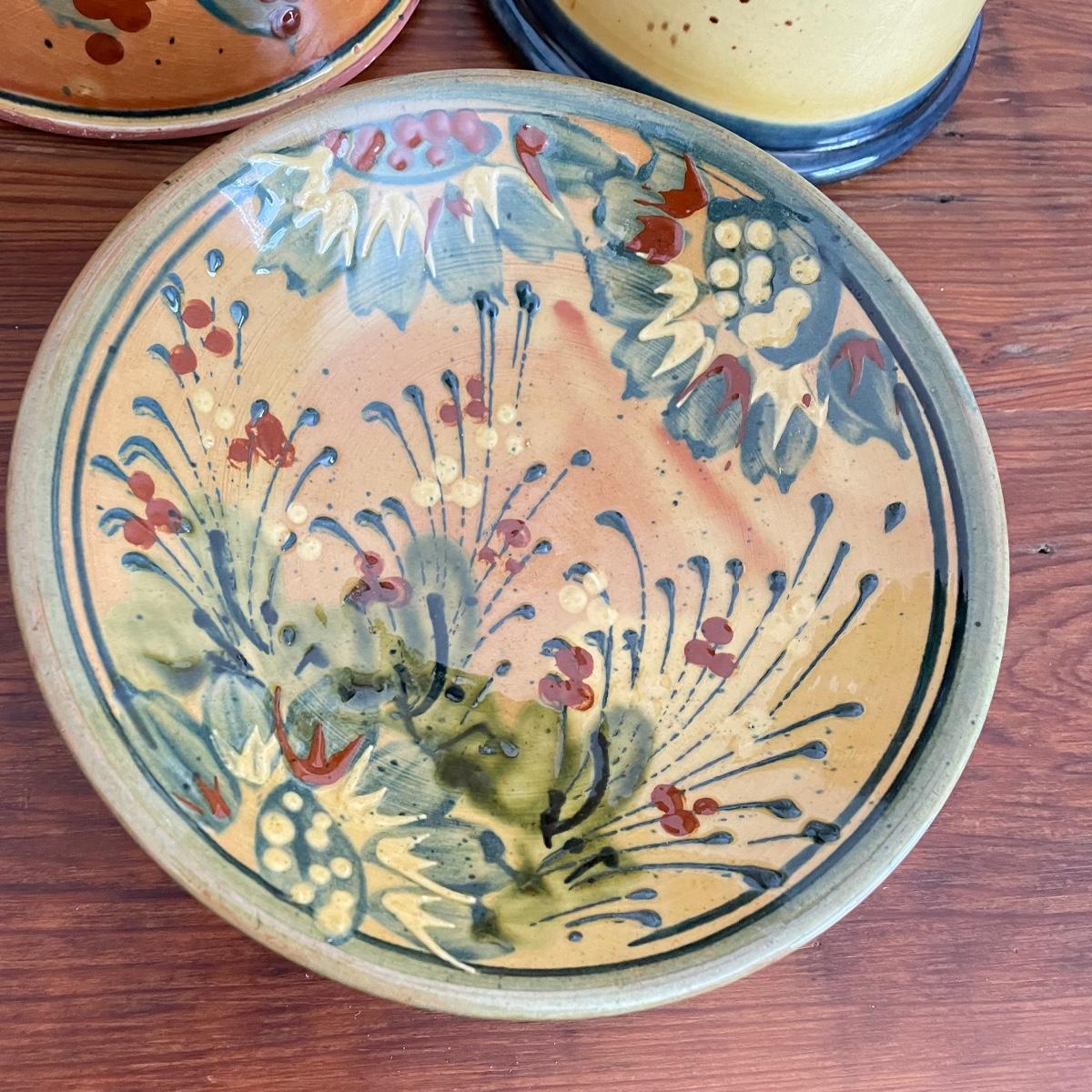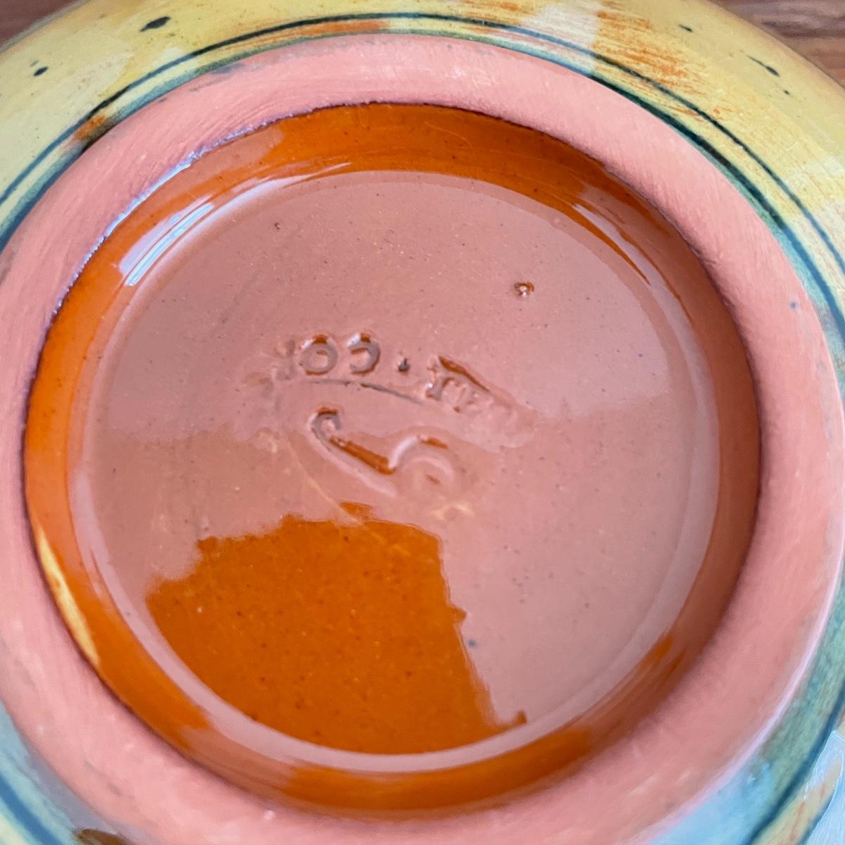 Two stamped ceramic pitchers. The taller is 5.75” x 9”, the shortest is 6.25”s x 6”. The shallow bowl is 7”d x 2” and has the same mark as the shorter pitcher. Shipping available.