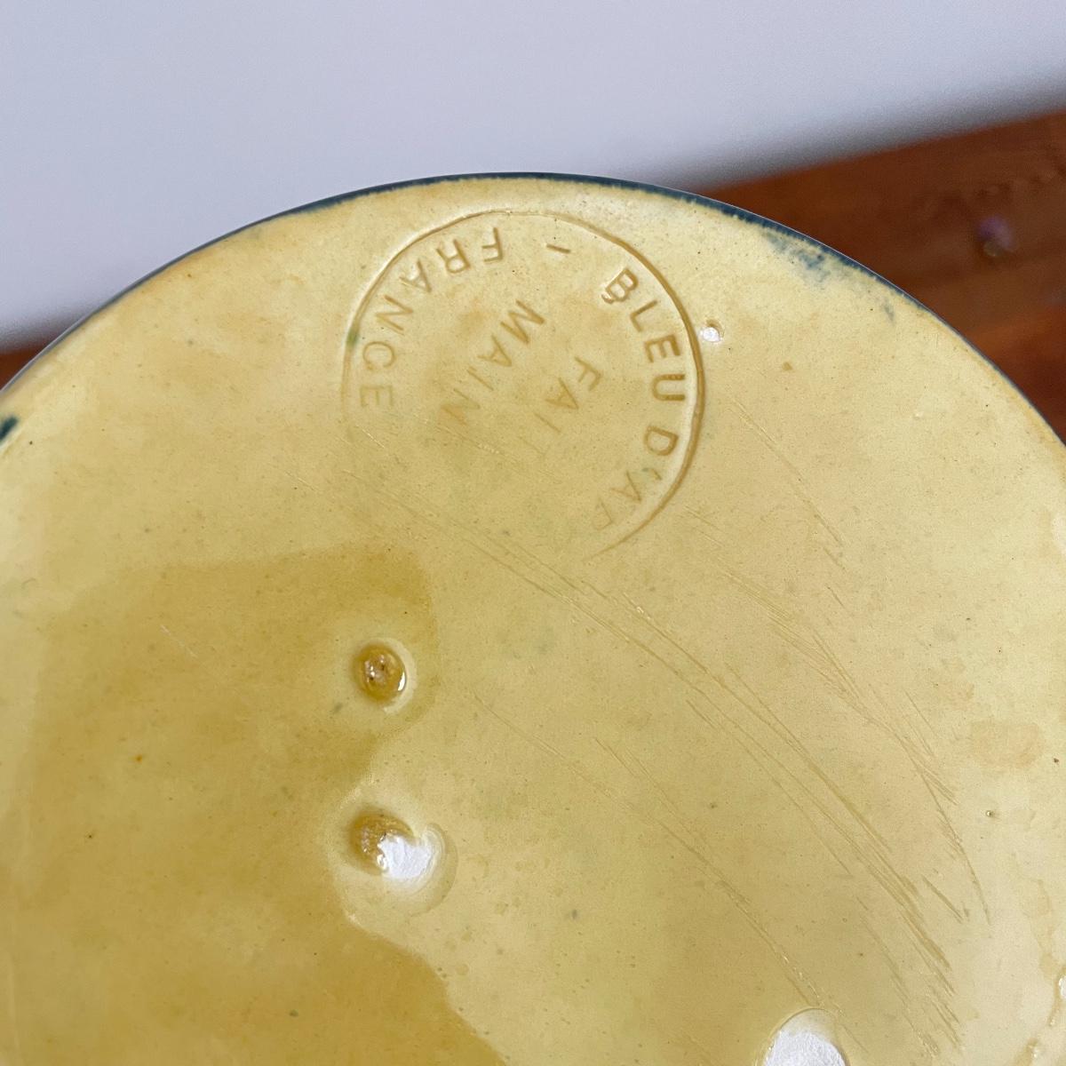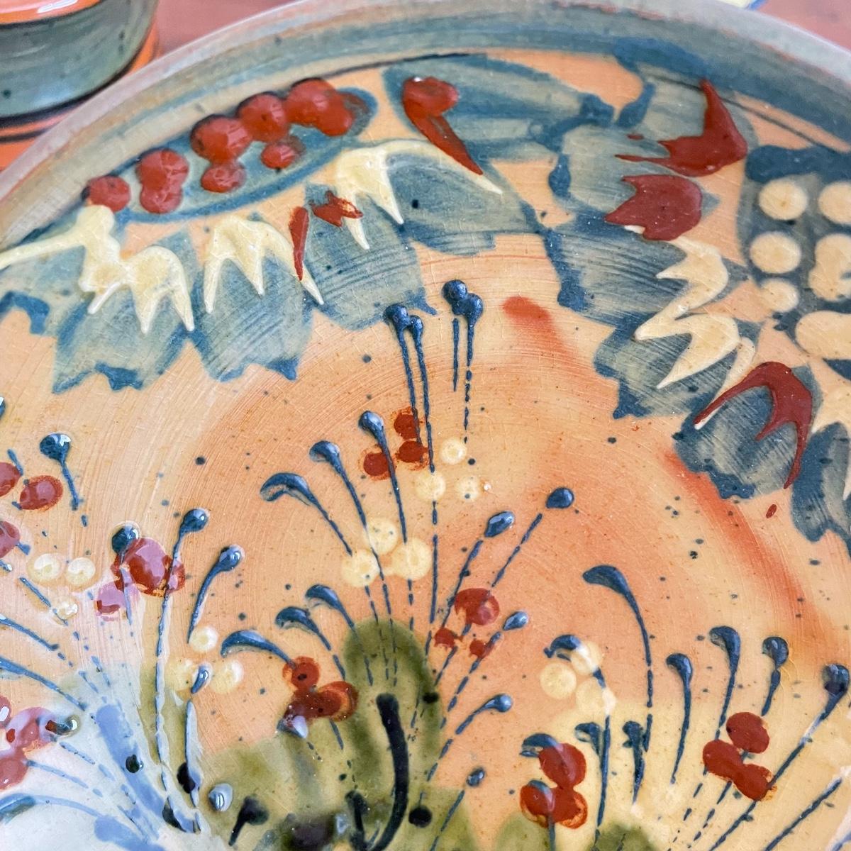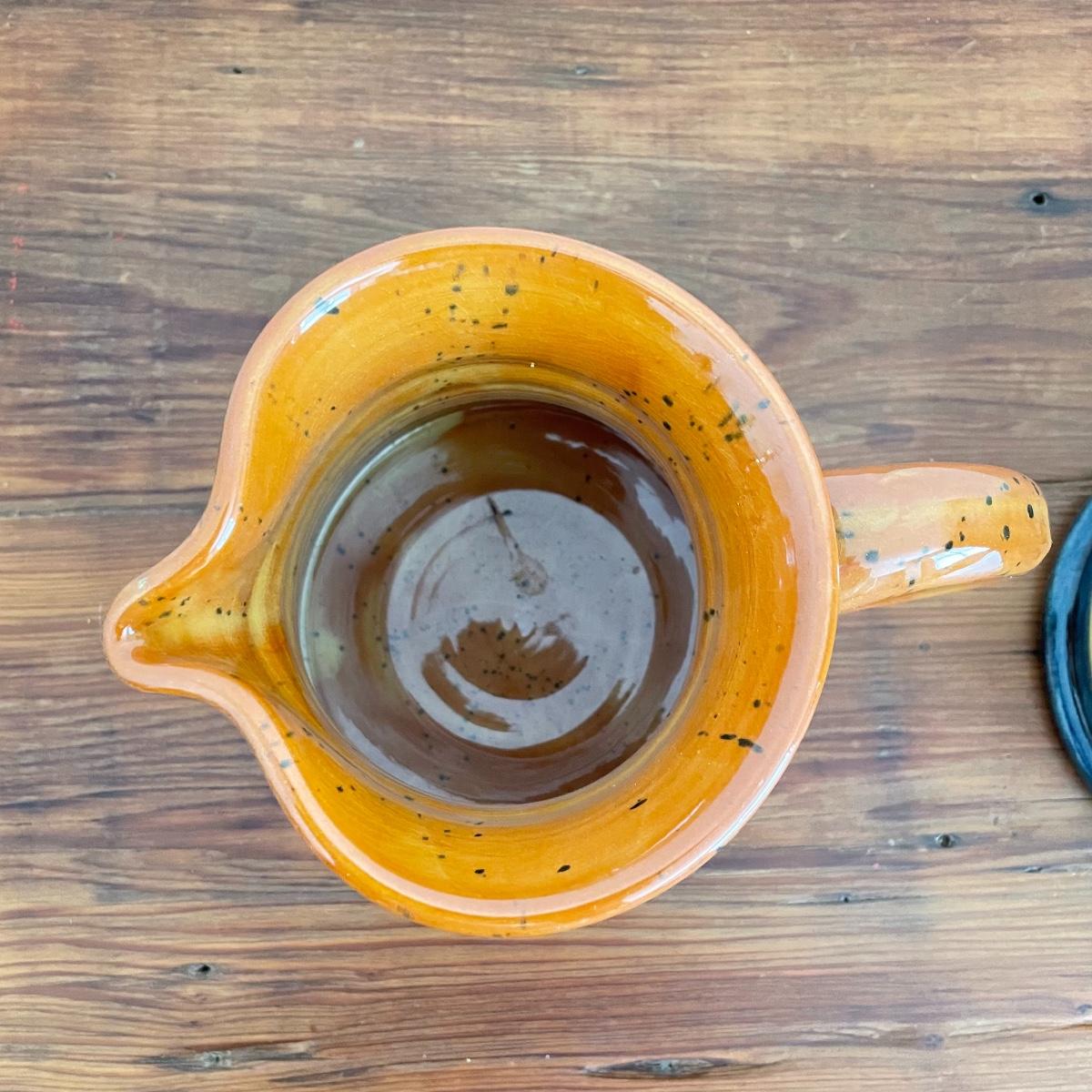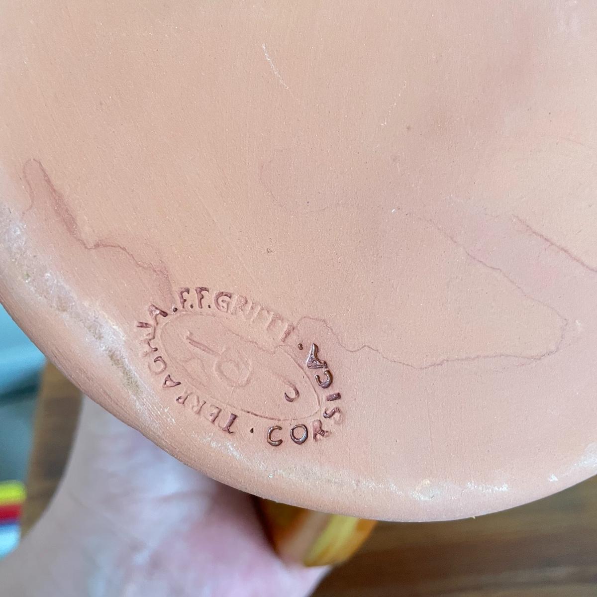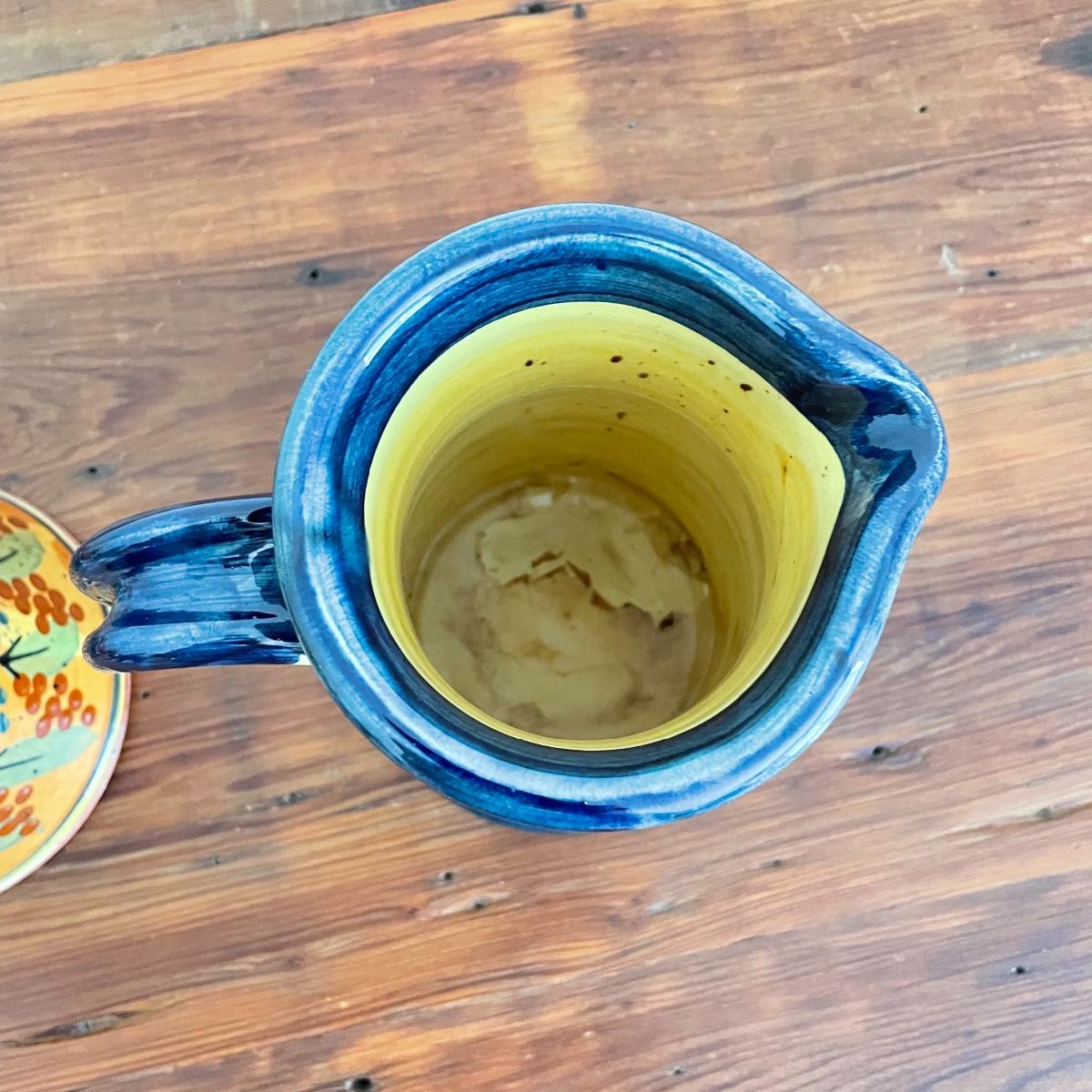 Two stamped ceramic pitchers. The taller is 5.75” x 9”, the shortest is 6.25”s x 6”. The shallow bowl is 7”d x 2” and has the same mark as the shorter pitcher. Shipping available.