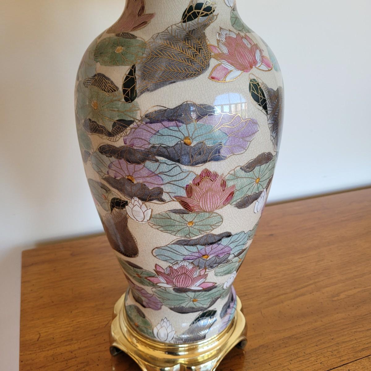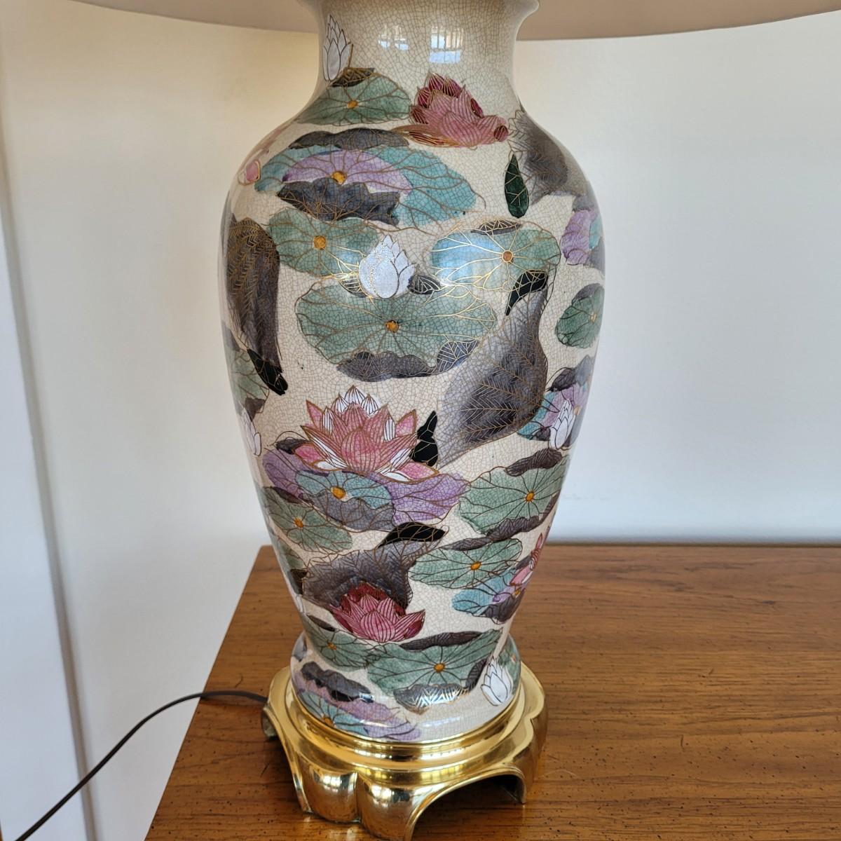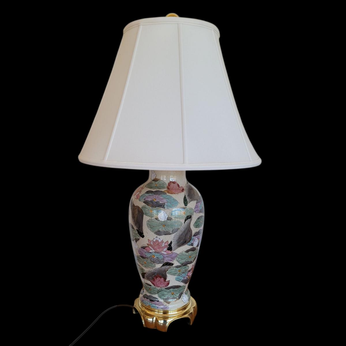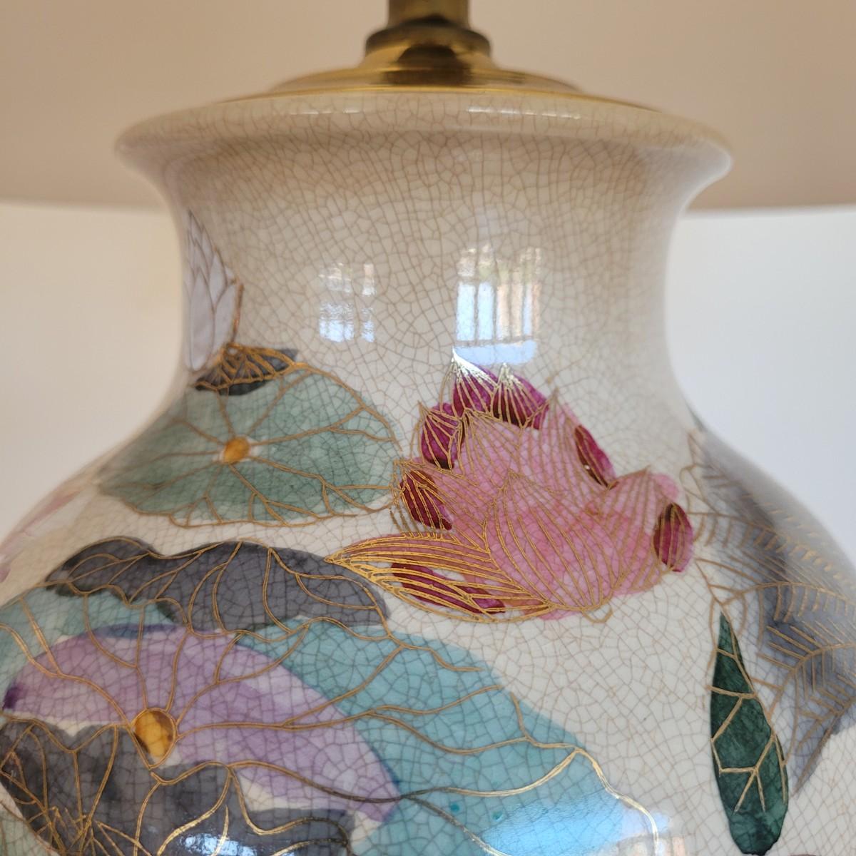 This lot includes a decorative floral table lamp. The base of the lamp is brass-colored metal with a ceramic body that features gilded lotus flowers with a crazed glaze appearance. The lamp shade is made from white cloth and metal. The lamp powered on when plugged in. The lamp measures 18" x 7" x 33"H. The shade measures 18" x 13"H.