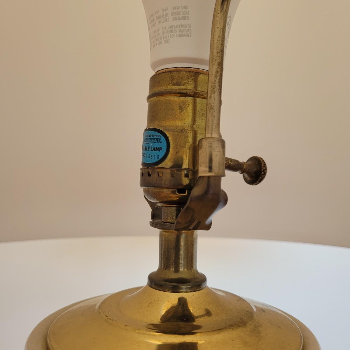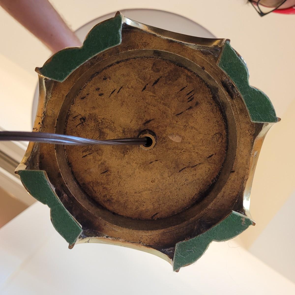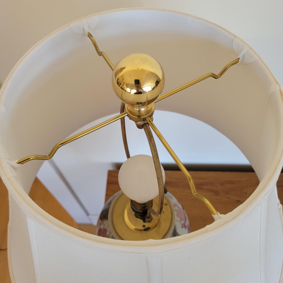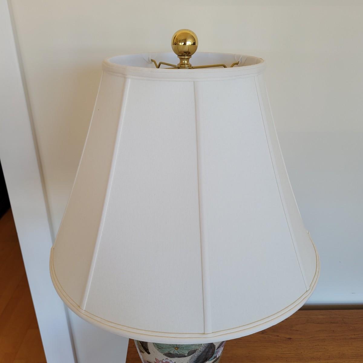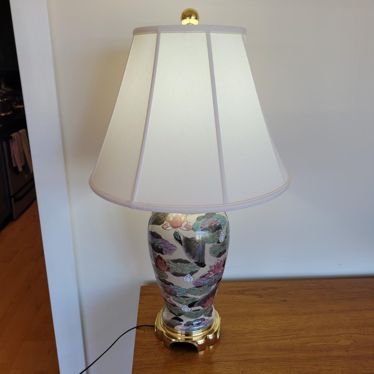 This lot includes a decorative floral table lamp. The base of the lamp is brass-colored metal with a ceramic body that features gilded lotus flowers with a crazed glaze appearance. The lamp shade is made from white cloth and metal. The lamp powered on when plugged in. The lamp measures 18" x 7" x 33"H. The shade measures 18" x 13"H.
