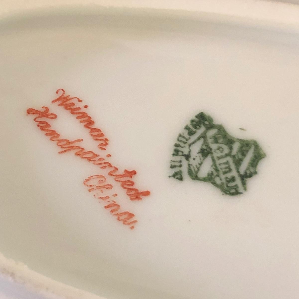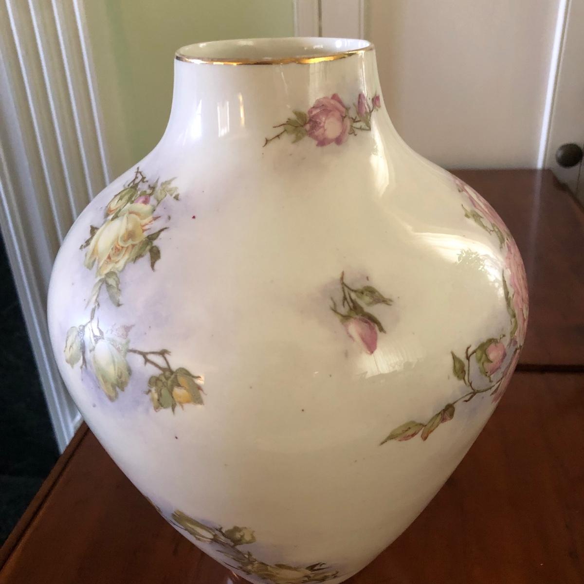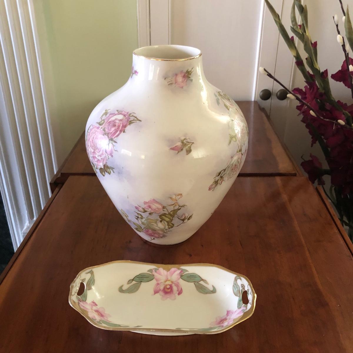 Dimensions for the vase are 8” wide with a 3” mouth and it stands over 10” tall. The butter dish measures 7.5” x 4” x 1.5”. Please note marks on the bottom of each piece of China. Shipping Available.