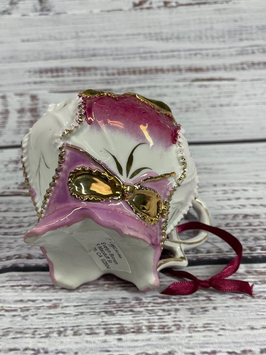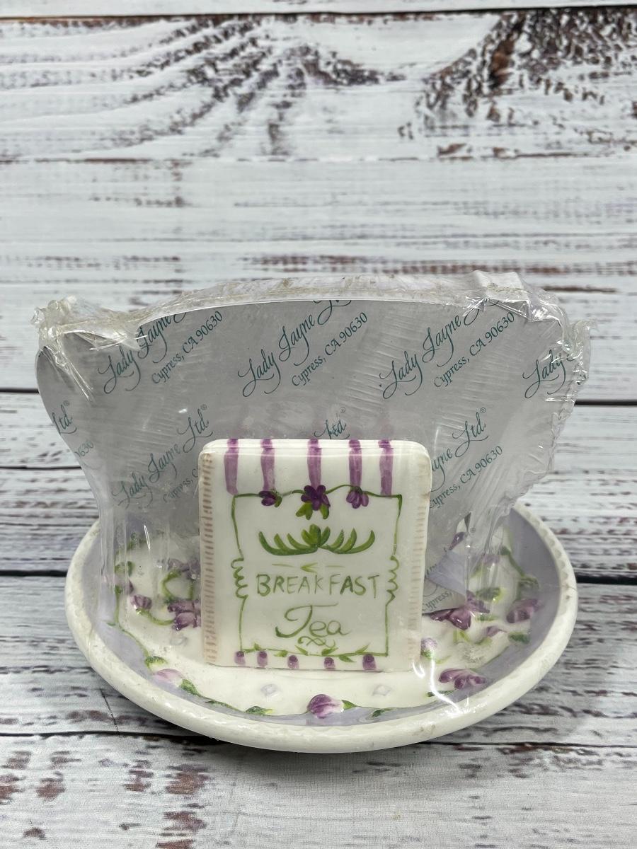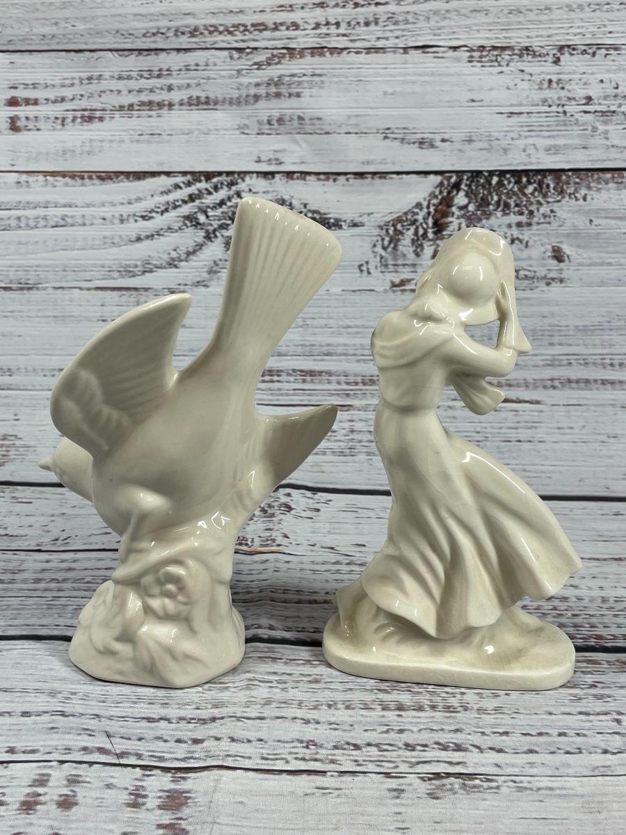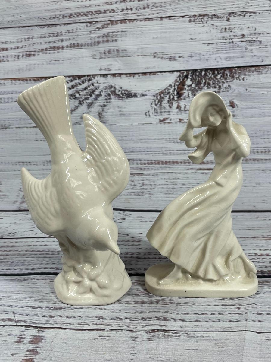 This set includes: floral vase, porcelain flower statue, cup, jewelry box, small clock, plate that comes with a pen and paper, a bird statue, a woman statue, and a teapot figure. There is some filter stuck inside the cup and some statues have small cracks and little discoloration.
