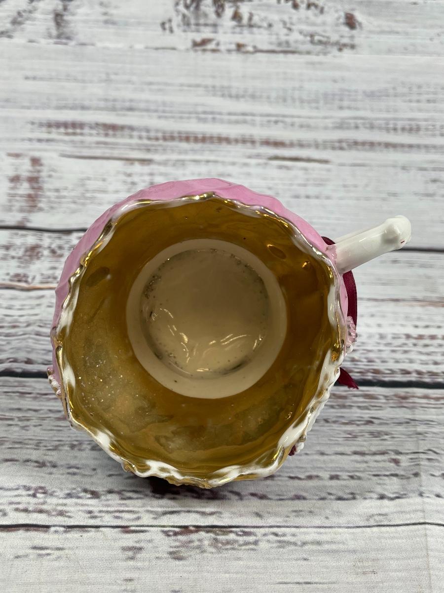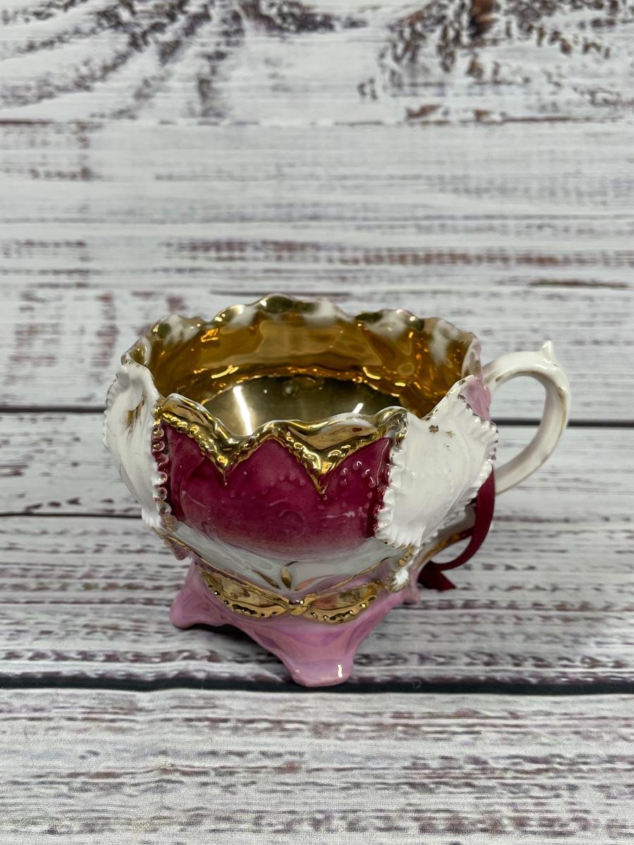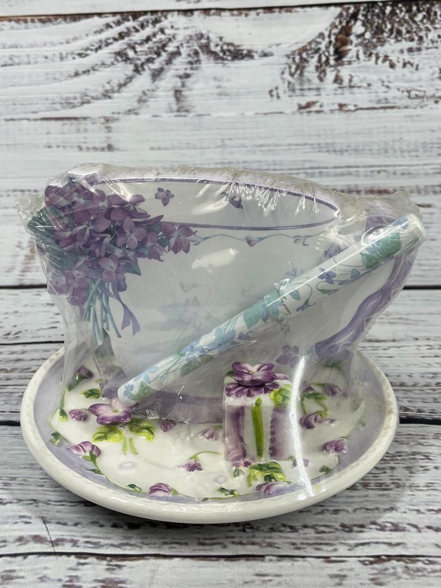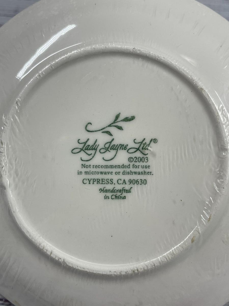 This set includes: floral vase, porcelain flower statue, cup, jewelry box, small clock, plate that comes with a pen and paper, a bird statue, a woman statue, and a teapot figure. There is some filter stuck inside the cup and some statues have small cracks and little discoloration.