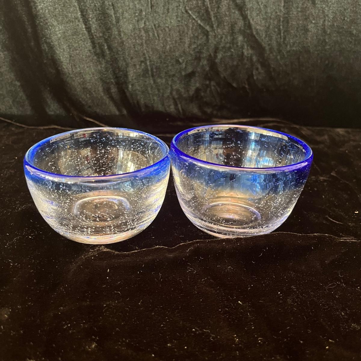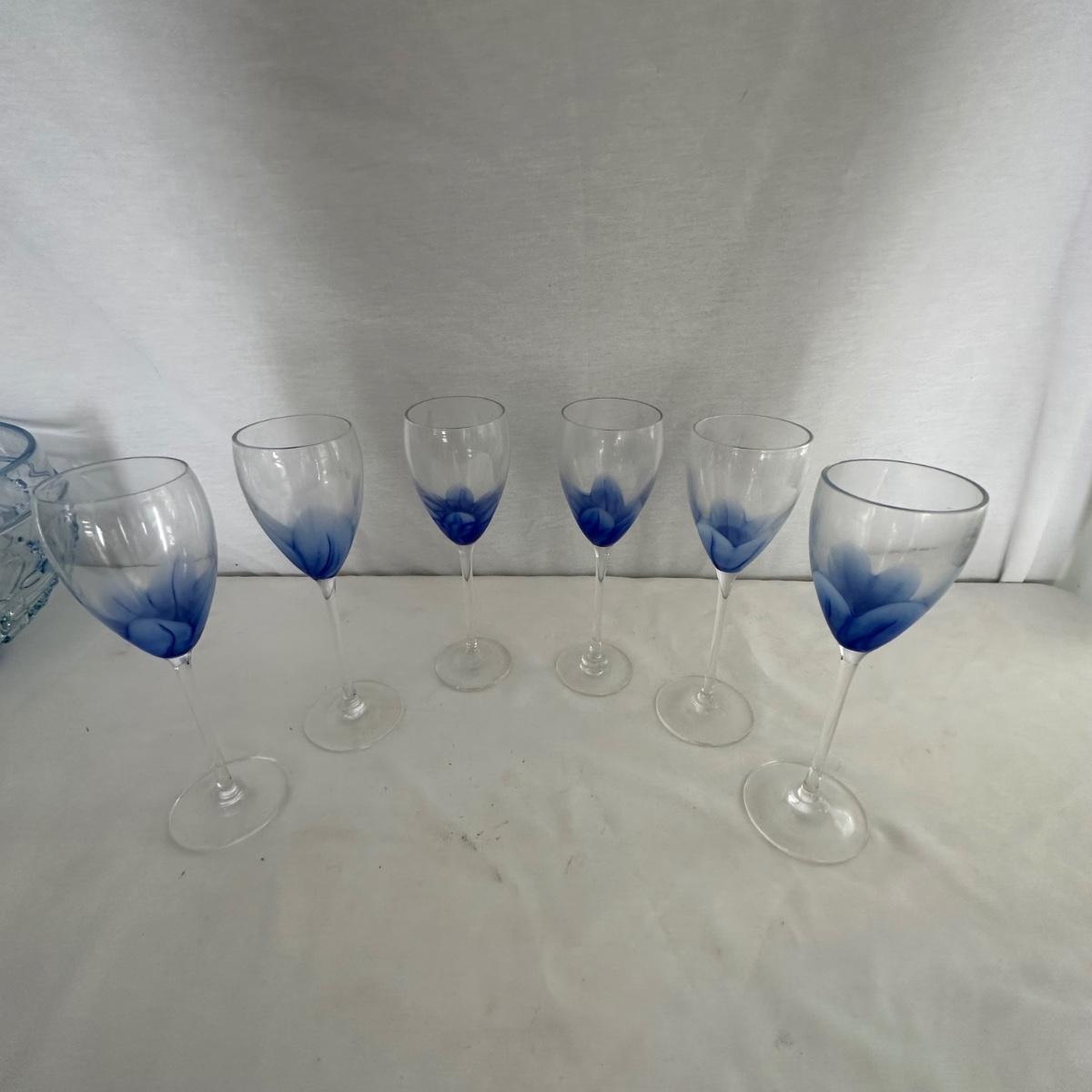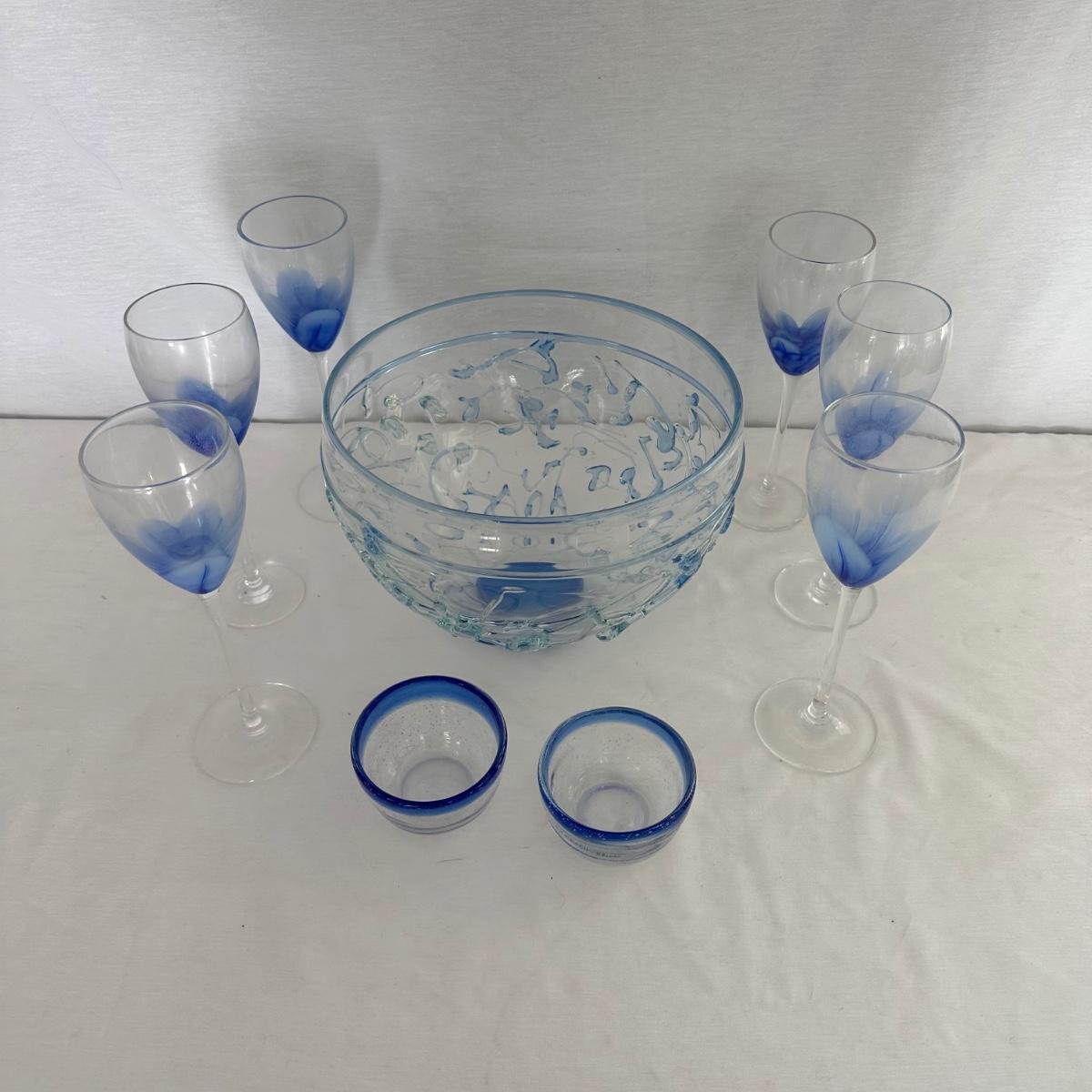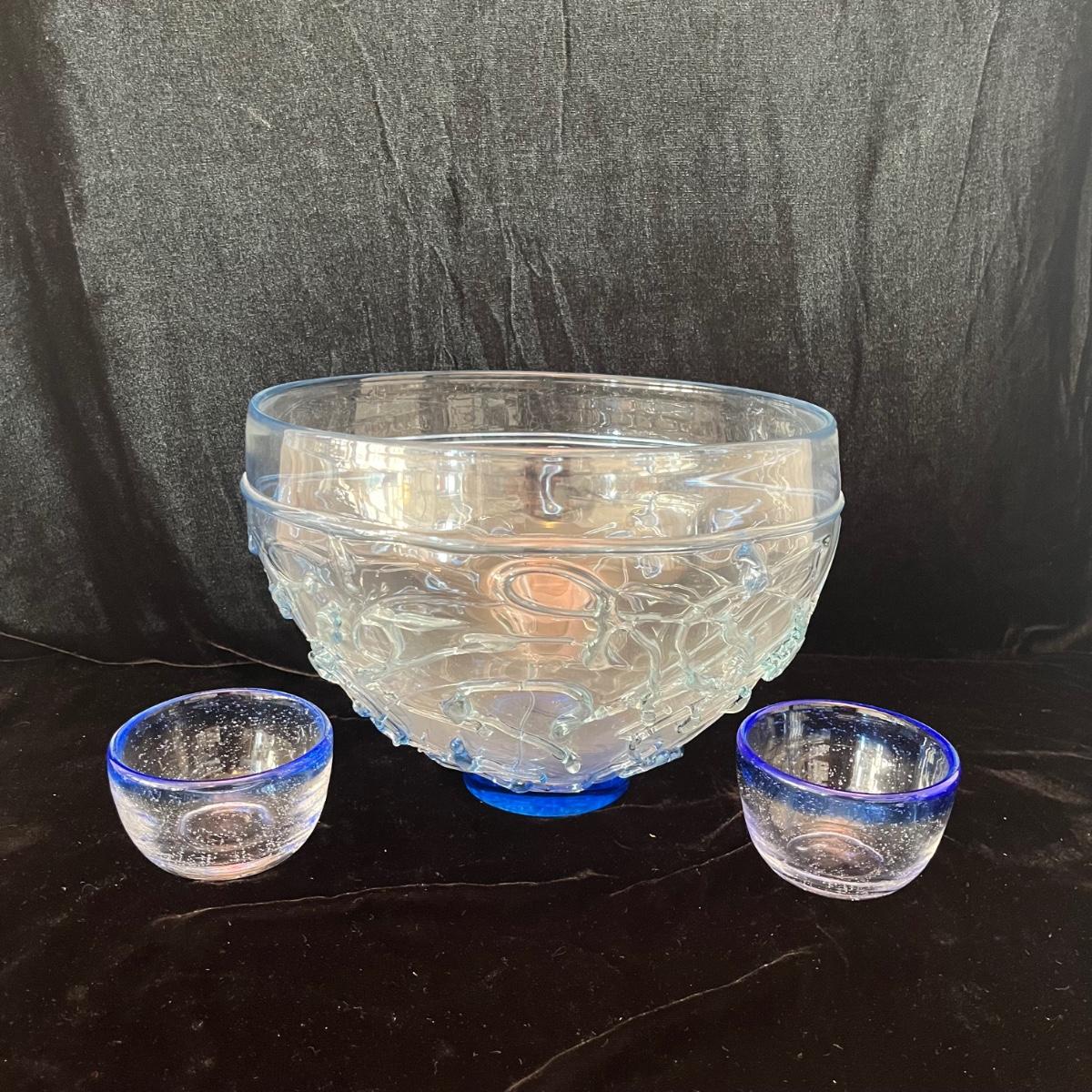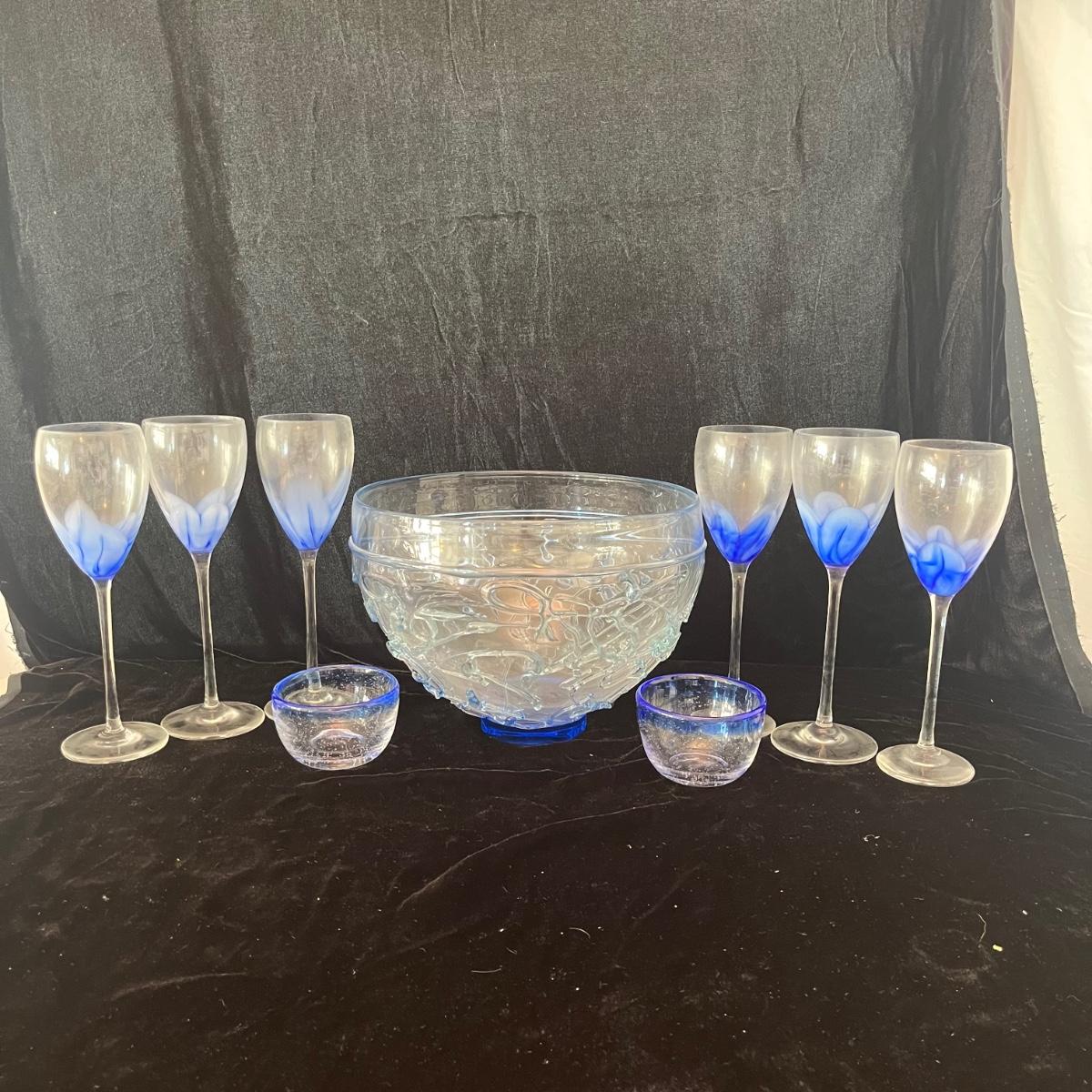 Lot includes six wine glasses with a floral design, two bubble glass bowls and a large glass bowl with a unique glass finish. Large bowl measures 10”D x 7.5”H.