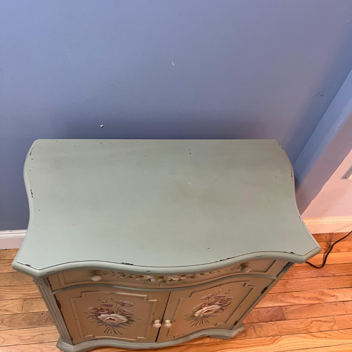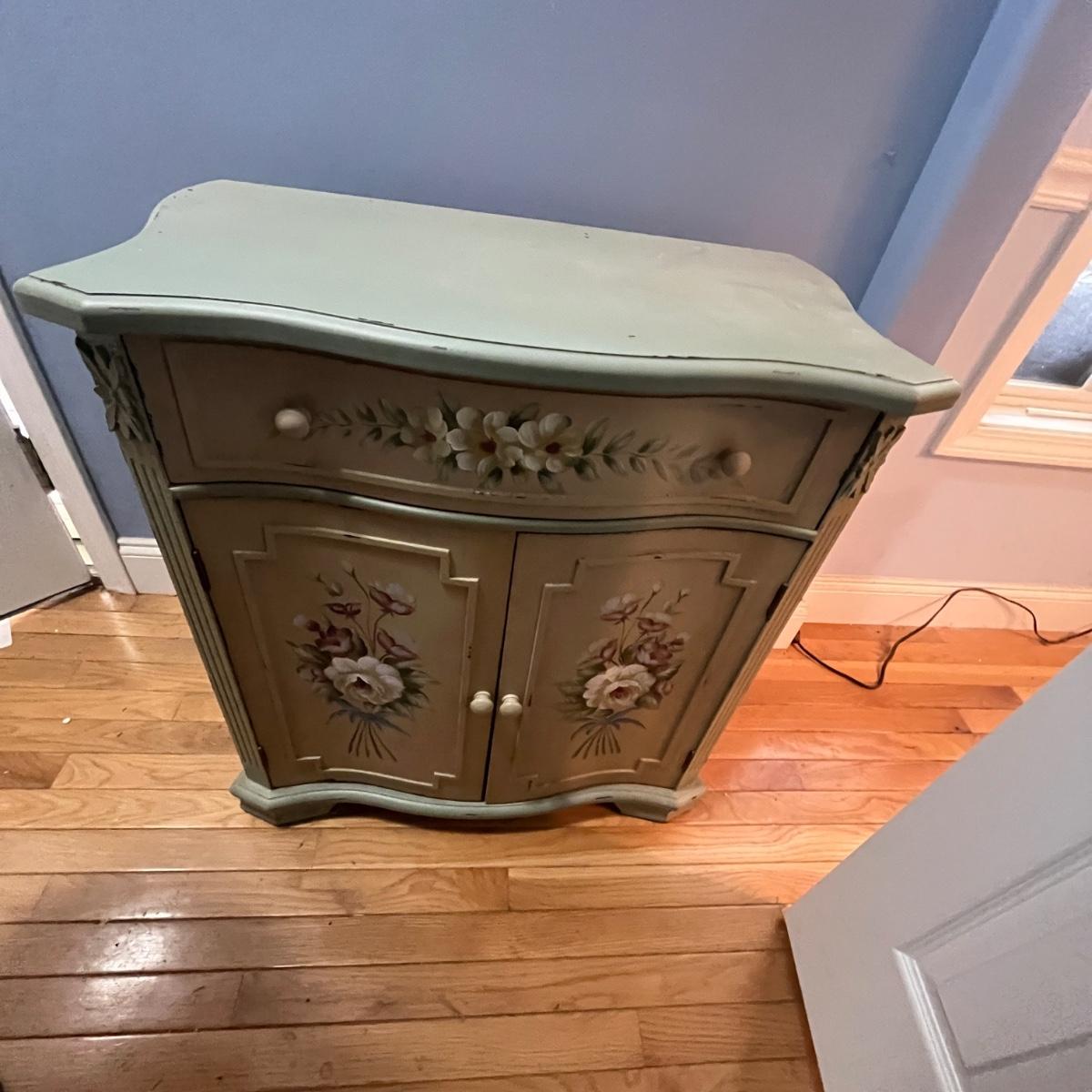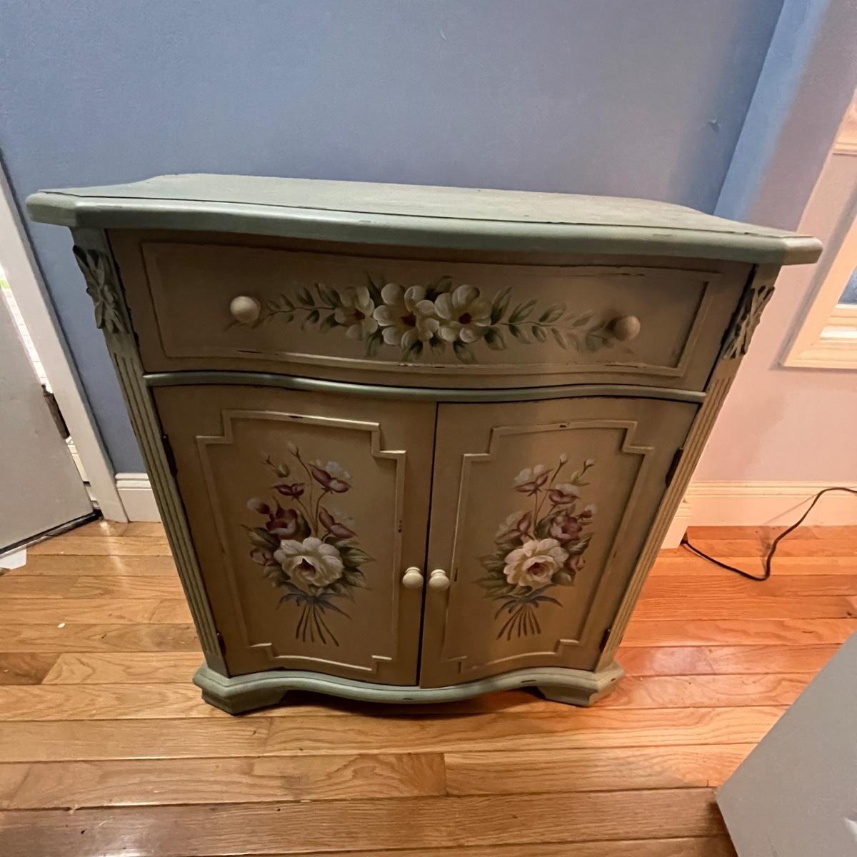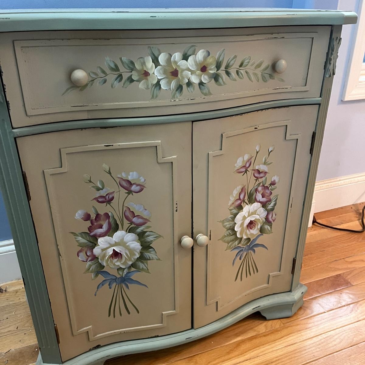 Lot includes a wooden distressed painted cabinet with floral painted design on front. Cabinet has one drawer and two doors below with shelves inside. Cabinet measures 28” x 15” x 30”H.