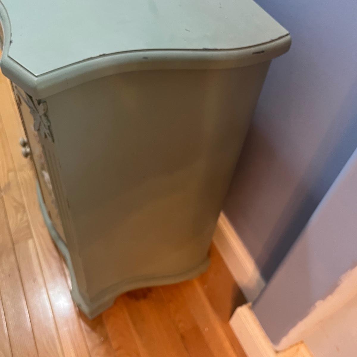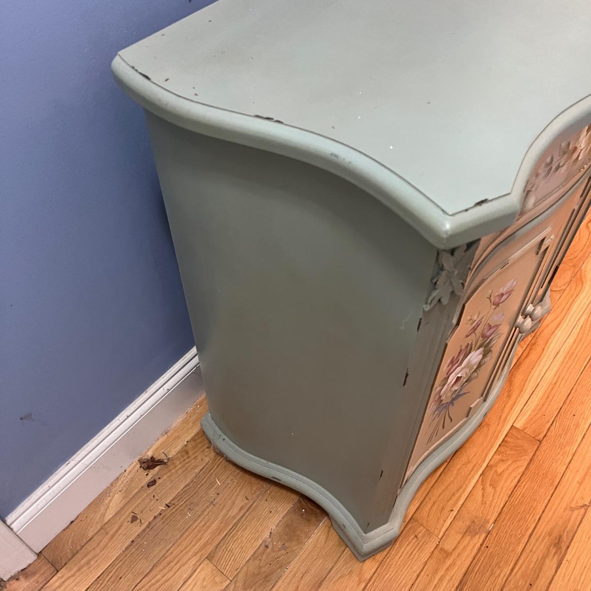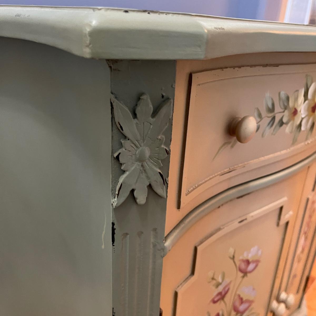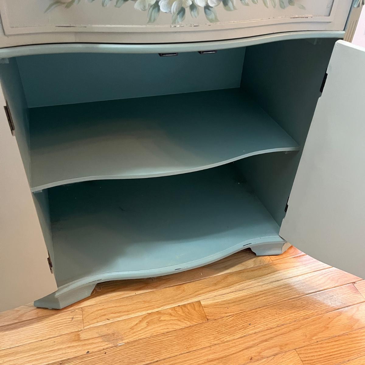 Lot includes a wooden distressed painted cabinet with floral painted design on front. Cabinet has one drawer and two doors below with shelves inside. Cabinet measures 28” x 15” x 30”H.