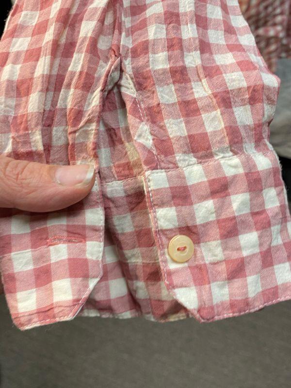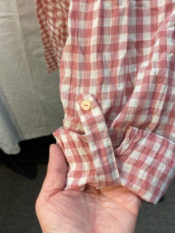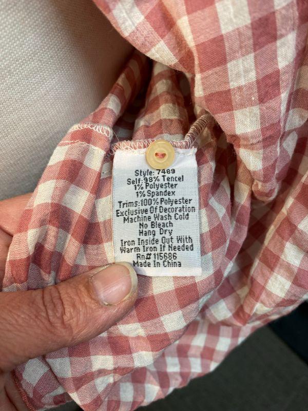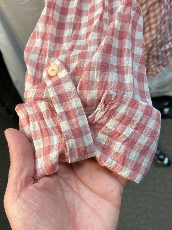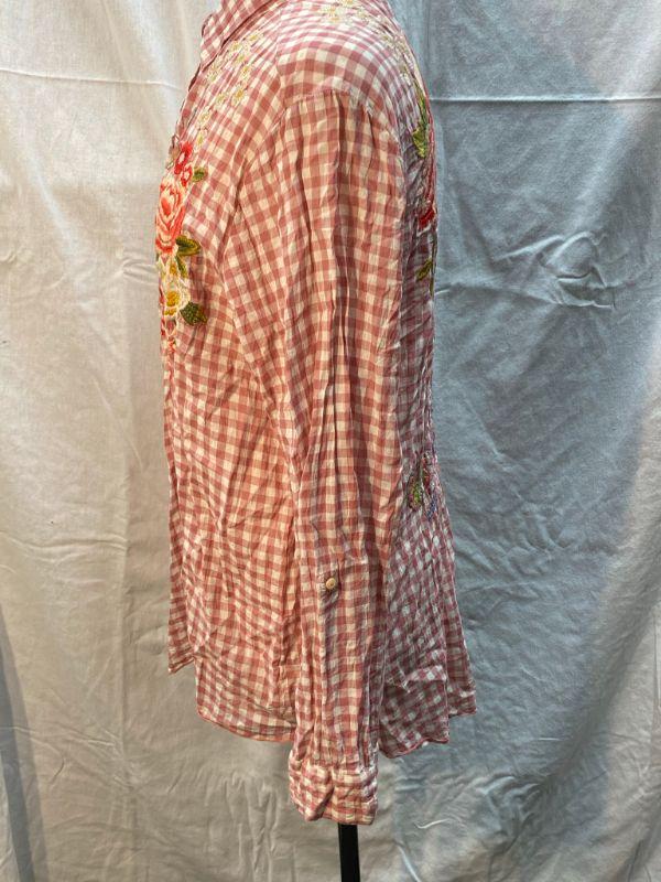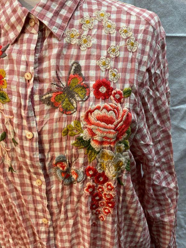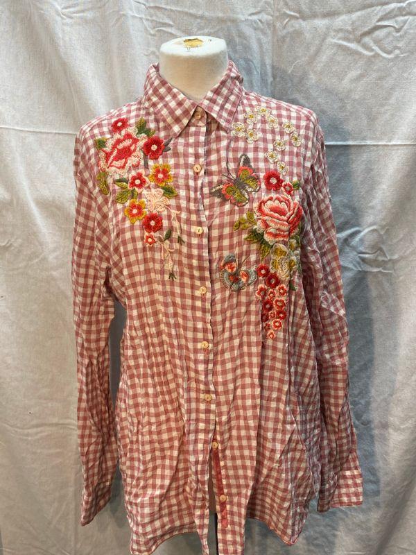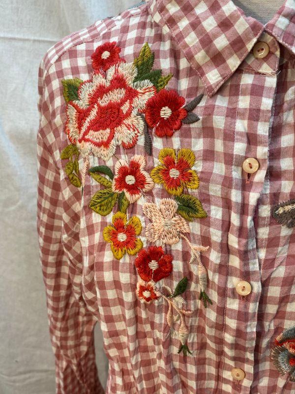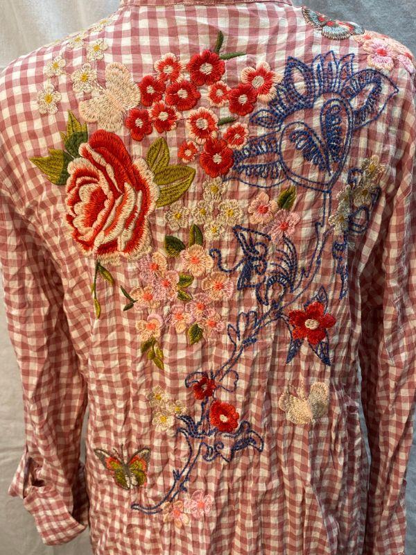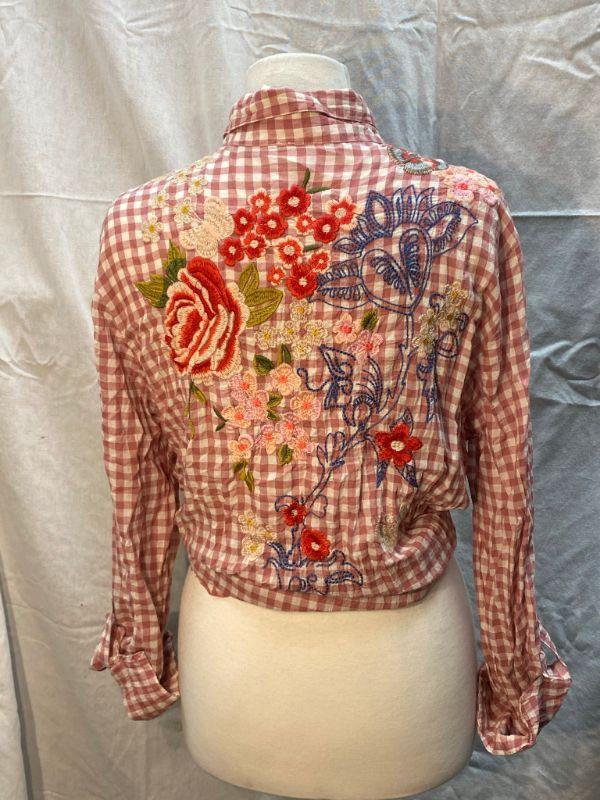 Cute floral embroidered gingham shirt. Button up front with roll up sleeves. Pale red/dark pink color. Colorful embroidered floral design on front and back. Tag was cut off, so brand and size unknown. Seems like a slim cut, medium/large size. Looks really cute tied at the waist.