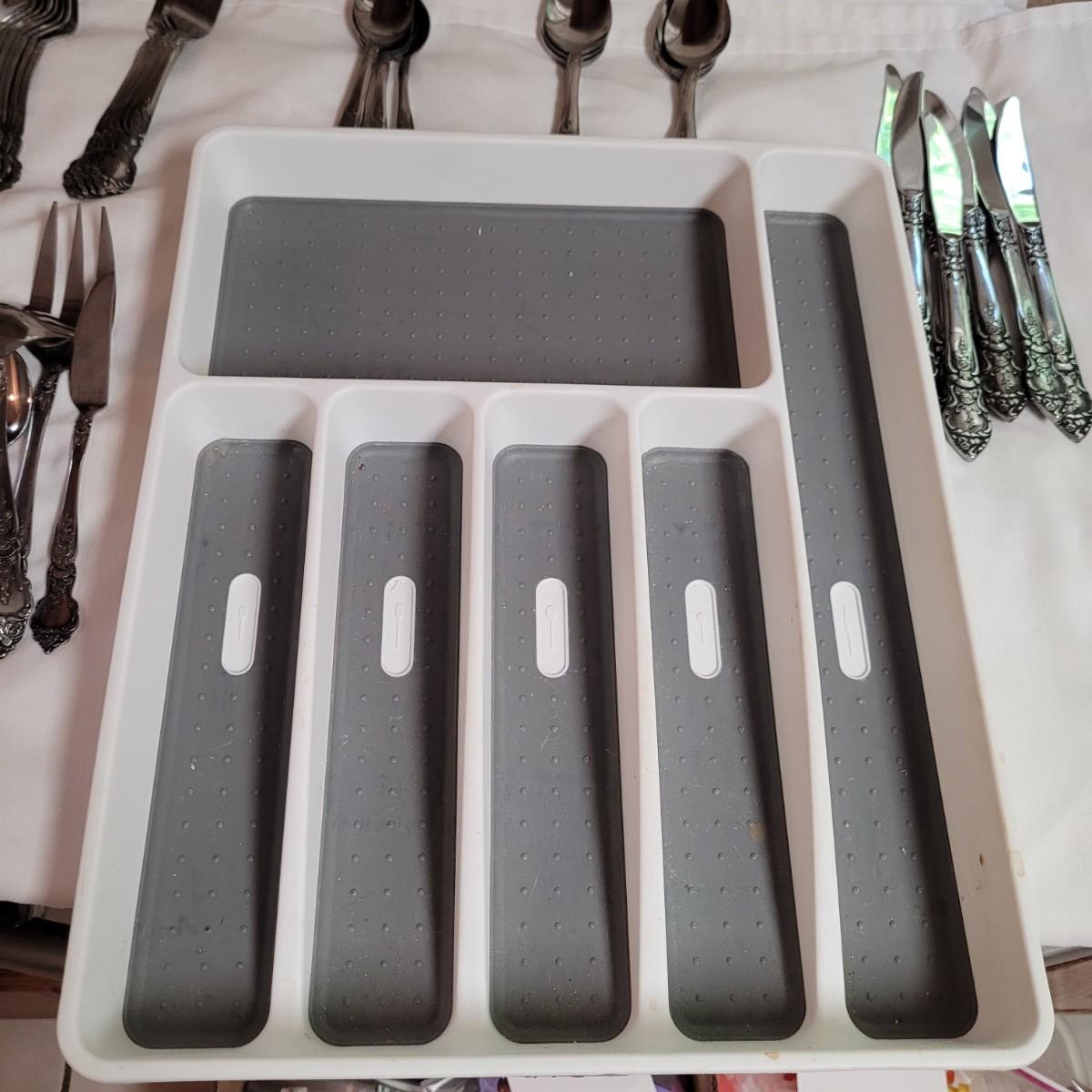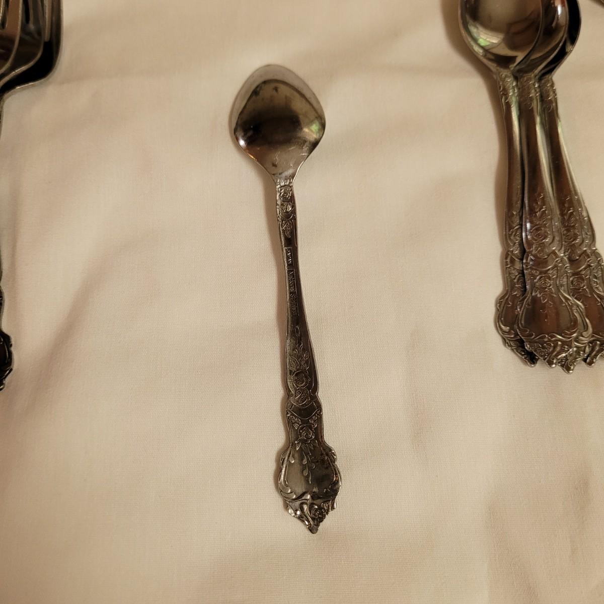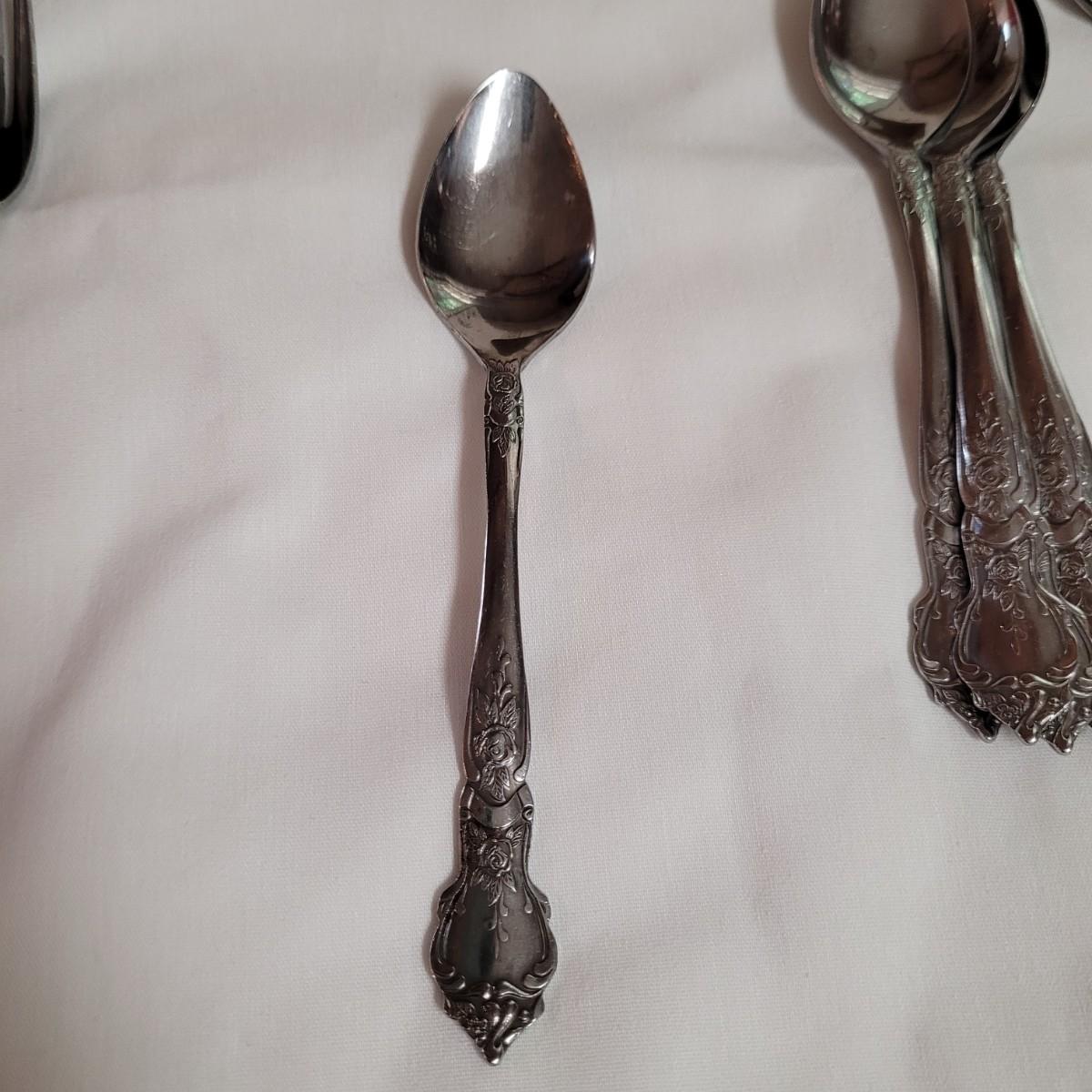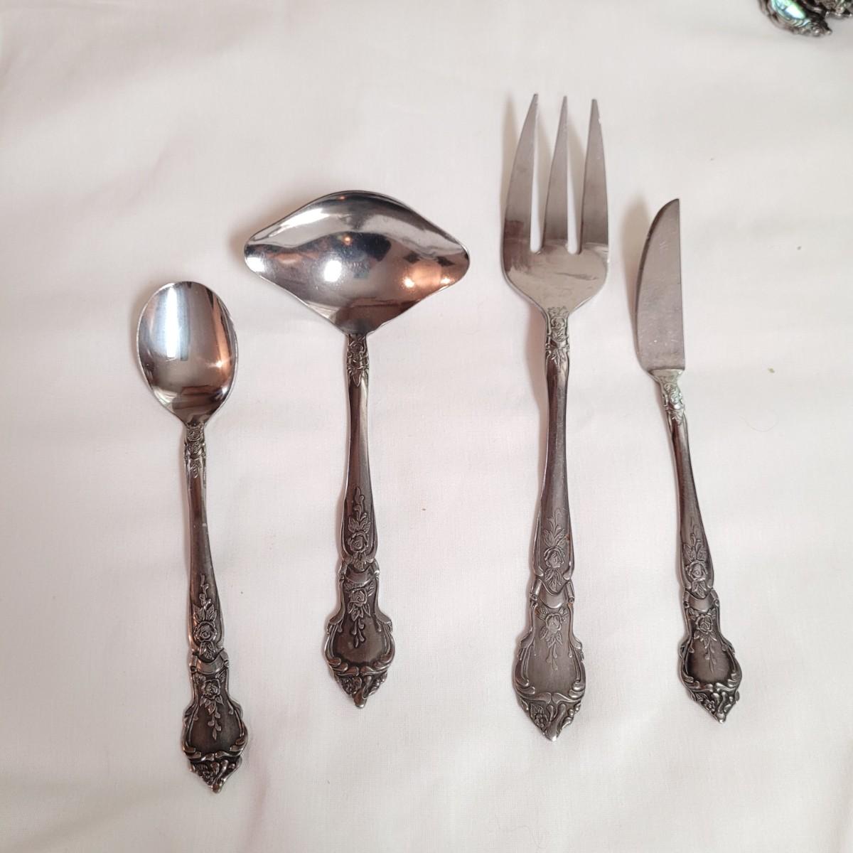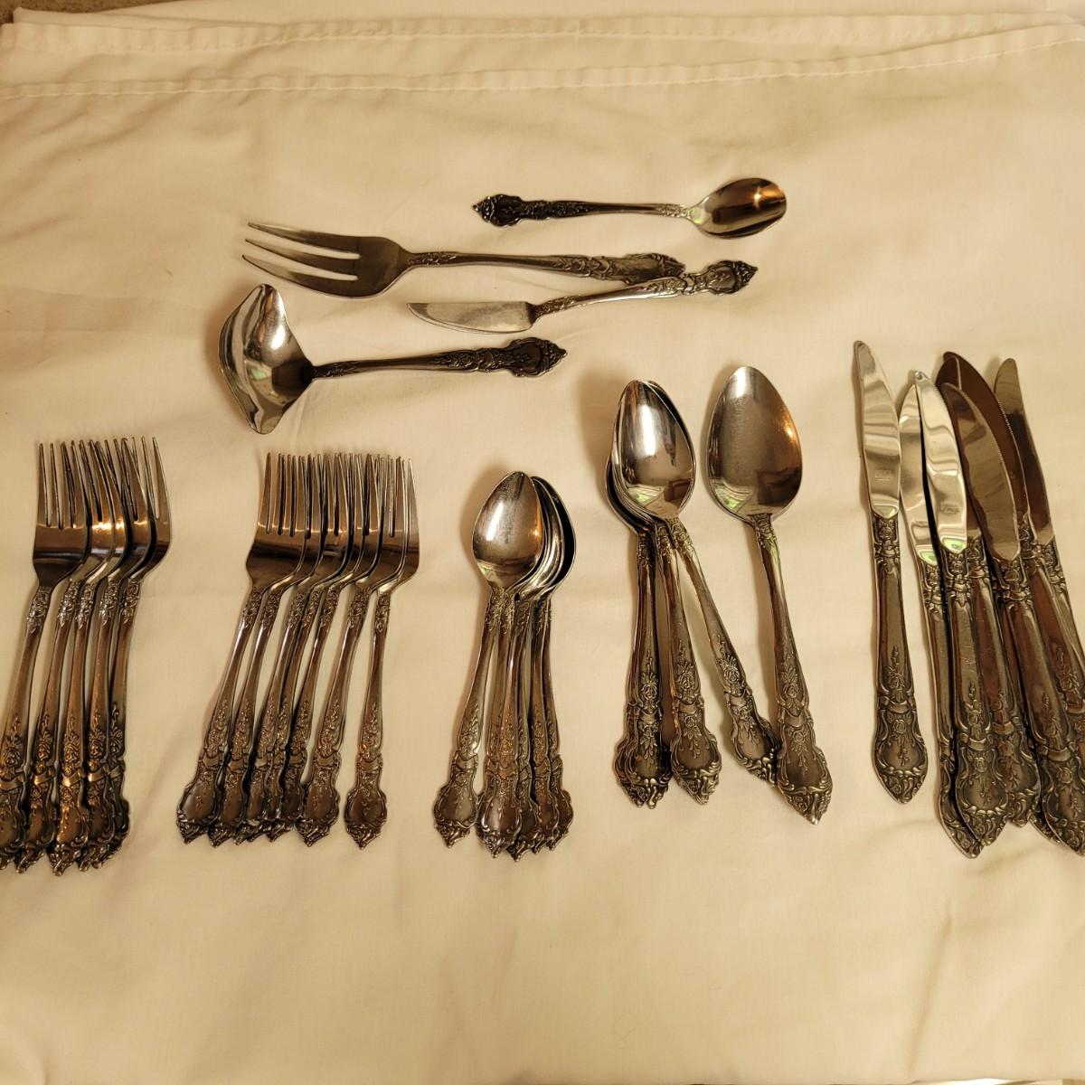 This incomplete set of stainless steel flatware includes eight small forks, five large forks, six small spoons, eight large spoons, eight butter knives, and a variety of large and small serving items. Shipping available.