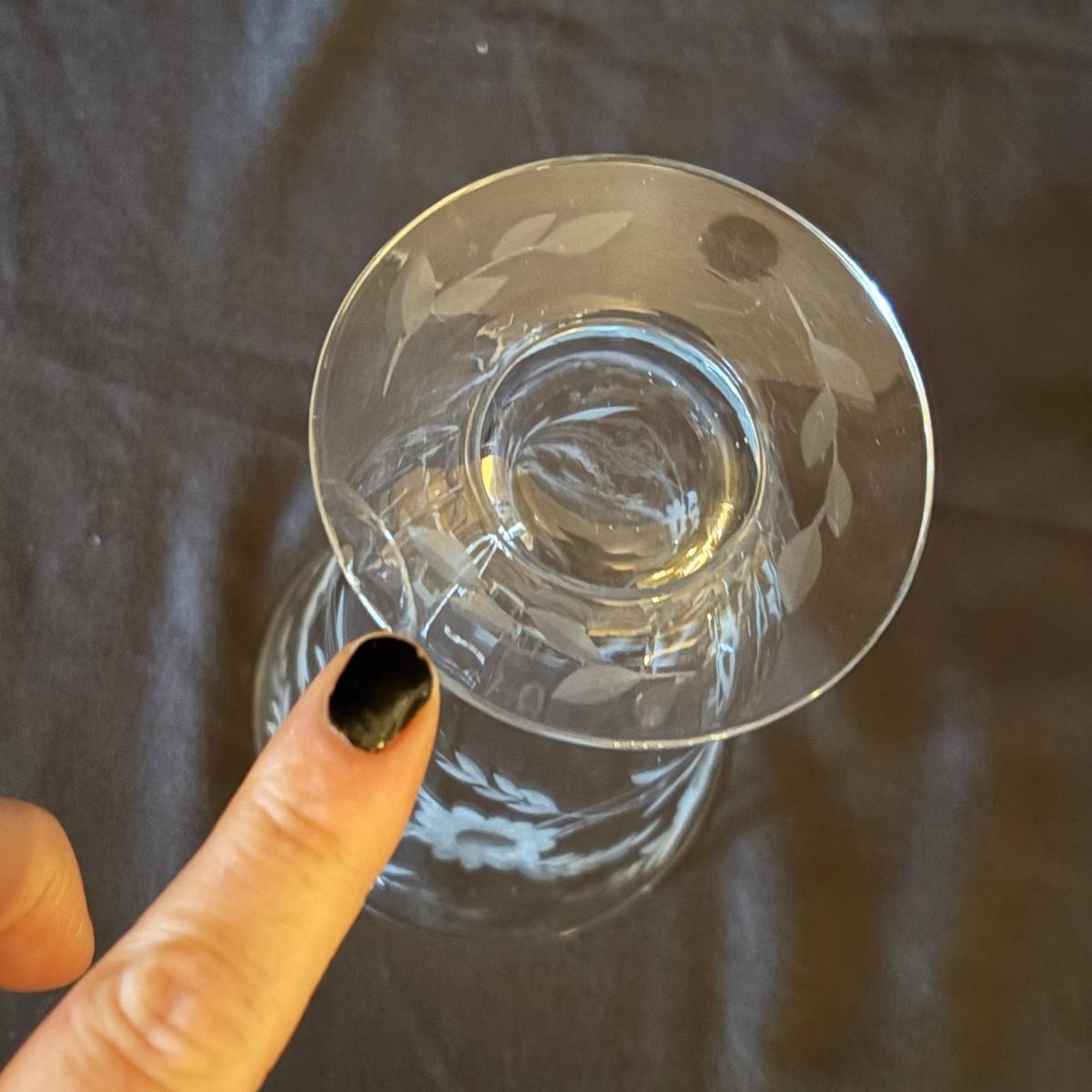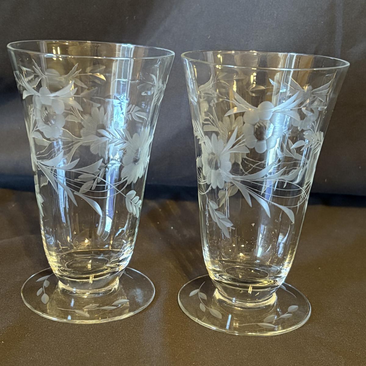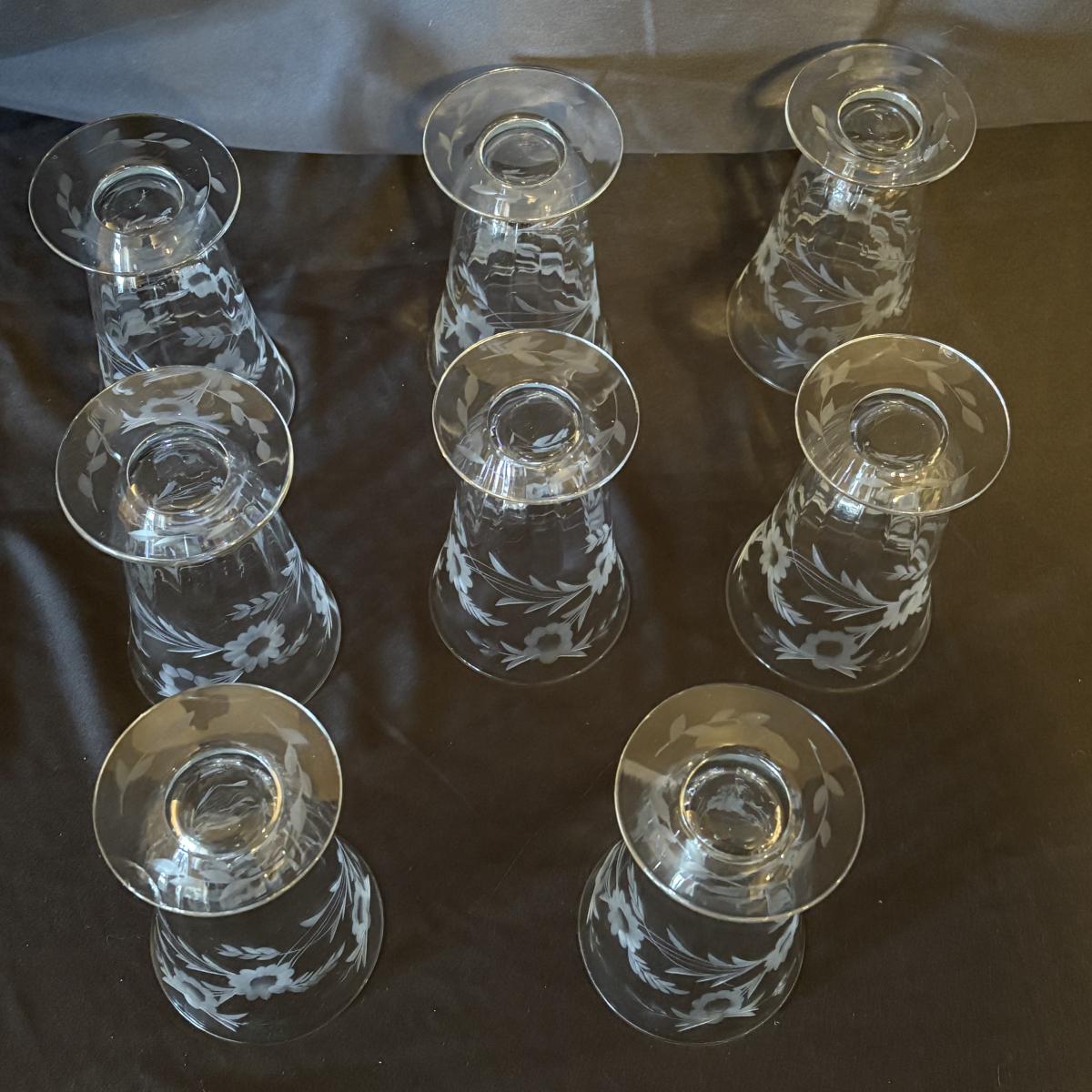 Eight floral etched footed glass tumblers with measurements of approximately 3.5"D x 5.25"H. Crack in bottom of one of the glasses, see pictures for reference.