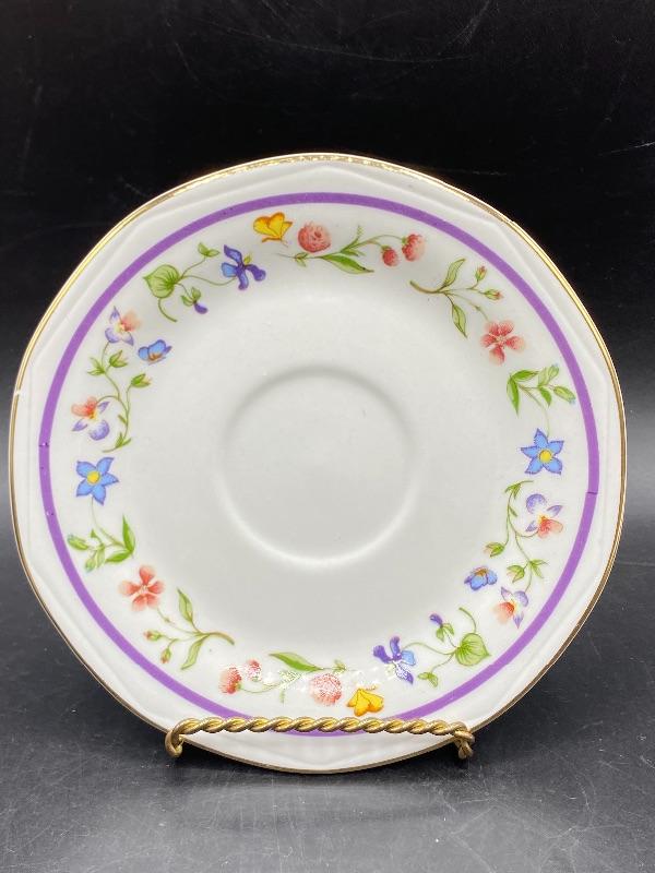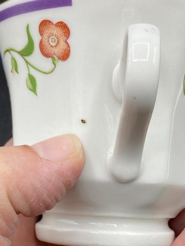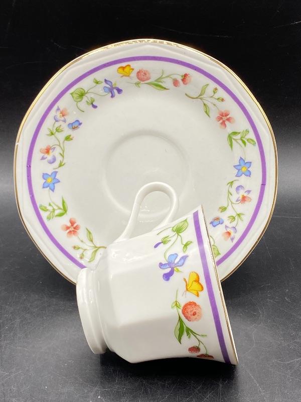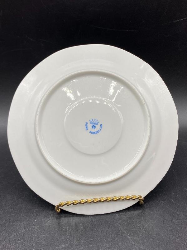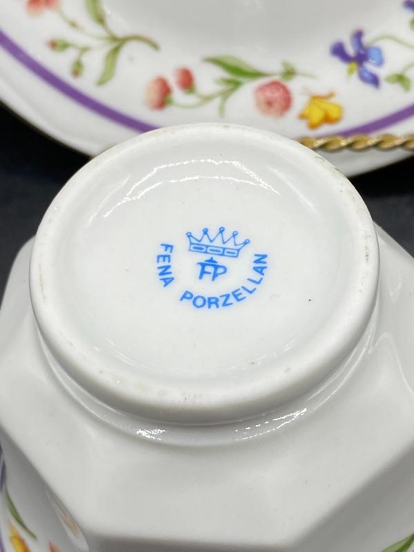 Floral pattern tea cup & saucer by Fena Porzellan. Good condition. Small black spot flaw in glaze. No chips.