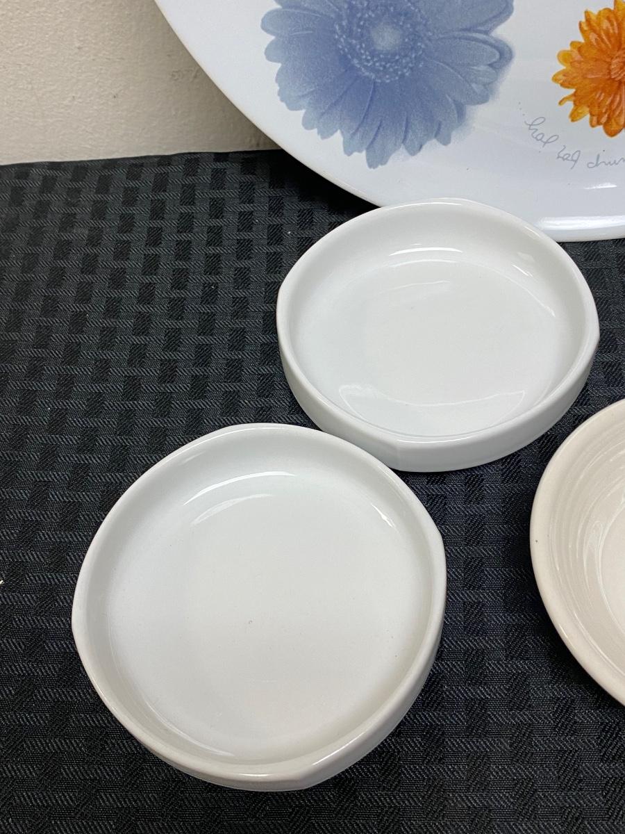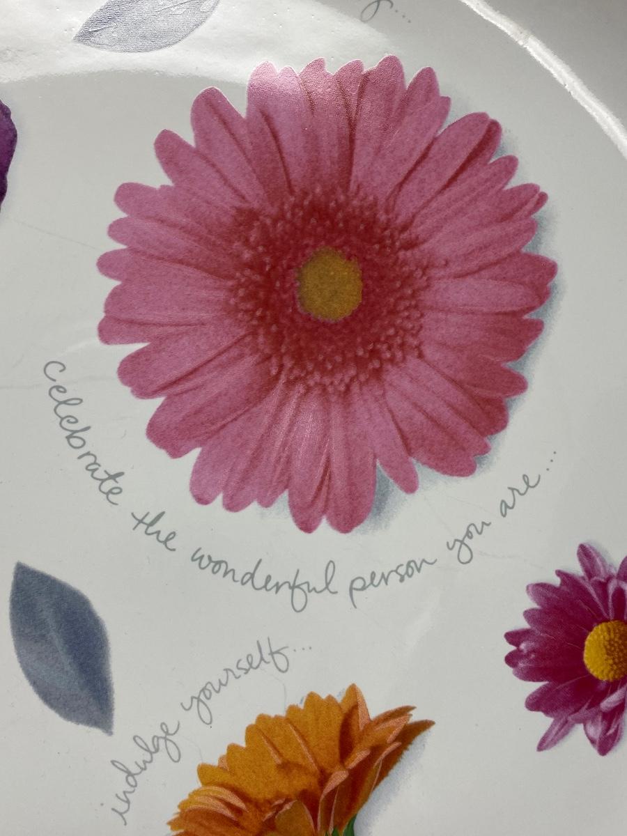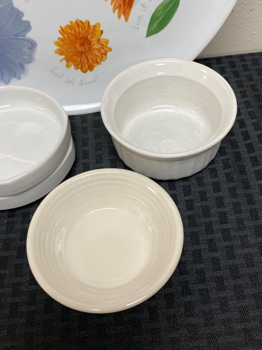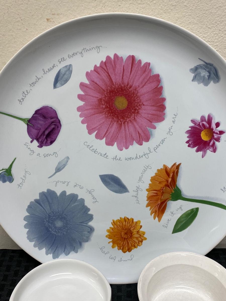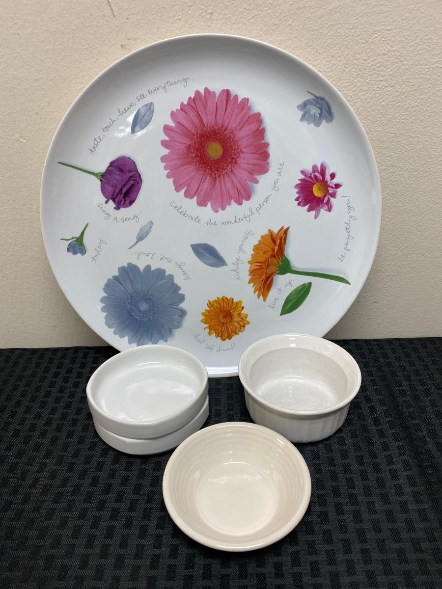 Floral friendship sharing plate and ramakin bowls. Plate has different phrases of praise on front and a sticker label on back with to/from writing area. Small various style bowls included. No chipped pieces.