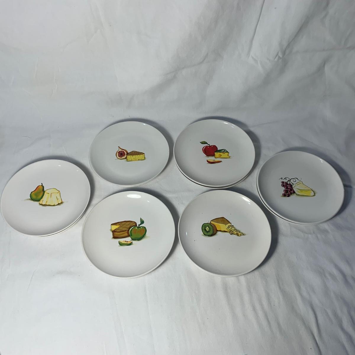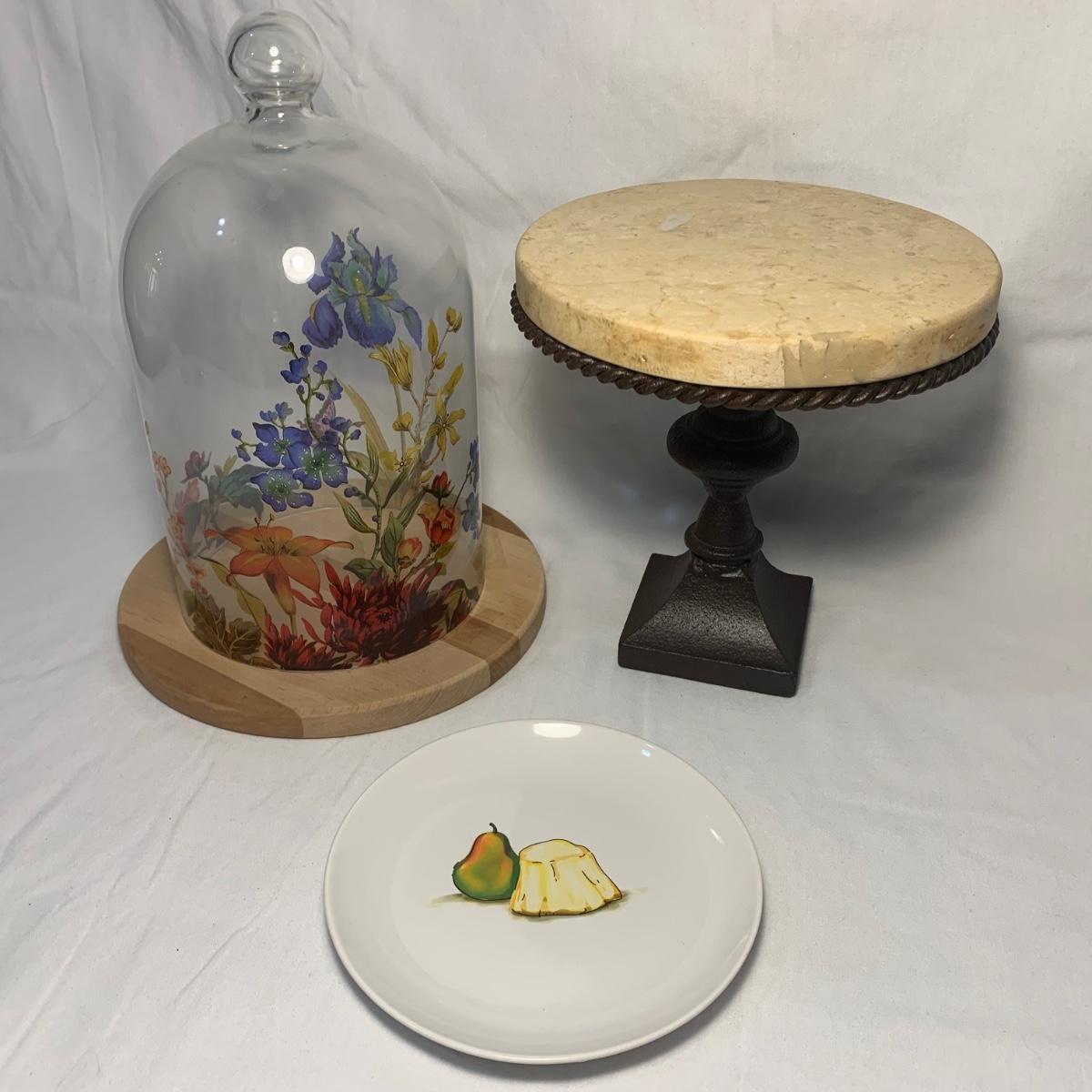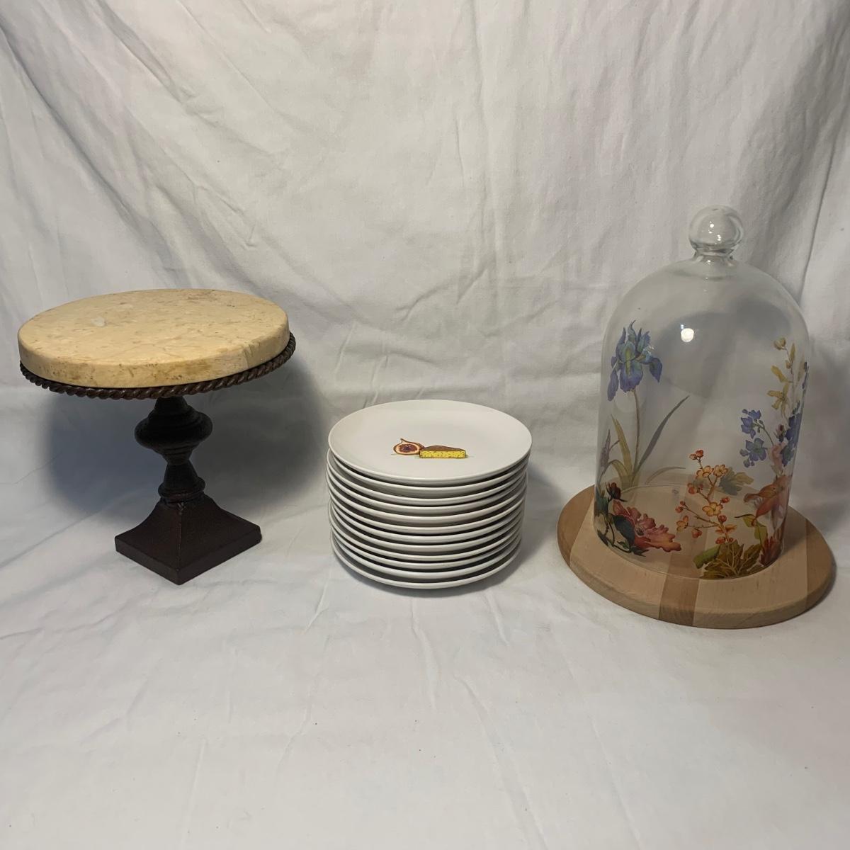 This lot includes a floral glass cloche bell with wooden base, twelve dishes, and a marble topped barista stand. The dishes feature fruit and cheese designs. This lovely combination has been gently used with minimal blemishes.