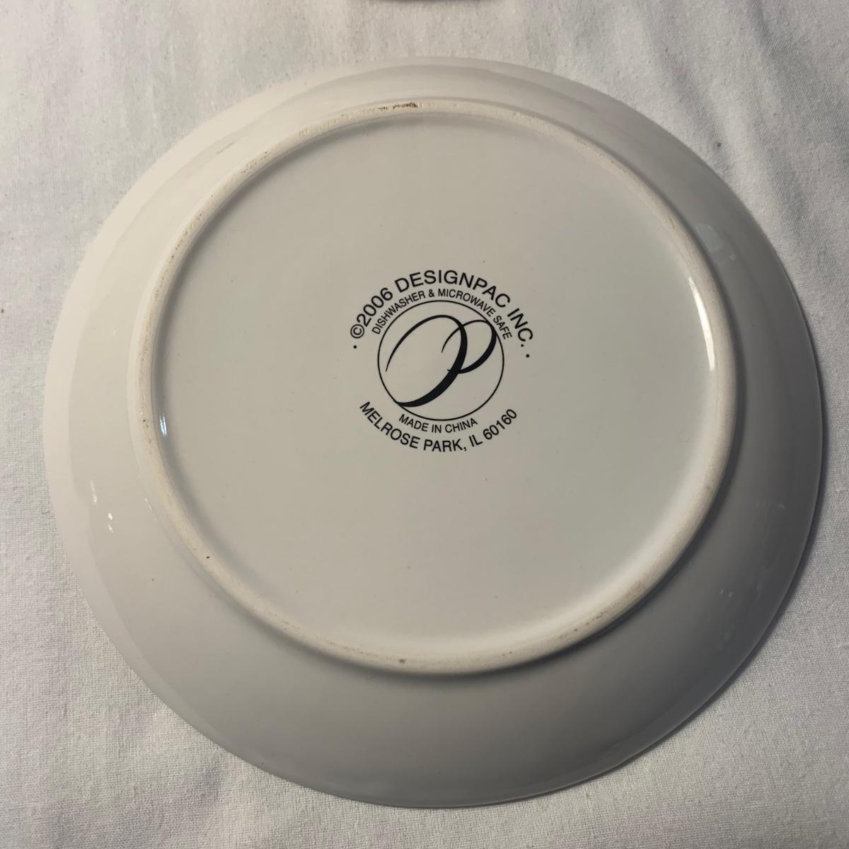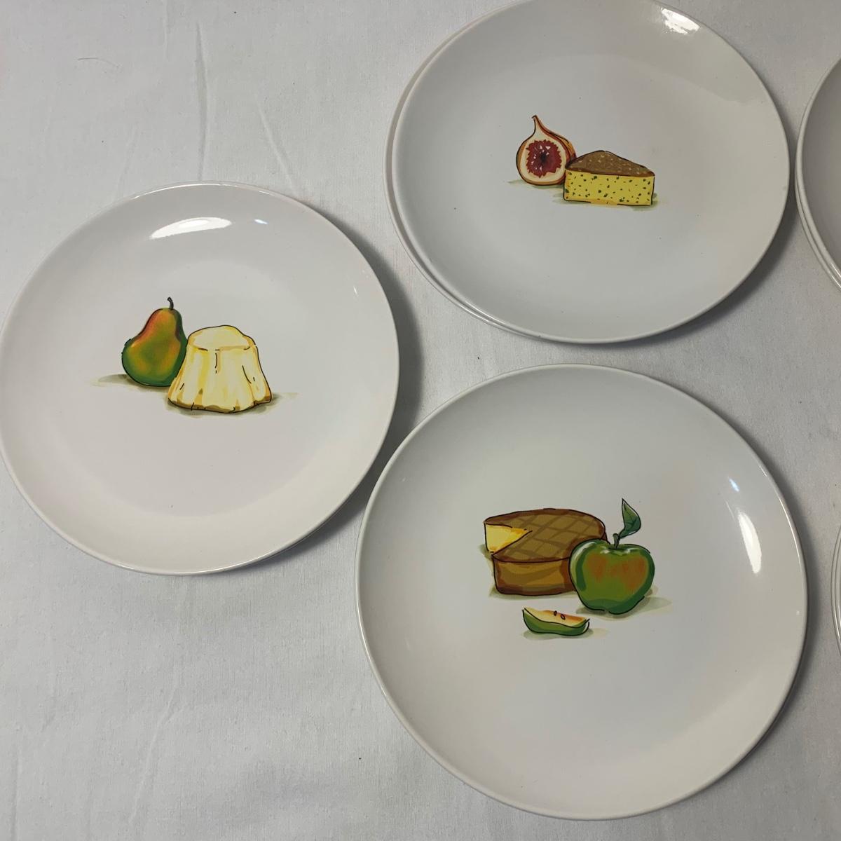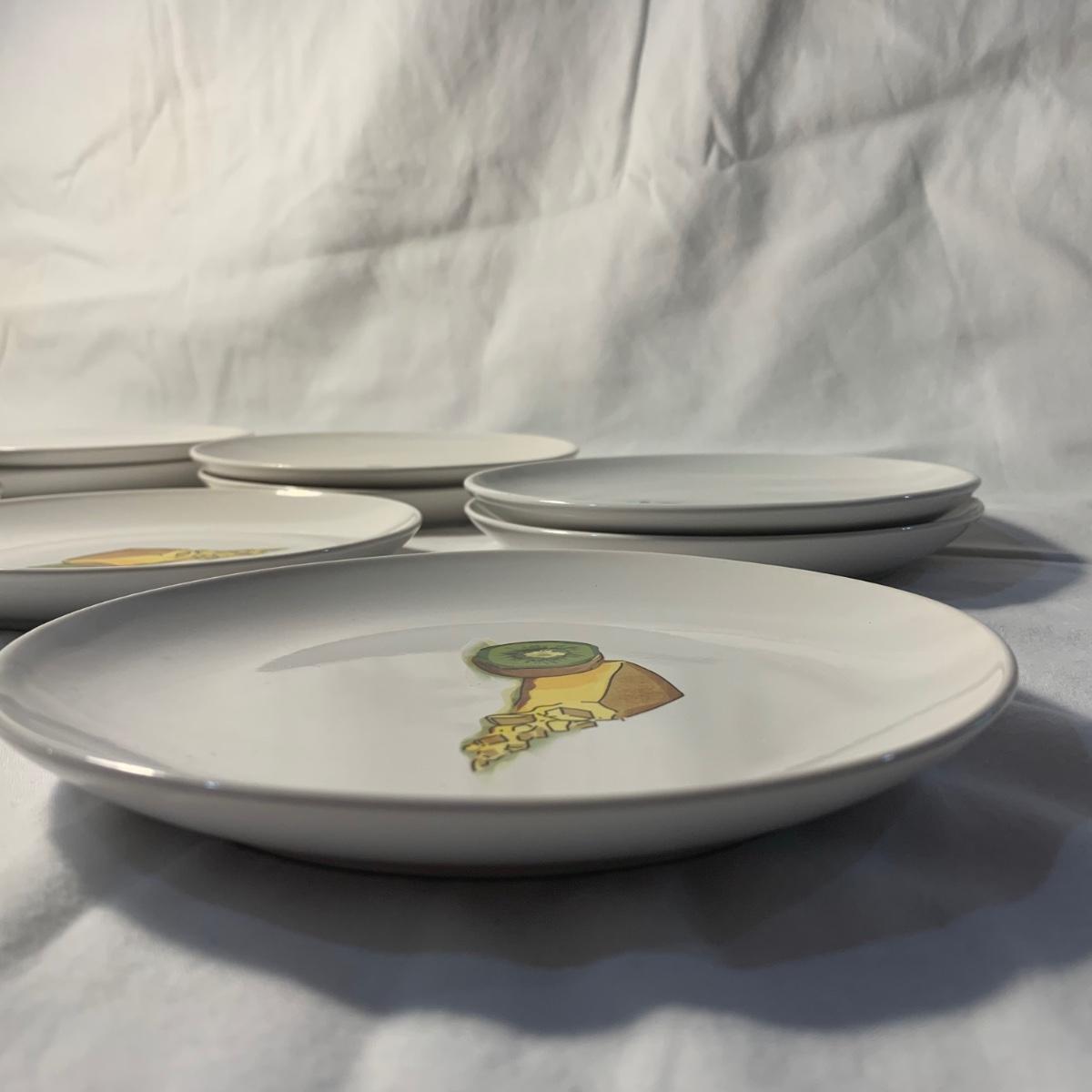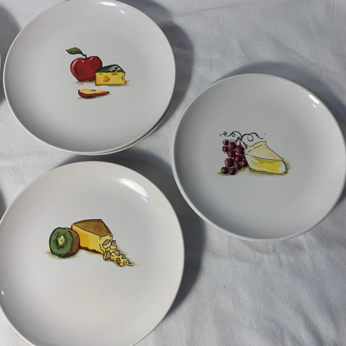 This lot includes a floral glass cloche bell with wooden base, twelve dishes, and a marble topped barista stand. The dishes feature fruit and cheese designs. This lovely combination has been gently used with minimal blemishes.