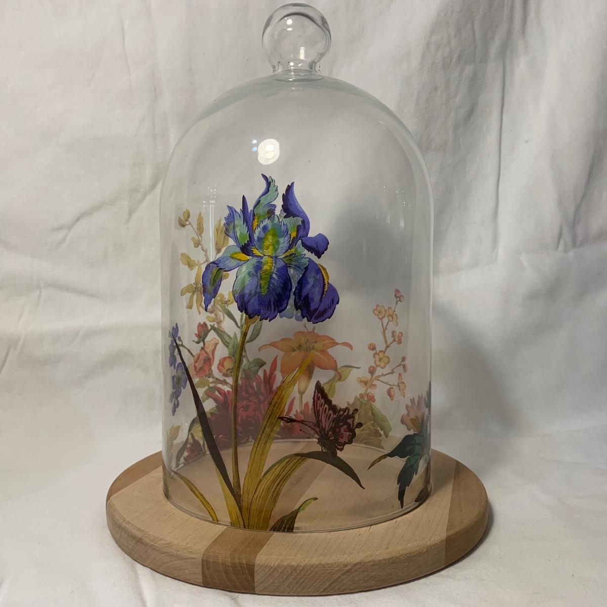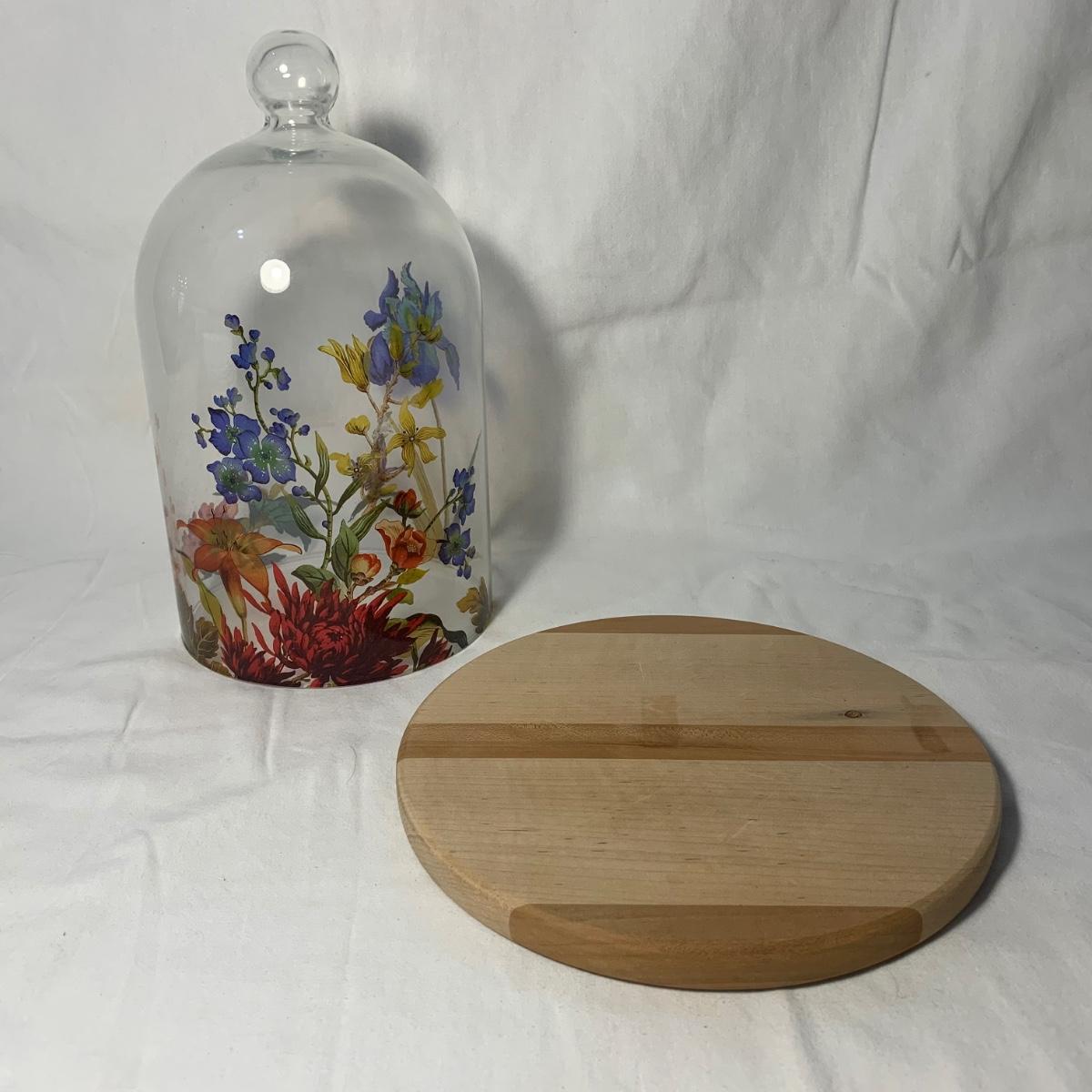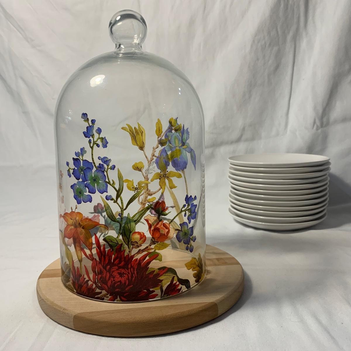 Floral Glass Cloche Bell with Wooden Base, Marble Barista Stand and Cheese Plates (K-KW)