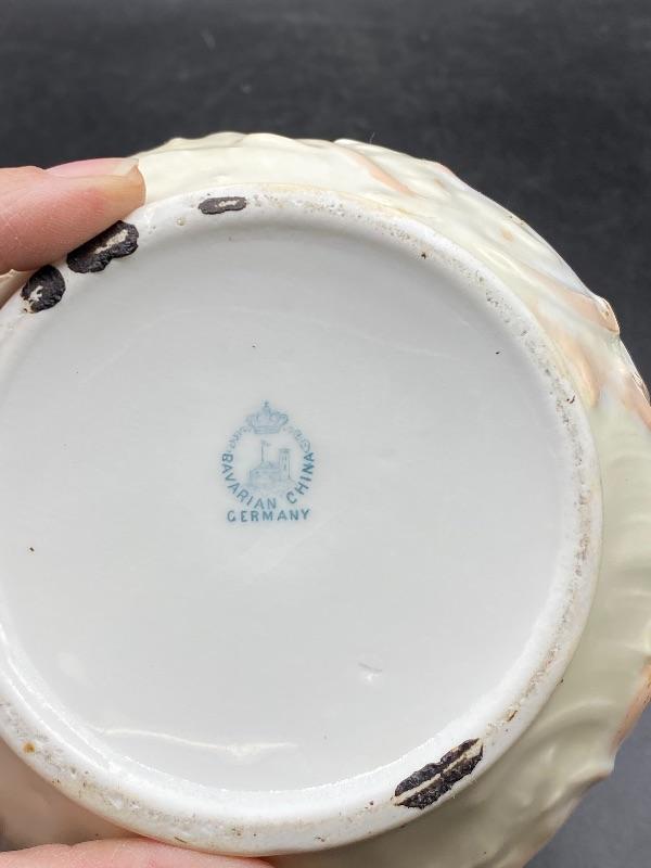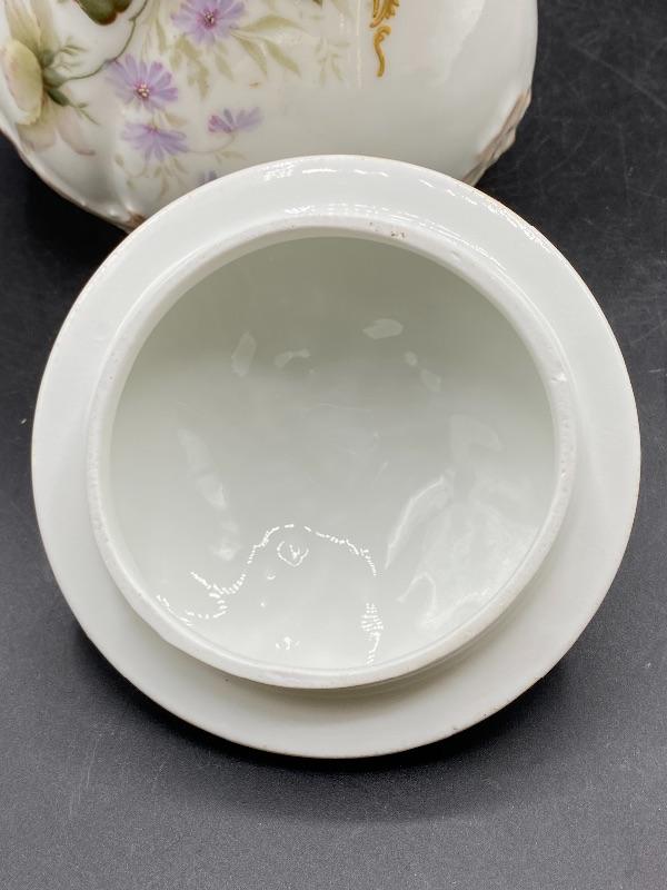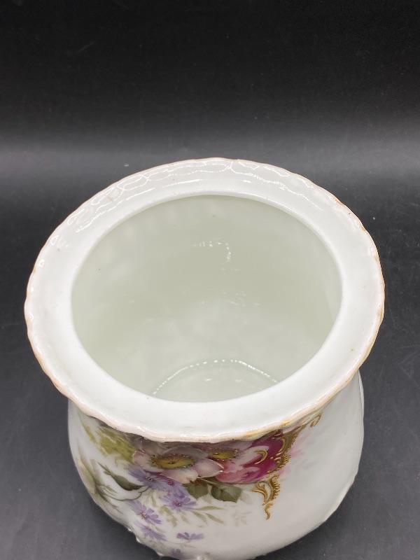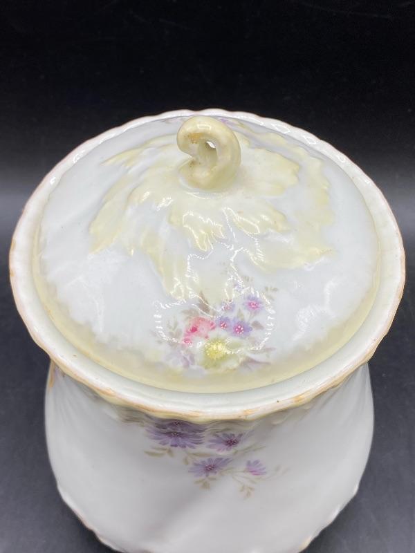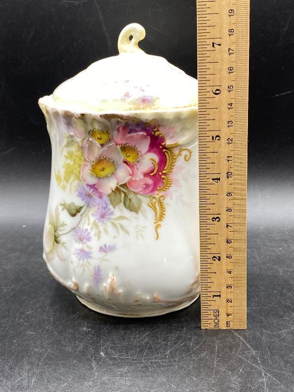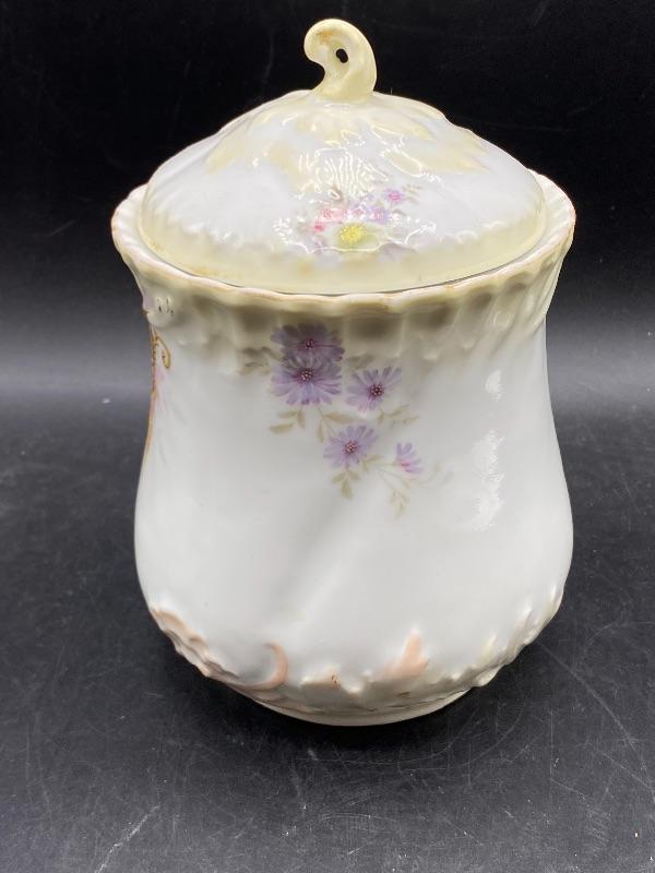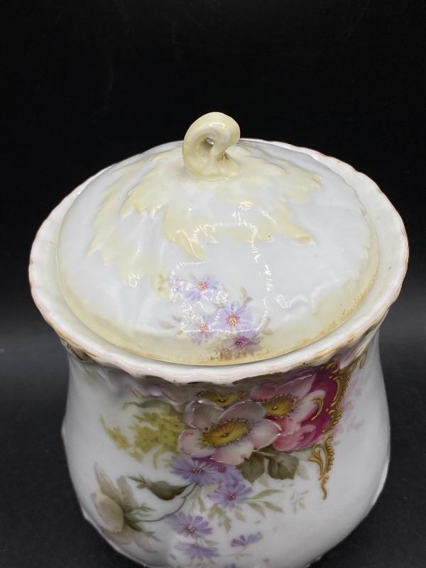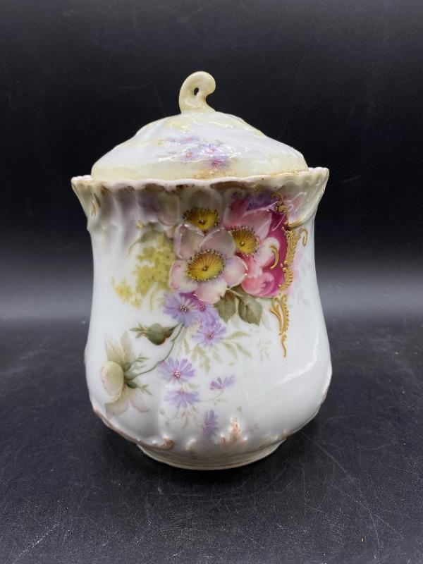 Beautiful vintage Bavarian china biscuit jar. Hand painted floral pattern. Lidded, about 7.5" size. Stamped on the bottom. Displays nicely. There is a small chip on the inside rim of lid, not noticeable unless you take the lid off and look.