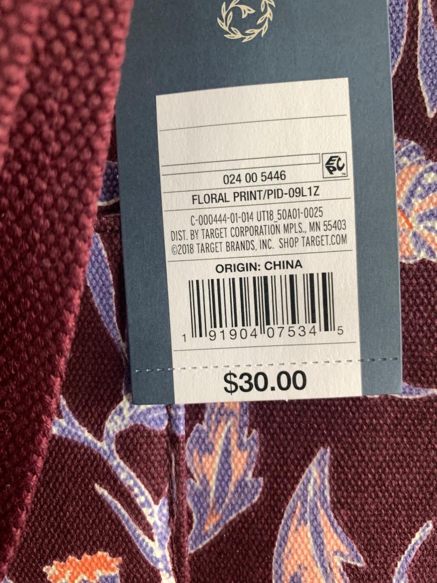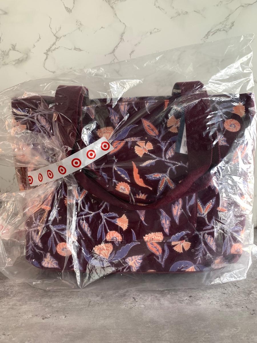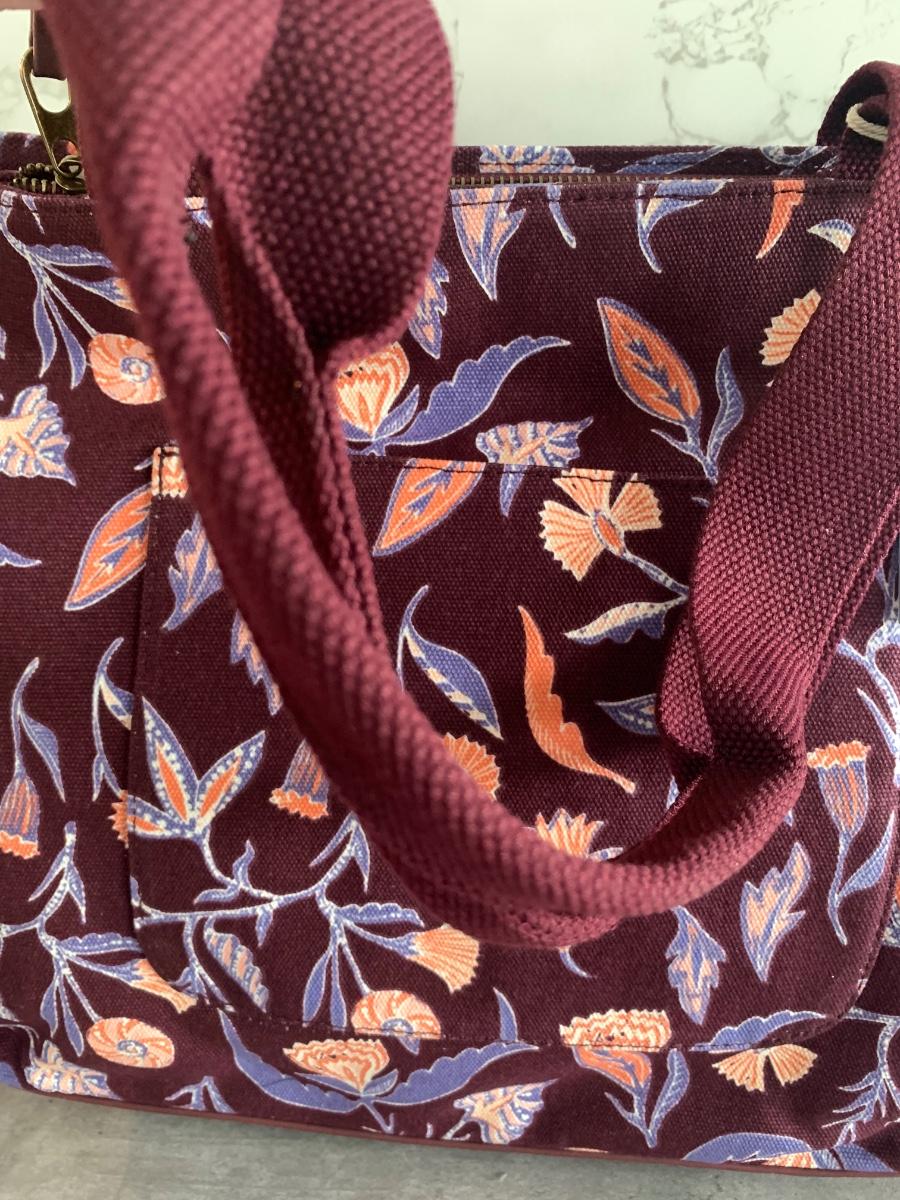 Universal Threads burgundy, with purple and pink floral two strap tote bag. On the front of the bag, there is a pouch pocket. There is a zipper across the top for closure. Inside the bag, there is a burgundy lining, with a zipper pocket against the back wall. Against the front wall, there are two pouch pockets.