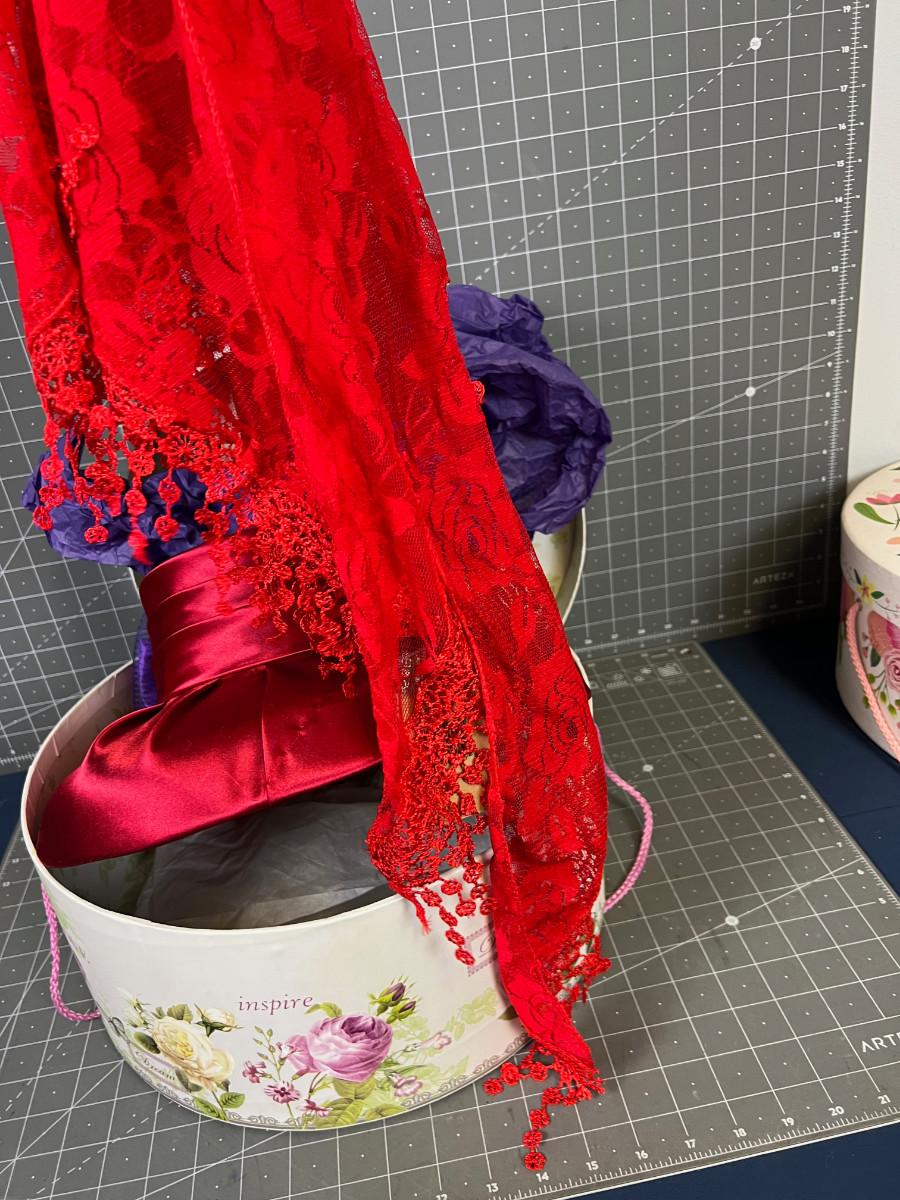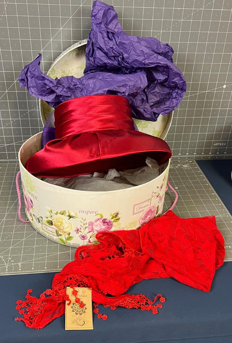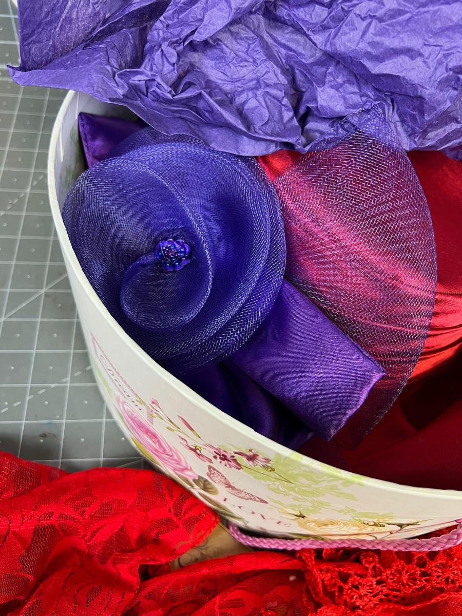 Floral Hat Boxes with Satin Red Hat & Purple Bow and Scarf
