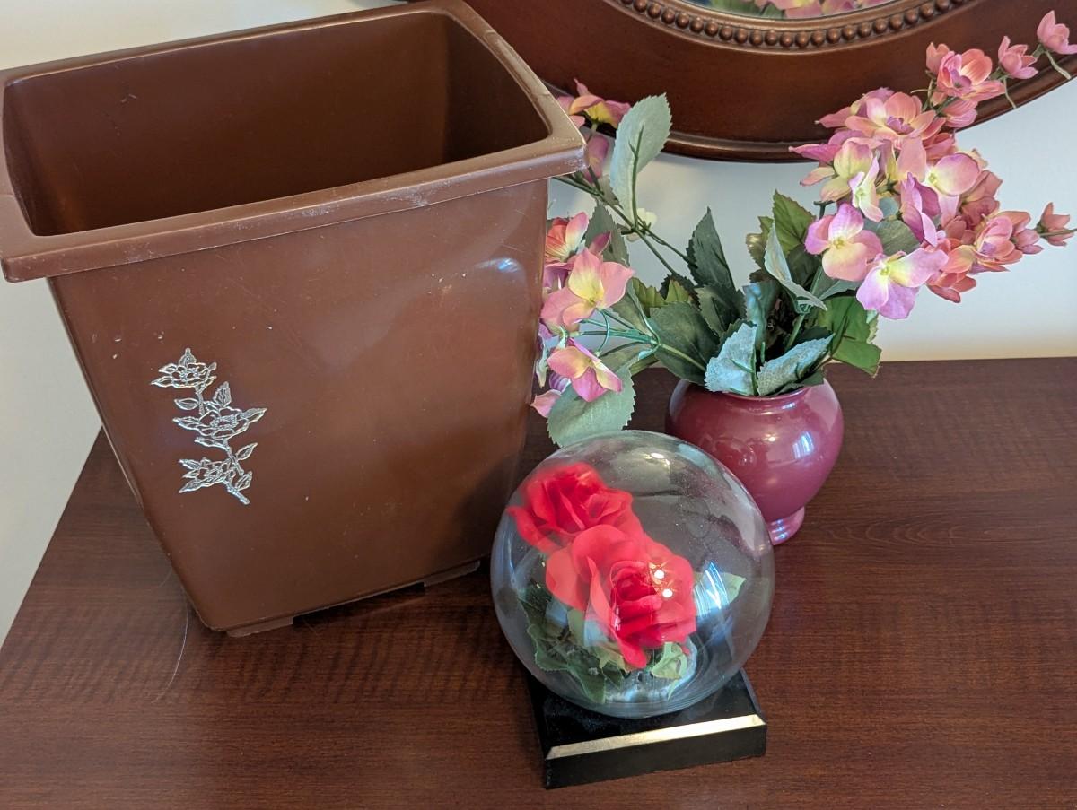 Vintage Bowl-O-Beauty Real Roses Glass Snow Globe Melrose Park & Vintage Flower Waste Basket