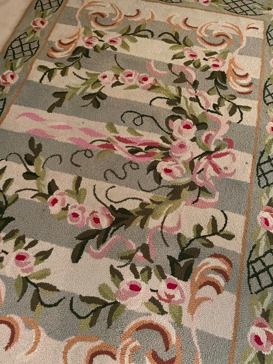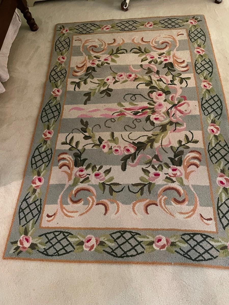 Pink and Green Floral Hooked Floor Rug. 4' x 6'
