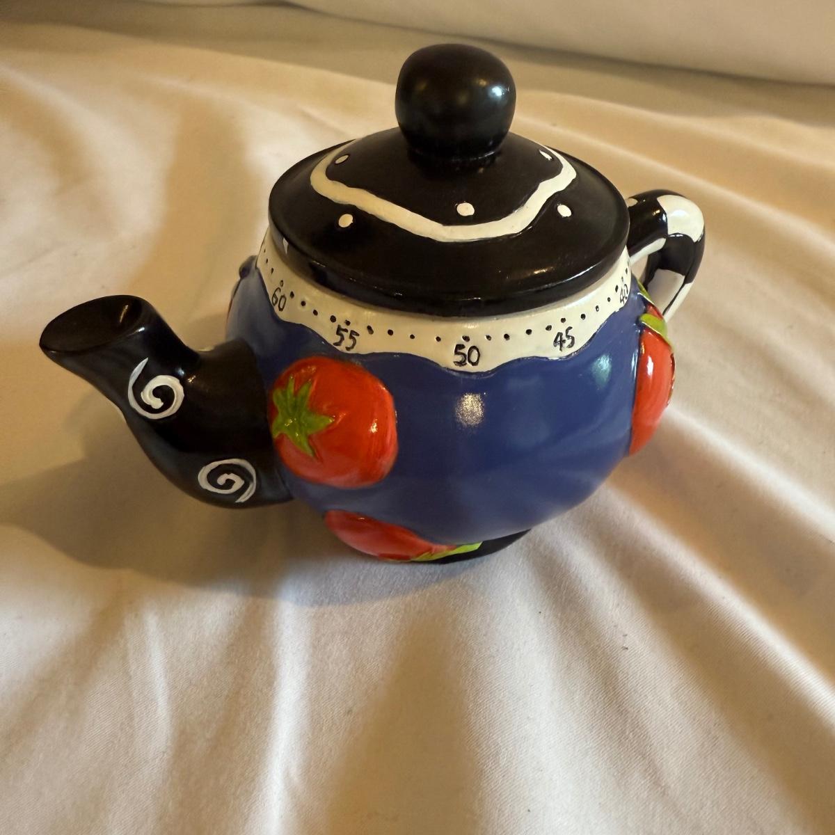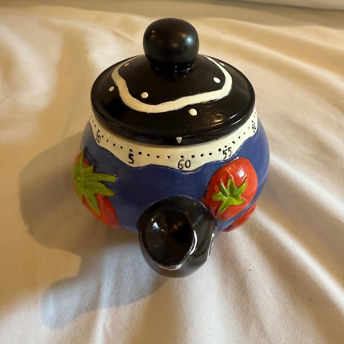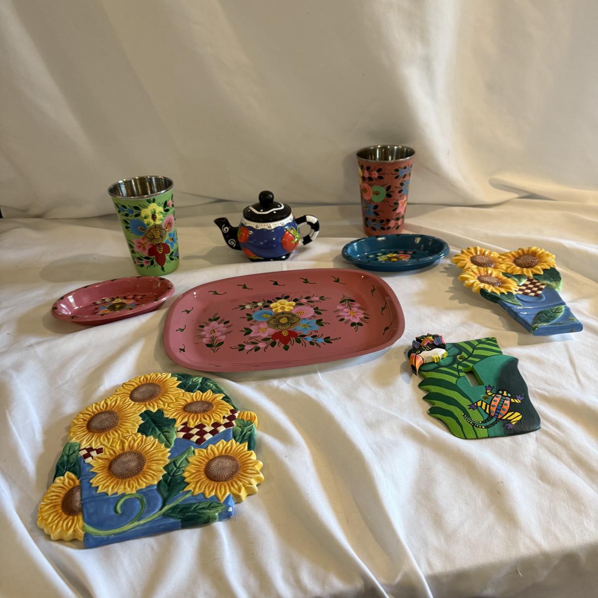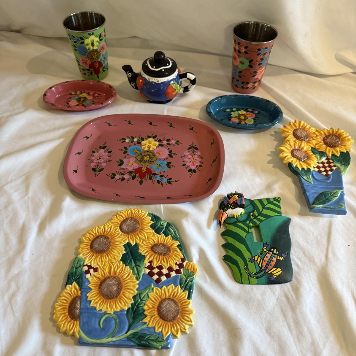 In this lot we have nine bright, mostly floral kitchen items. First we have a strawberry covered teapot kitchen timer. This fun little guy times up to an hour and measures 6” from spout to handle and stands 4”H. Next we have a small set of bright floral metal dishes. Included is two cups, two ramekins and one plate, some are different colors but all have the same floral style on them. The cups have a 3”D mouth and stand 4.5”H. There is a small chip in the paint of the green one. Next we have a sunflower spoon rest and a matching sunflower potholder. The pot holder measures 6.5” x 7.5”. Last is a super fun and bright light switch cover featuring a gecko and toucan. Shipping available.