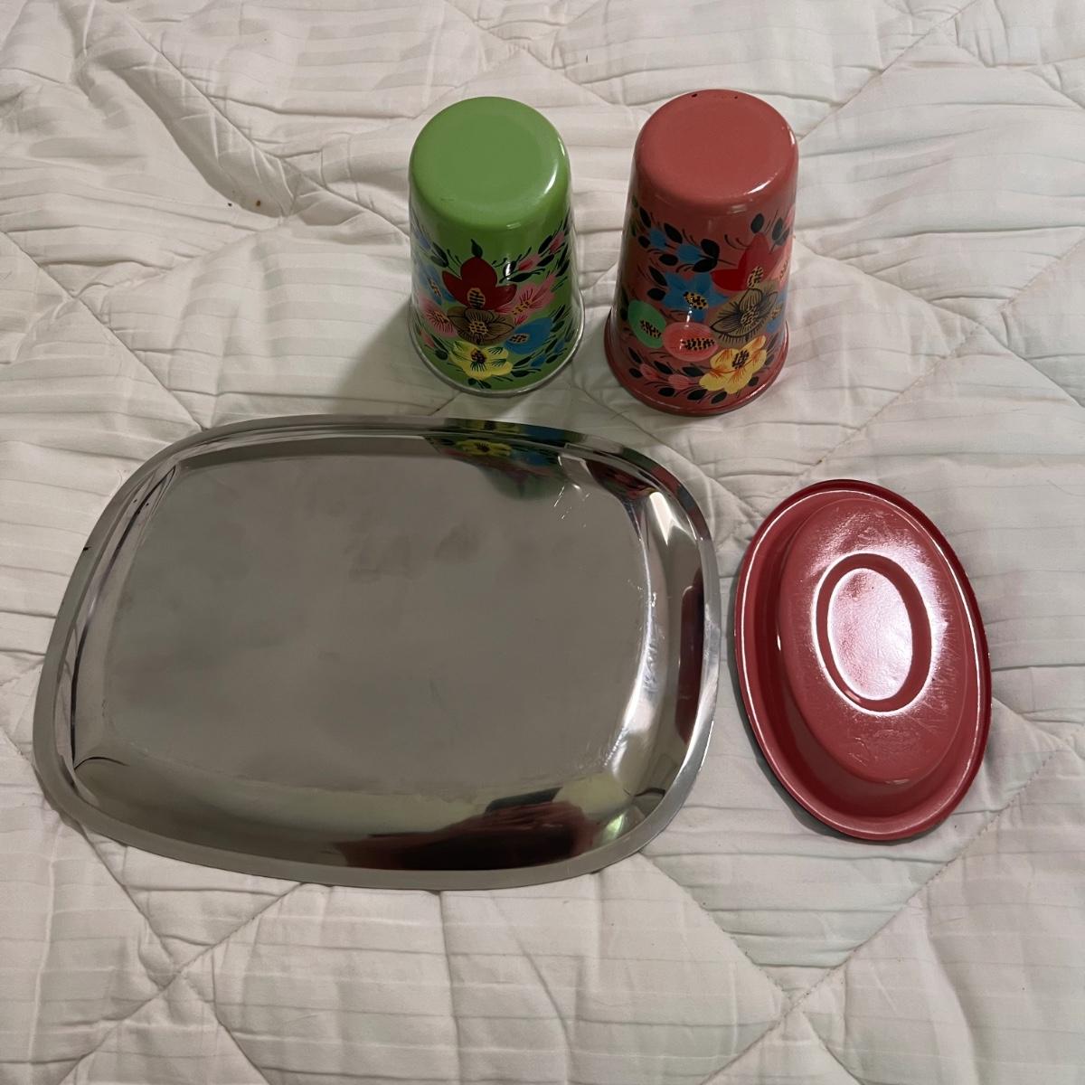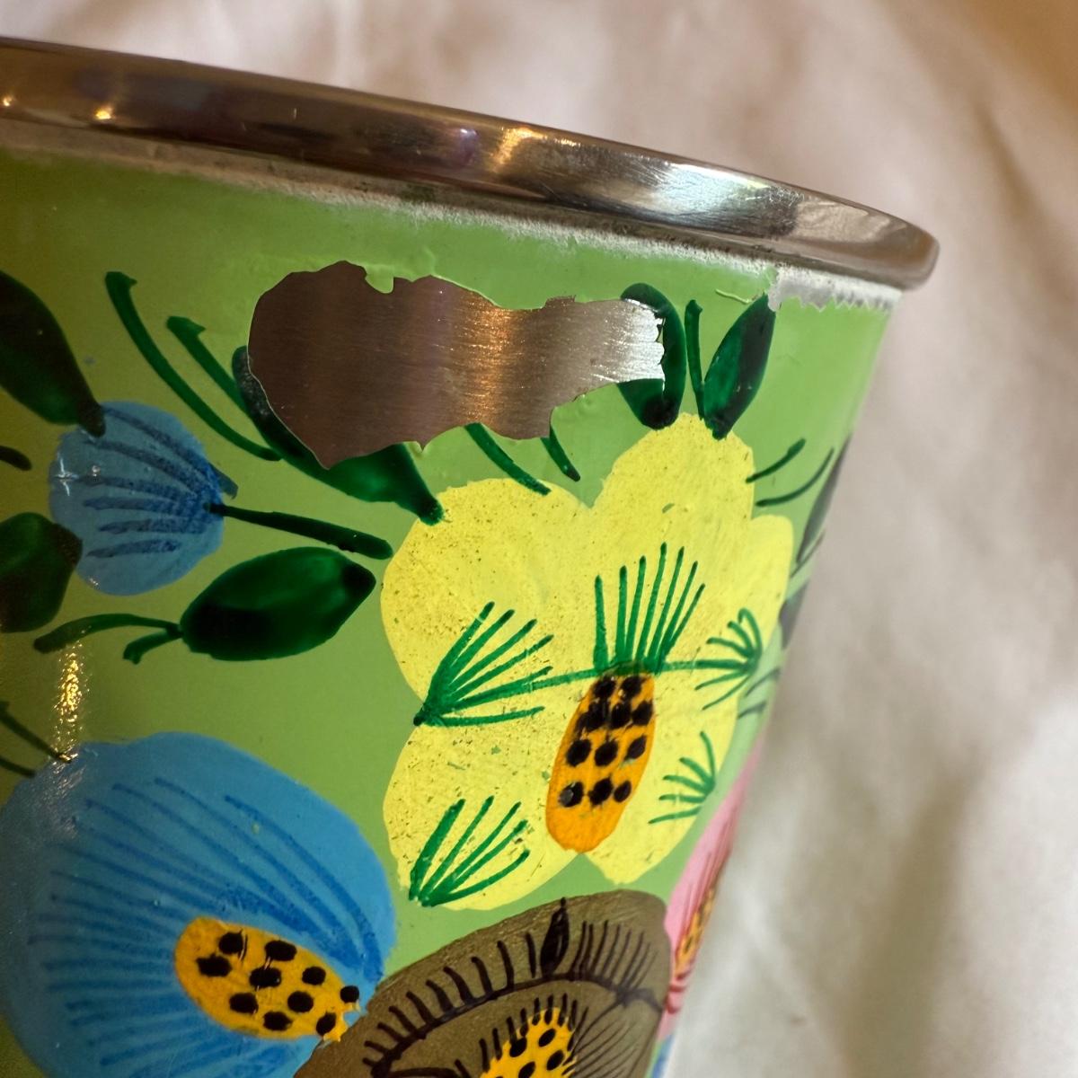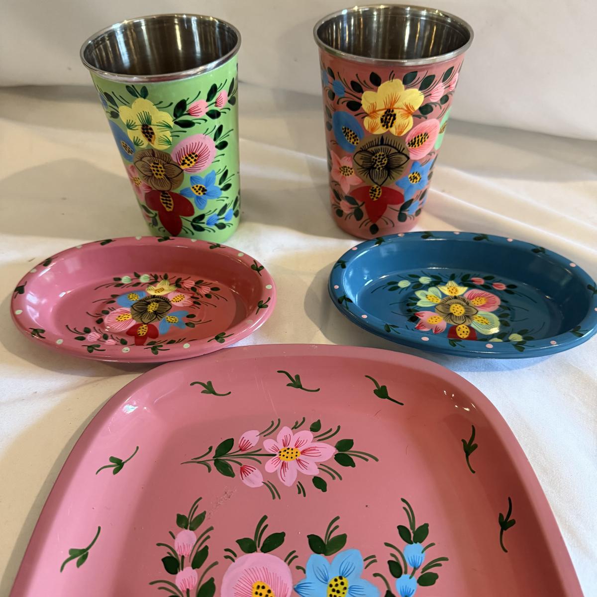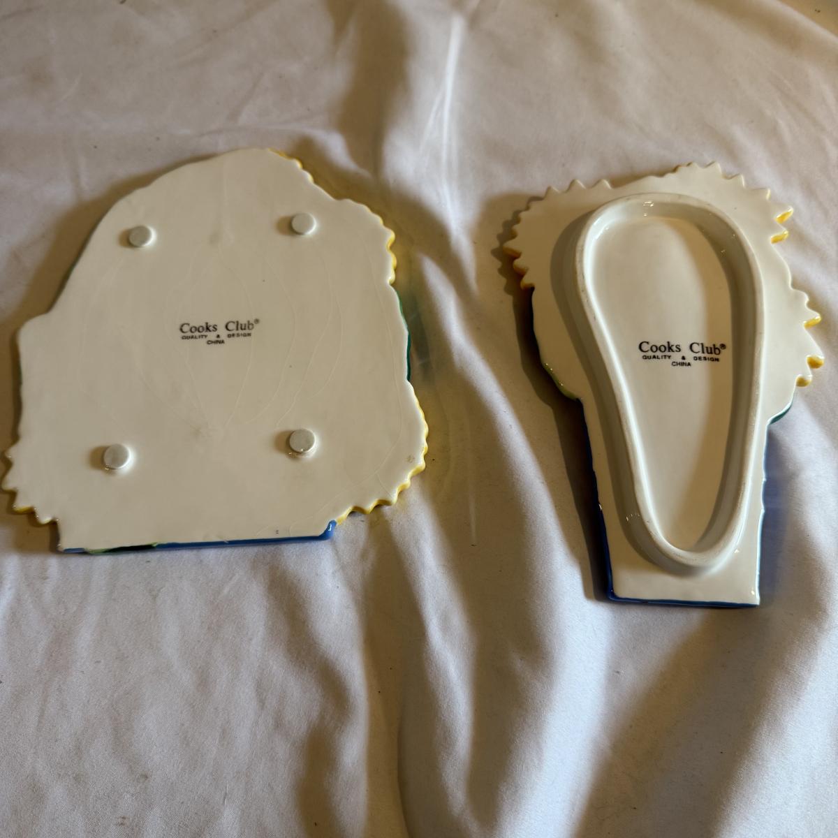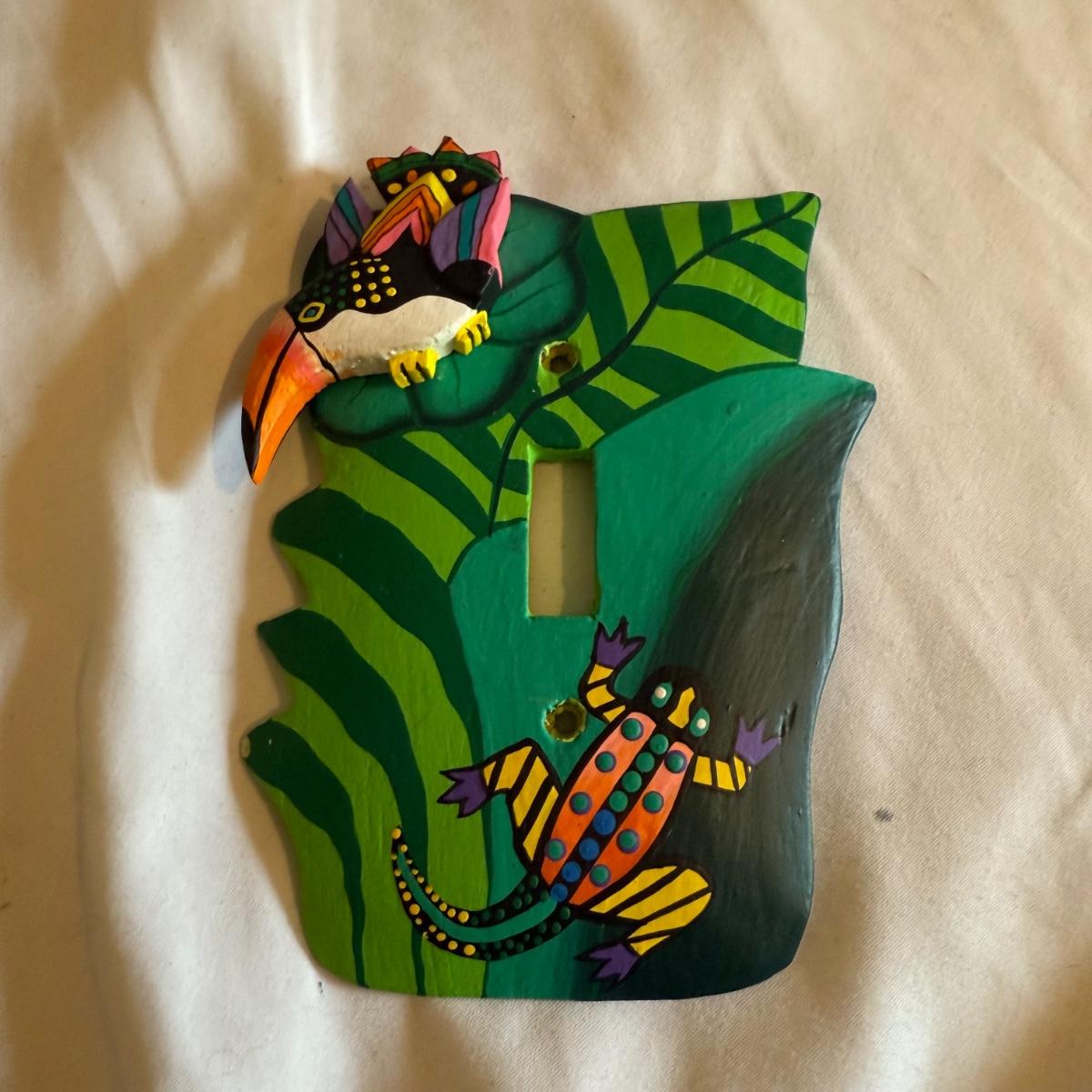 In this lot we have nine bright, mostly floral kitchen items. First we have a strawberry covered teapot kitchen timer. This fun little guy times up to an hour and measures 6” from spout to handle and stands 4”H. Next we have a small set of bright floral metal dishes. Included is two cups, two ramekins and one plate, some are different colors but all have the same floral style on them. The cups have a 3”D mouth and stand 4.5”H. There is a small chip in the paint of the green one. Next we have a sunflower spoon rest and a matching sunflower potholder. The pot holder measures 6.5” x 7.5”. Last is a super fun and bright light switch cover featuring a gecko and toucan. Shipping available.
