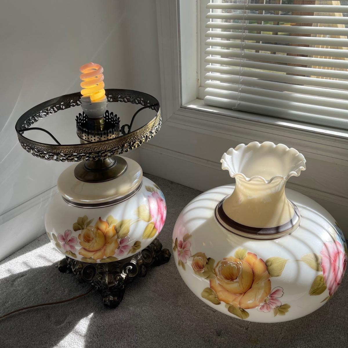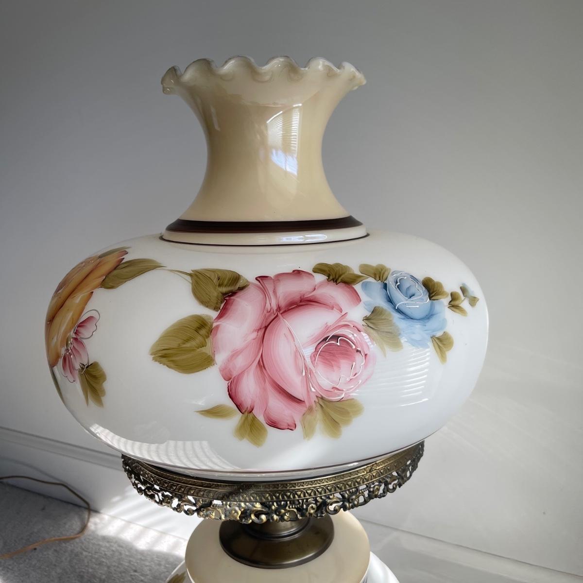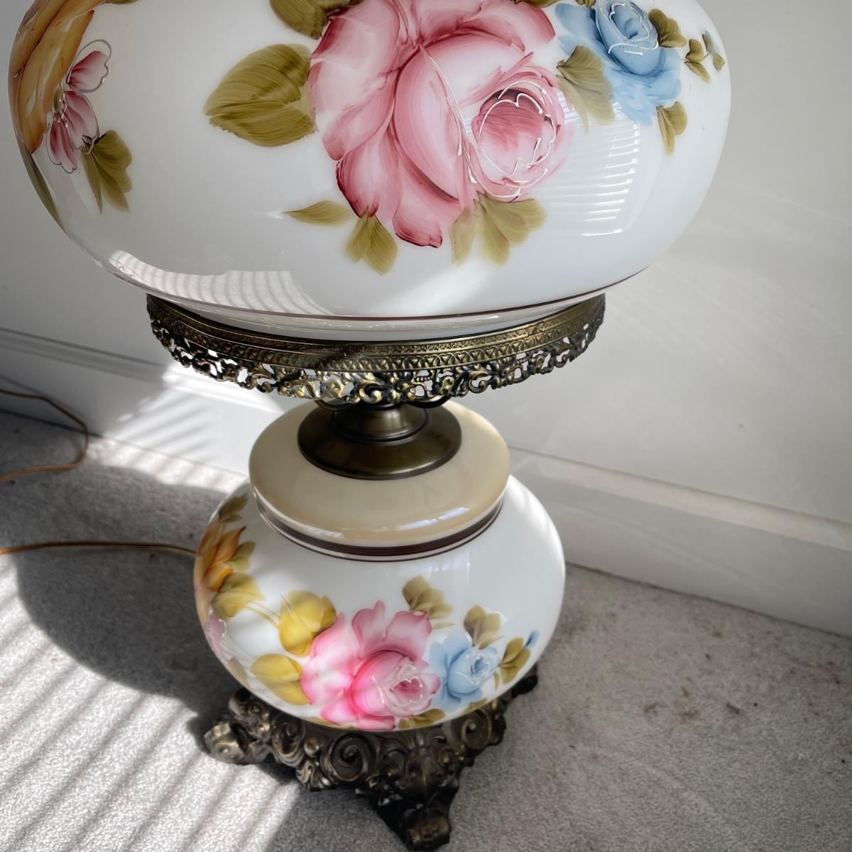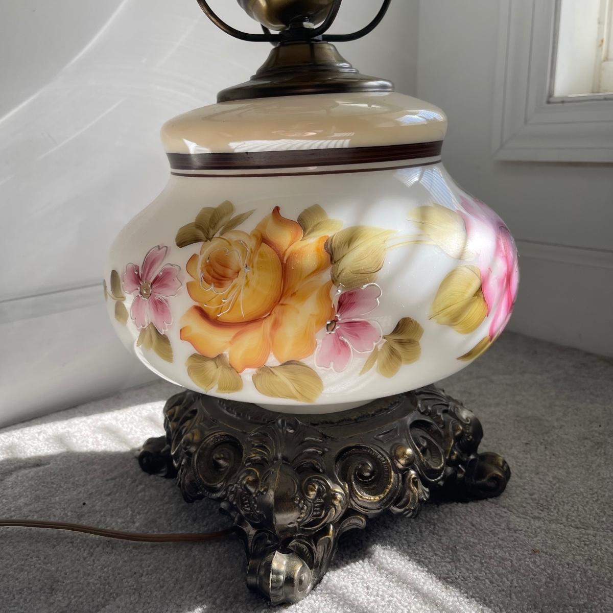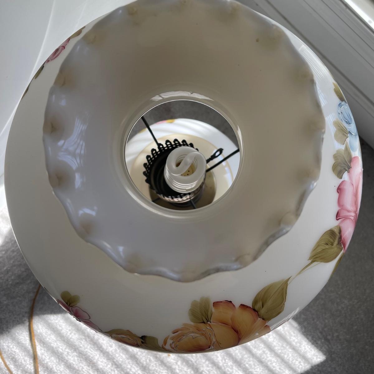 This floral lamp appears to have been hand painted and measures 26 inches tall with the lamp shade on. Both the fixture that holds the bulb and the fixture that holds the weight of the lamp shade need to be adjusted/tightened as they are crooked and loose. When plugged in, the light turned on. A spare cream colored lampshade is also included.