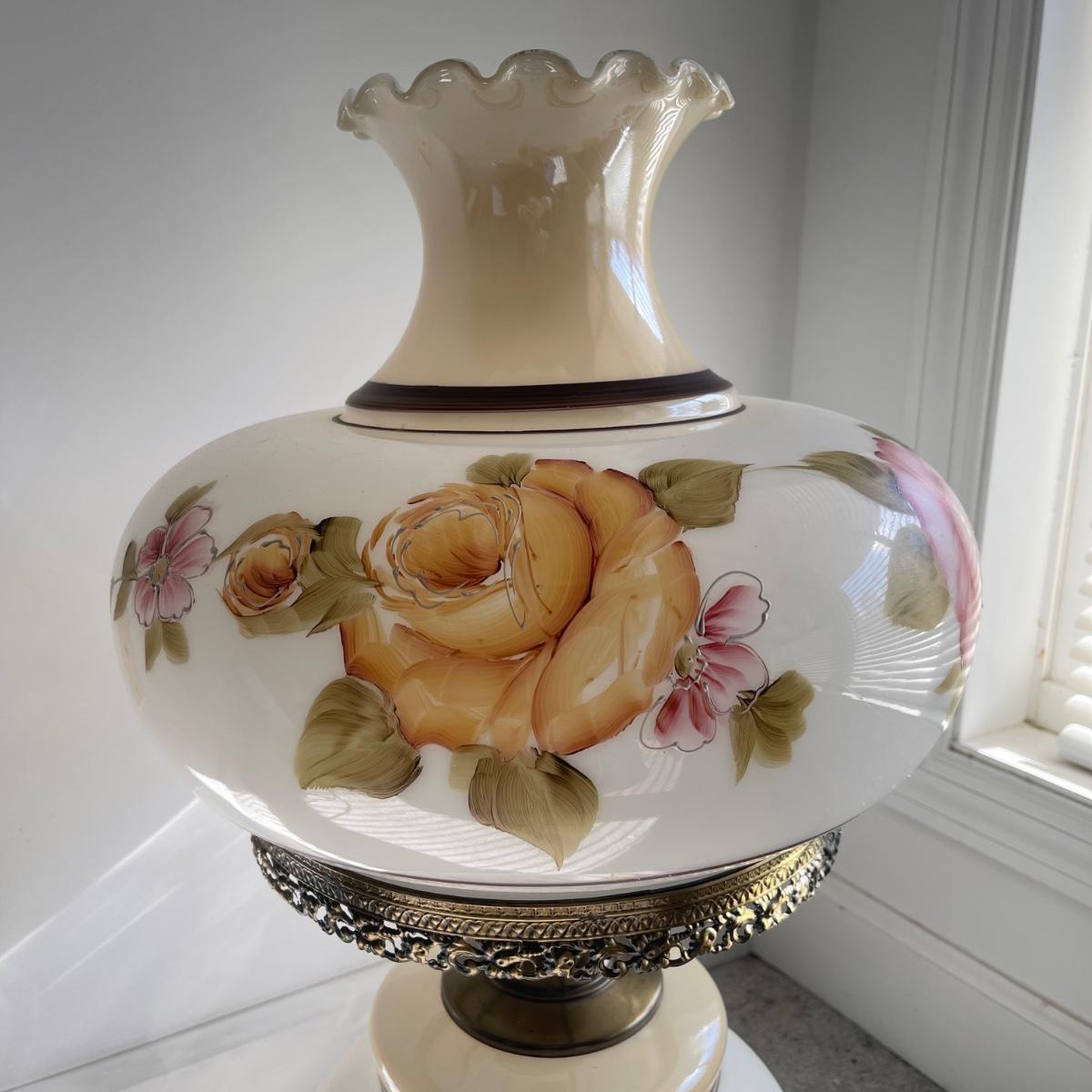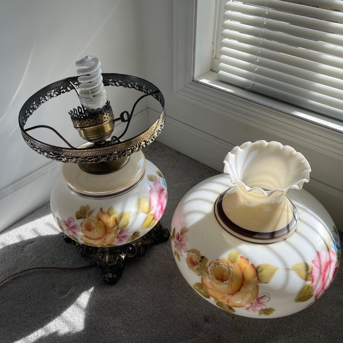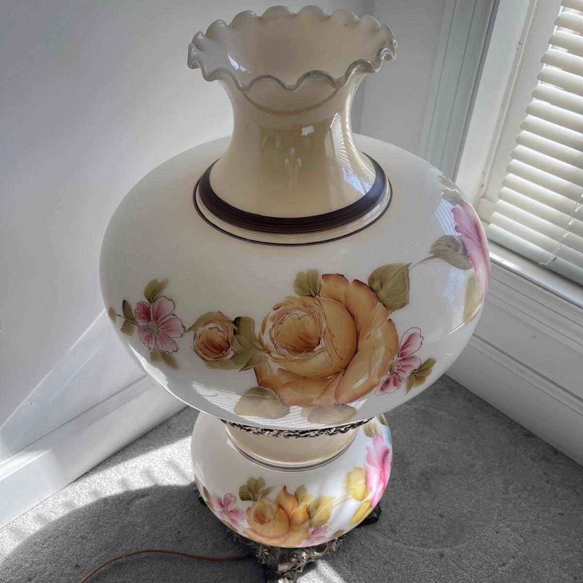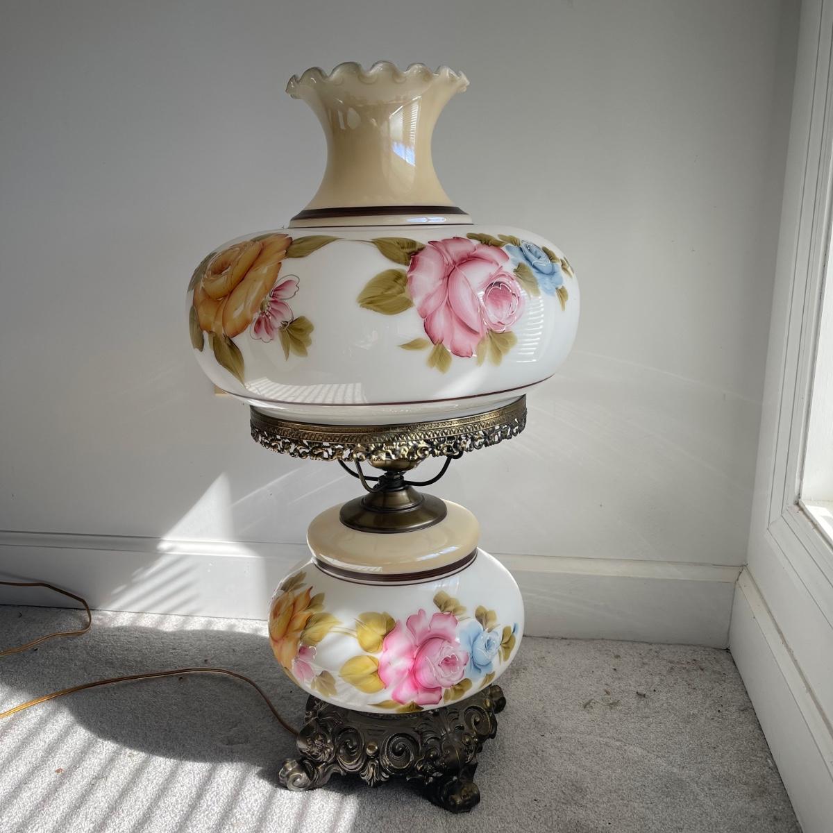 This floral lamp appears to have been hand painted and measures 26 inches tall with the lamp shade on. Both the fixture that holds the bulb and the fixture that holds the weight of the lamp shade need to be adjusted/tightened as they are crooked and loose. When plugged in, the light turned on. A spare cream colored lampshade is also included.