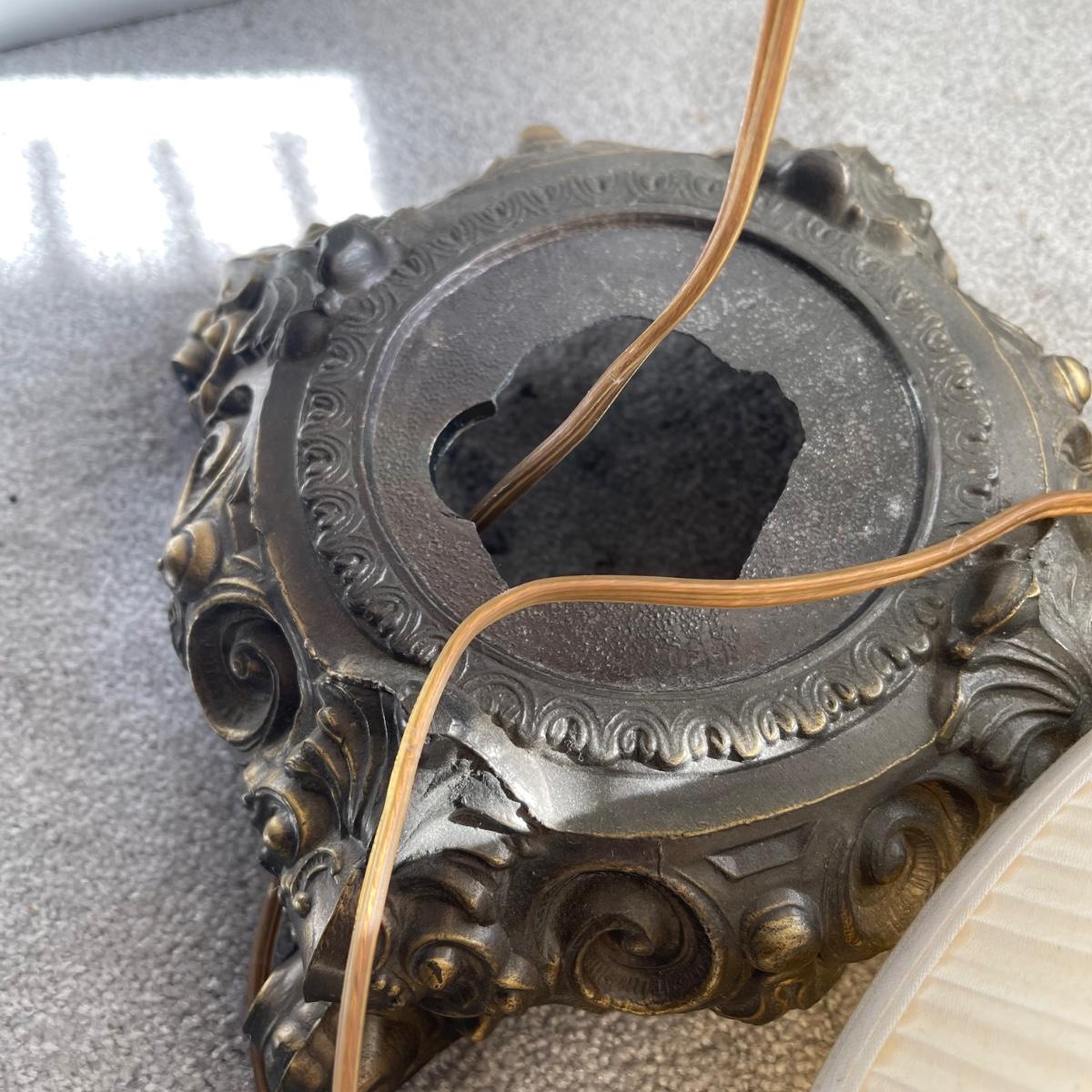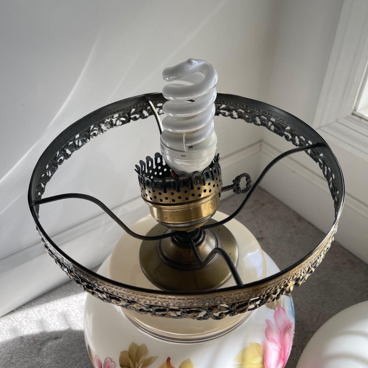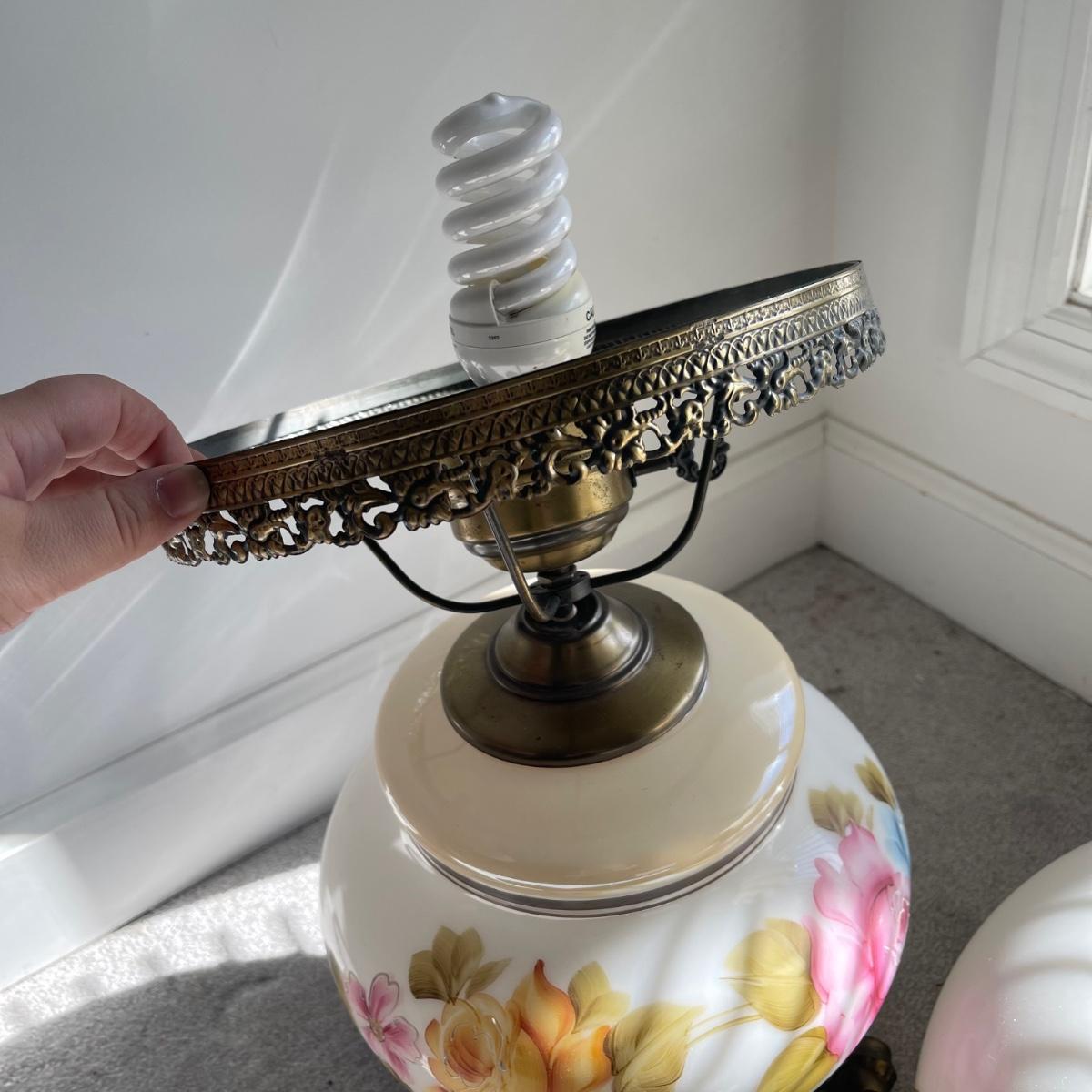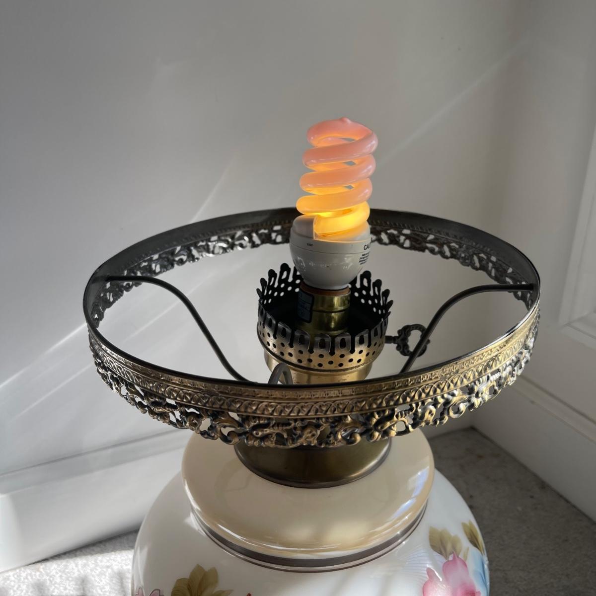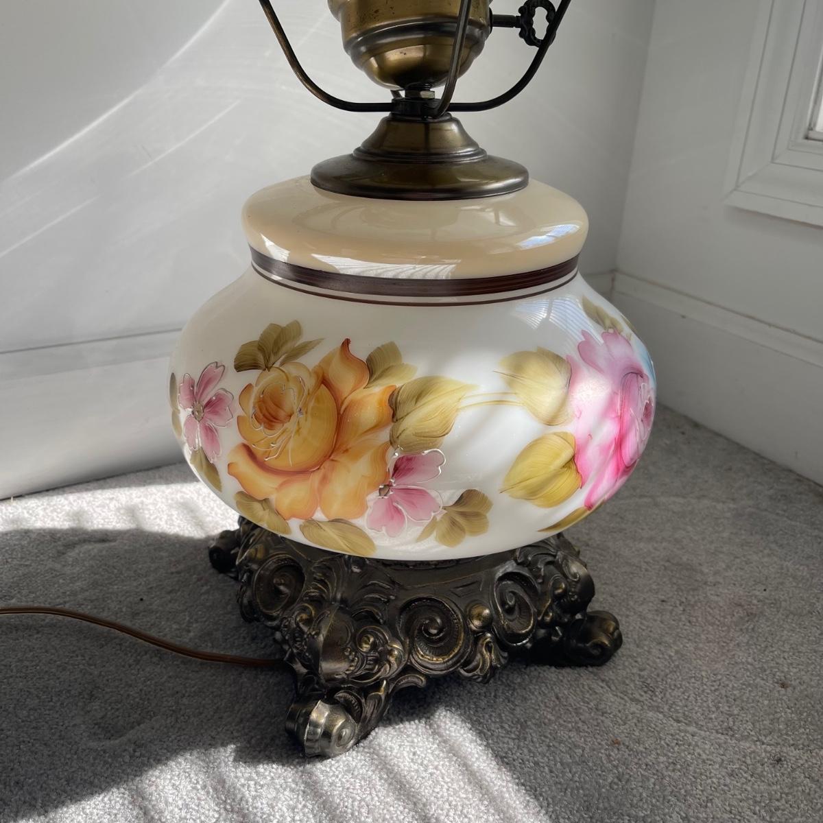 This floral lamp appears to have been hand painted and measures 26 inches tall with the lamp shade on. Both the fixture that holds the bulb and the fixture that holds the weight of the lamp shade need to be adjusted/tightened as they are crooked and loose. When plugged in, the light turned on. A spare cream colored lampshade is also included.