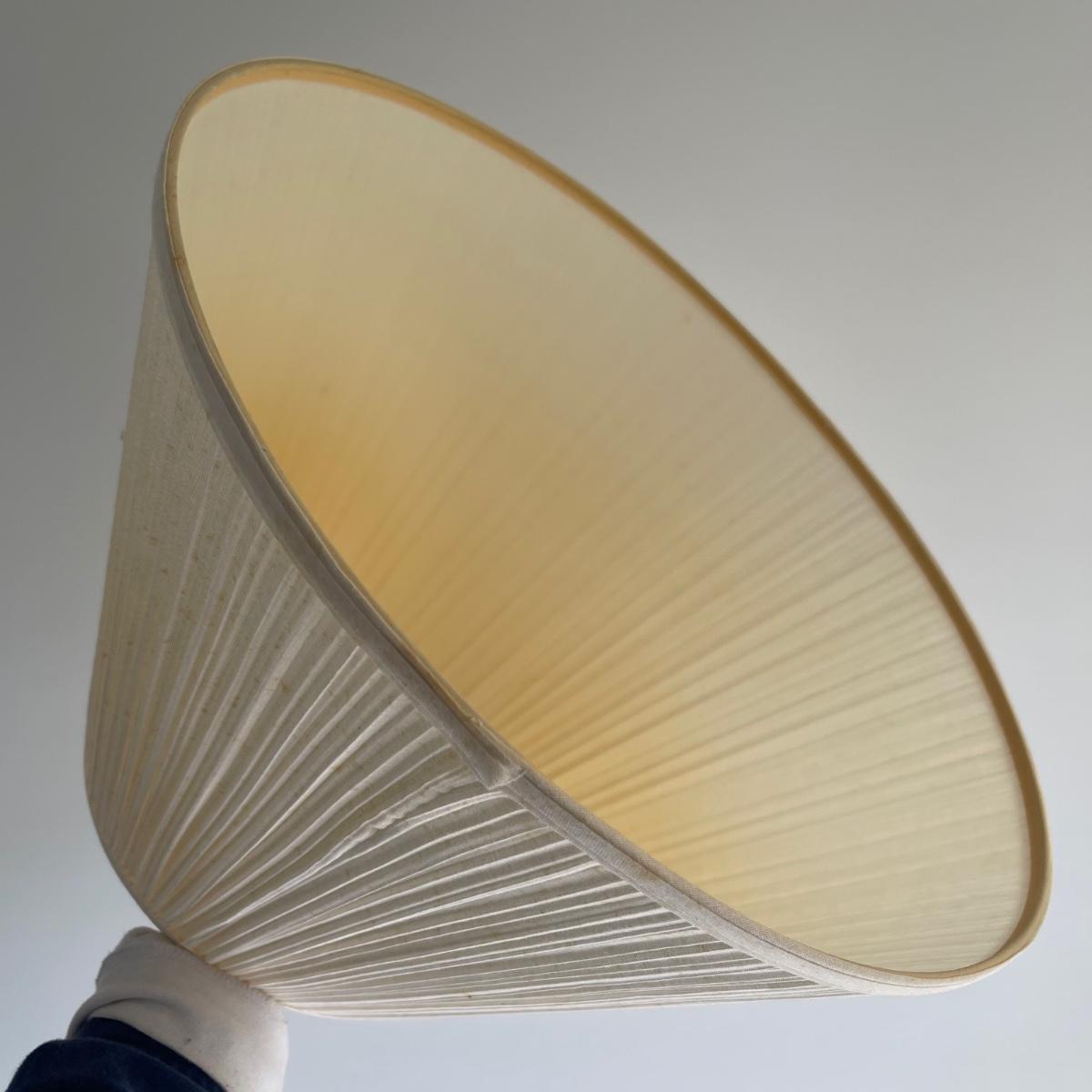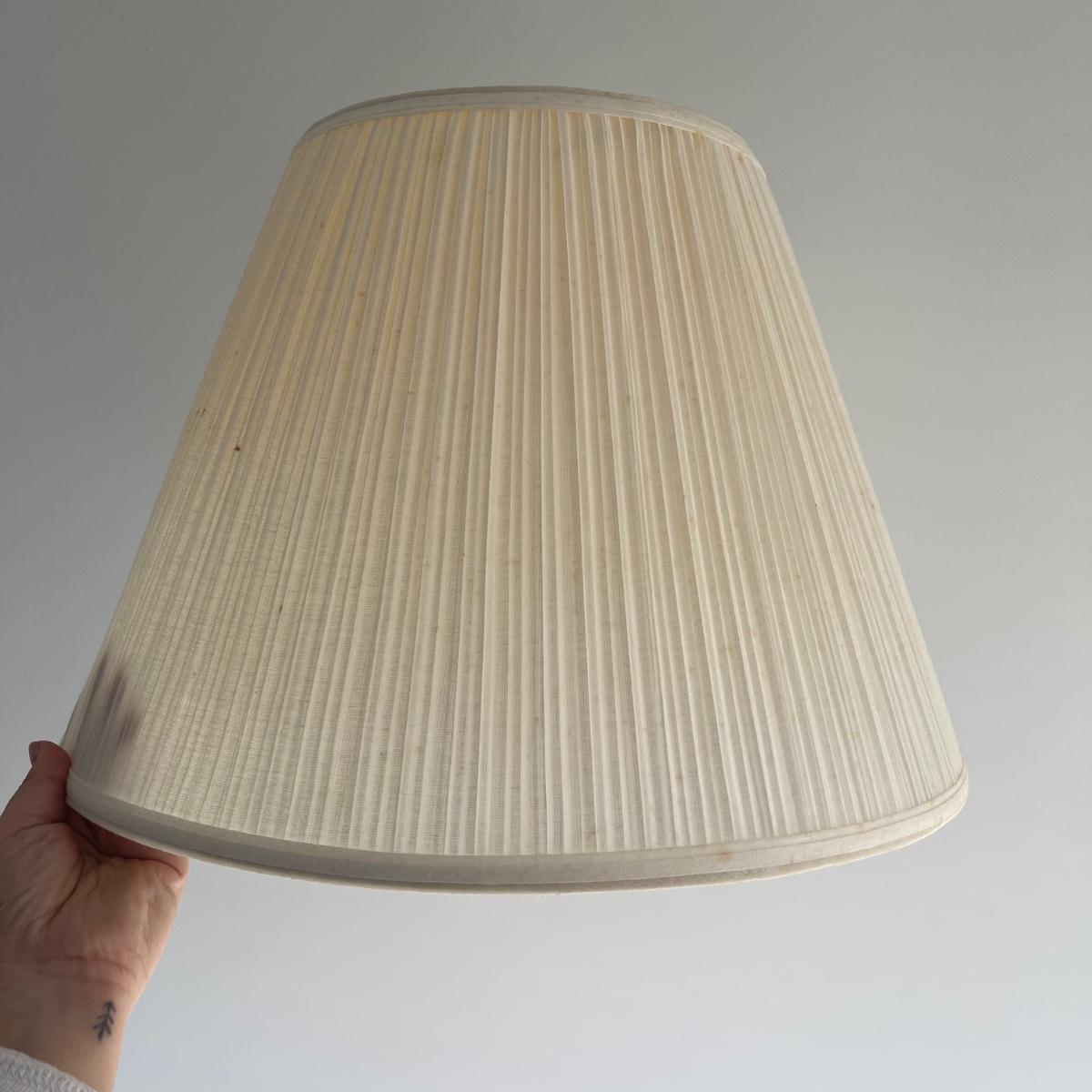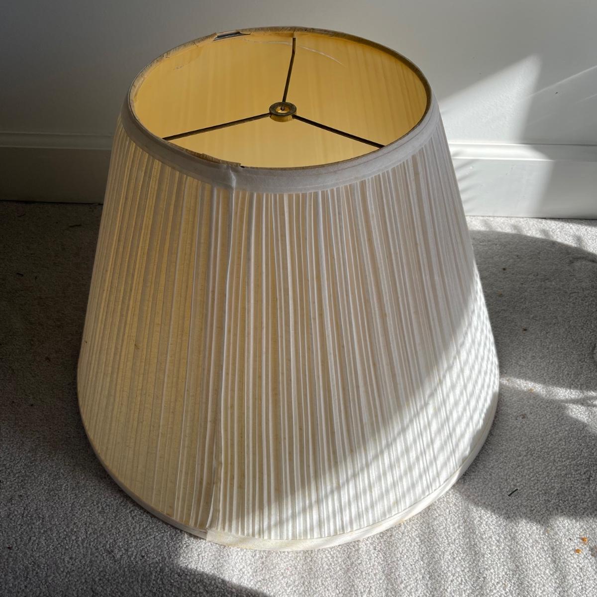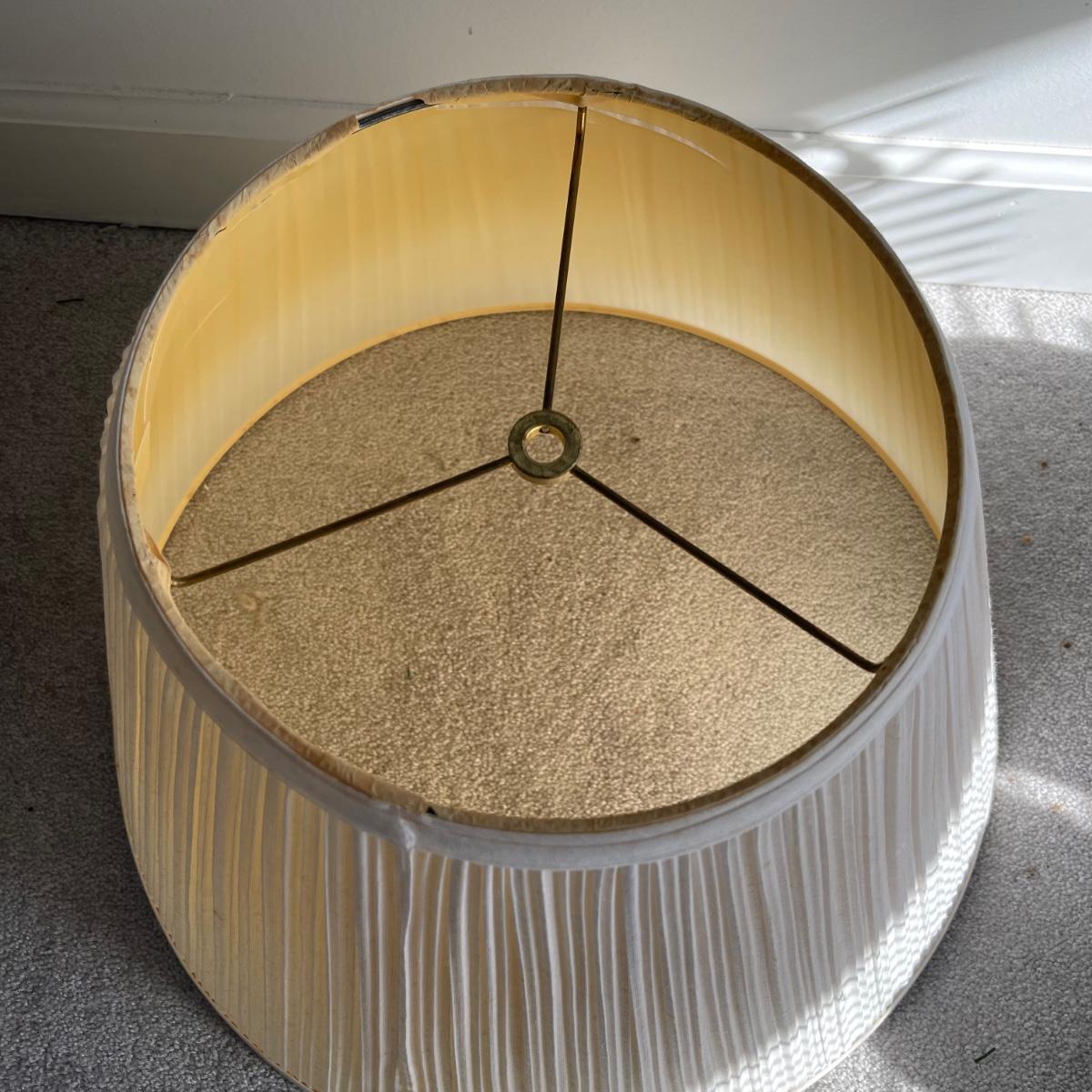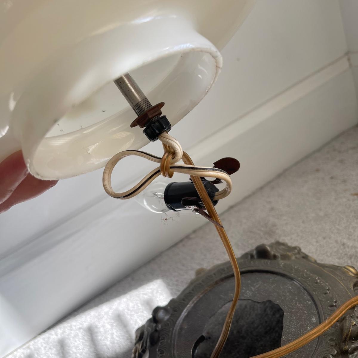 This floral lamp appears to have been hand painted and measures 26 inches tall with the lamp shade on. Both the fixture that holds the bulb and the fixture that holds the weight of the lamp shade need to be adjusted/tightened as they are crooked and loose. When plugged in, the light turned on. A spare cream colored lampshade is also included.