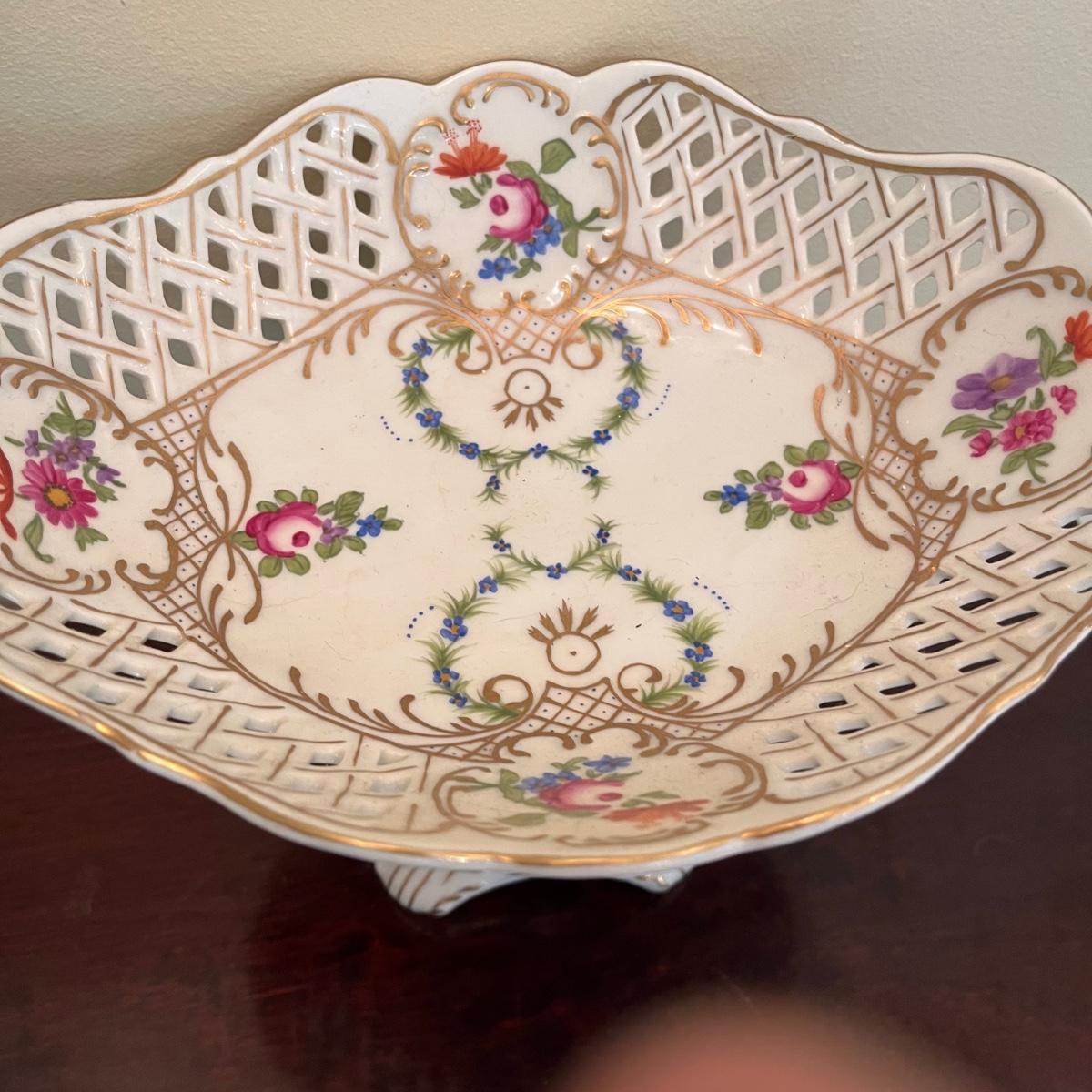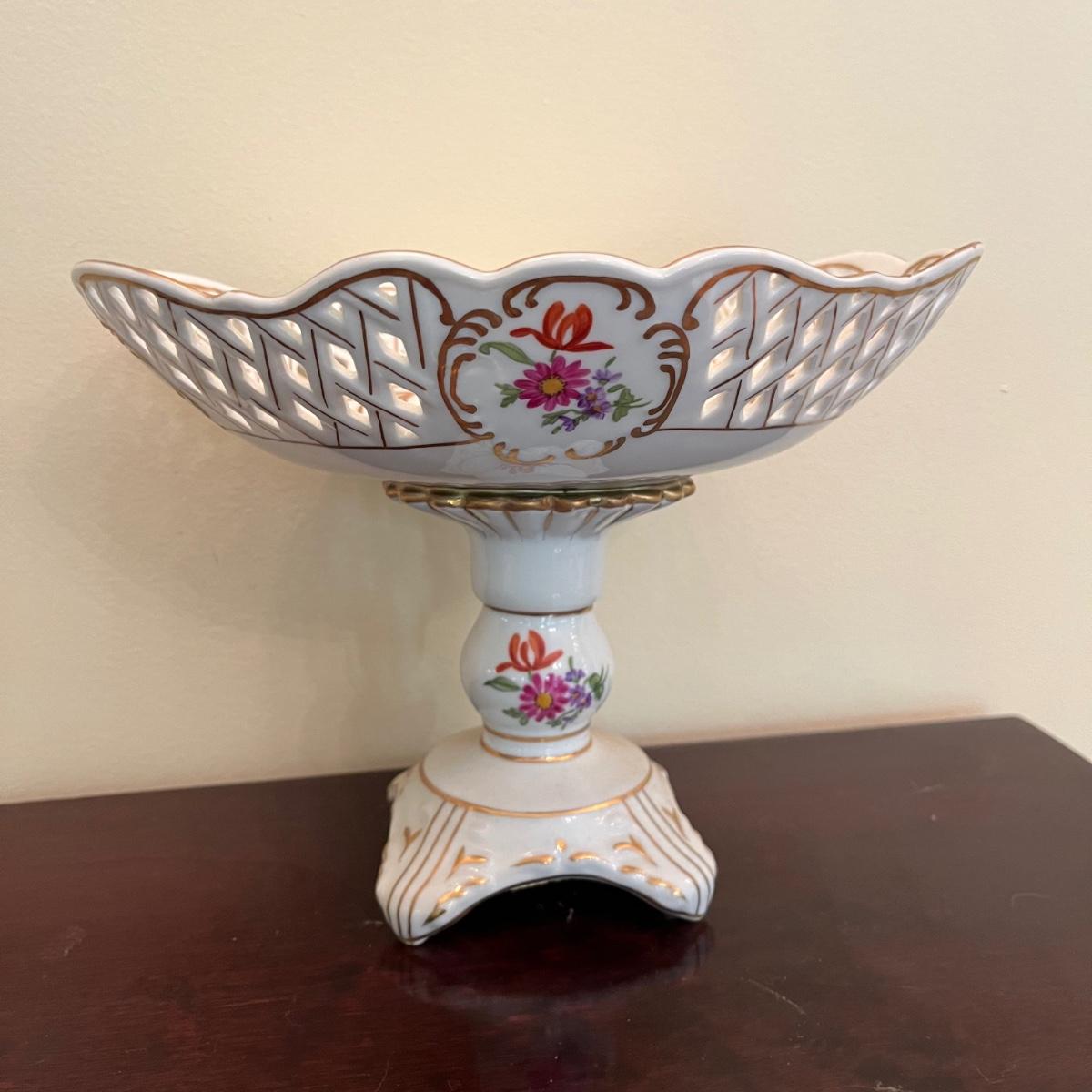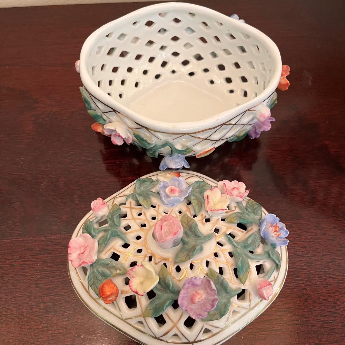 Lot includes floral lattice footed bowl and jar, floral plate, floral bowl, footed floral jar and a deep floral bowl. Footed lattice bowl measures 7” x 9” x 6.75”.