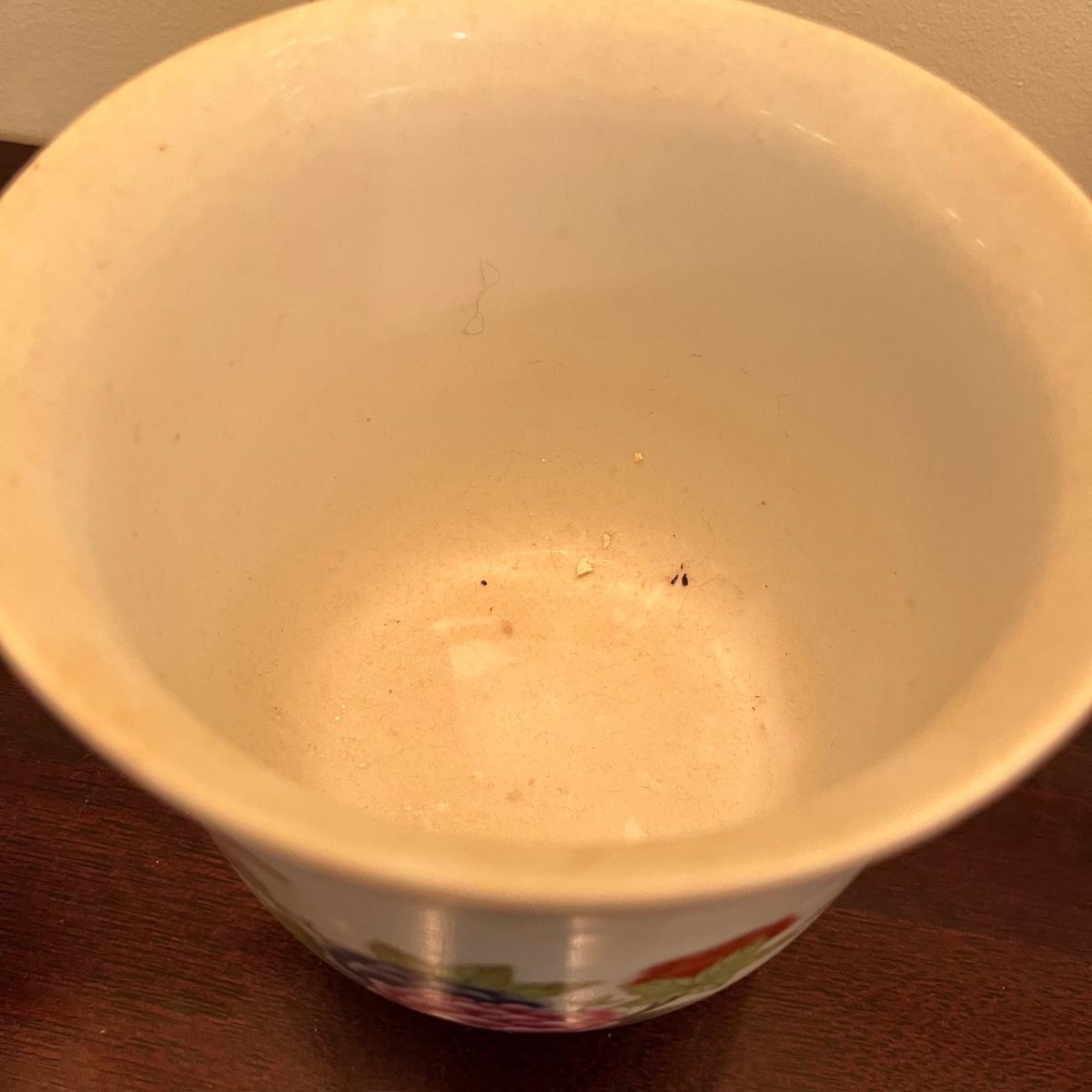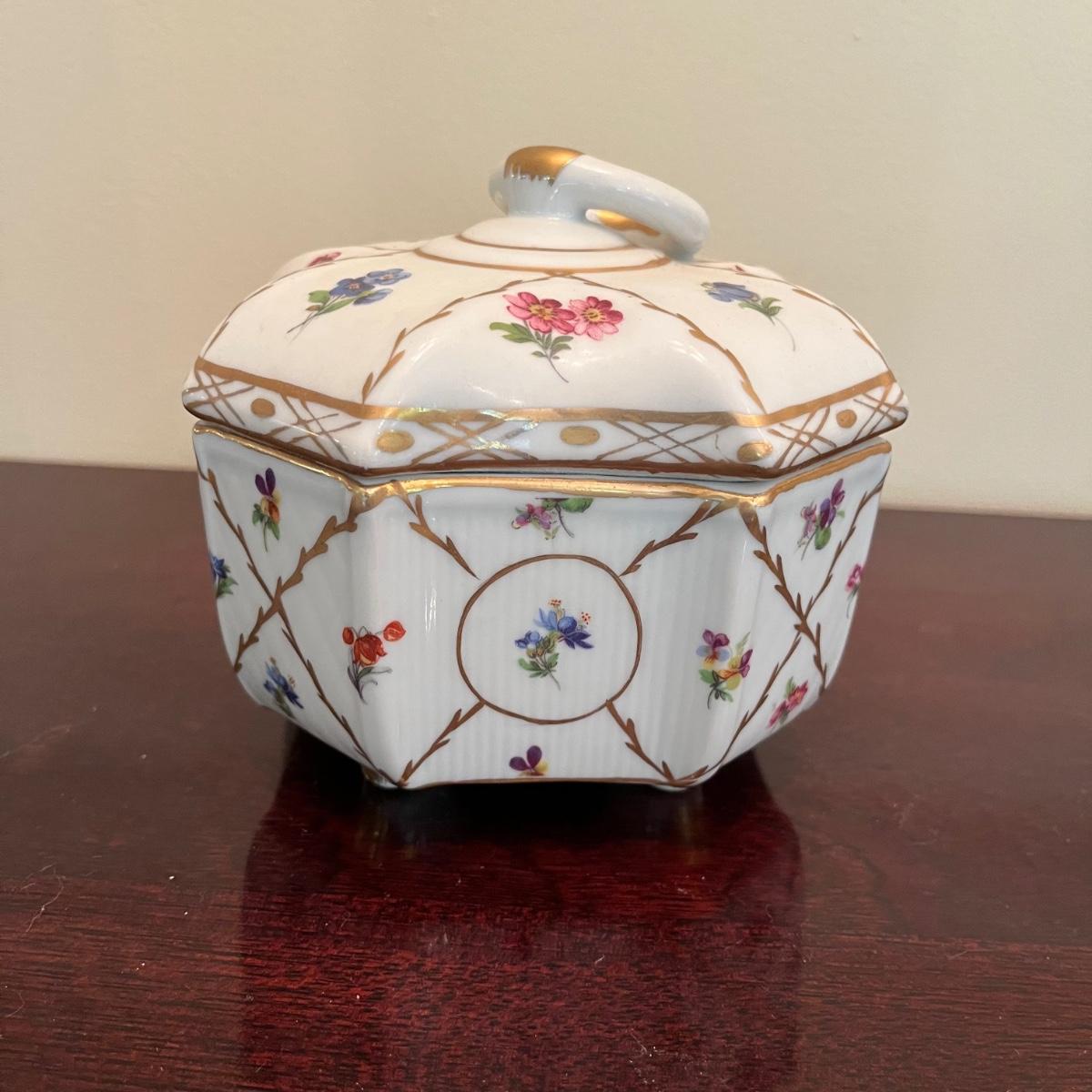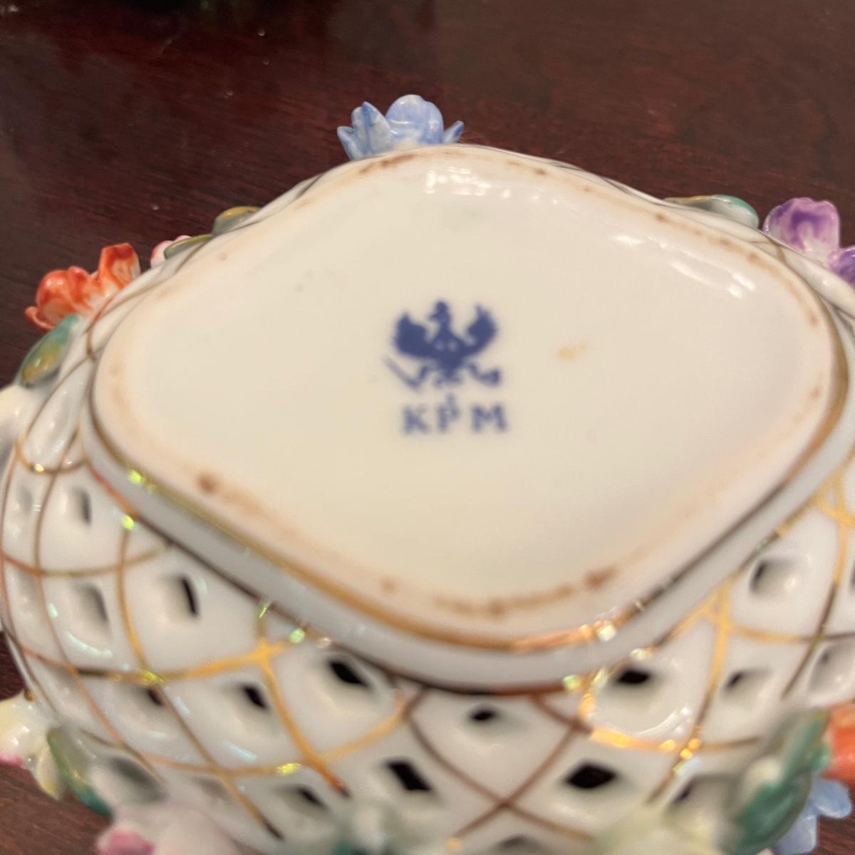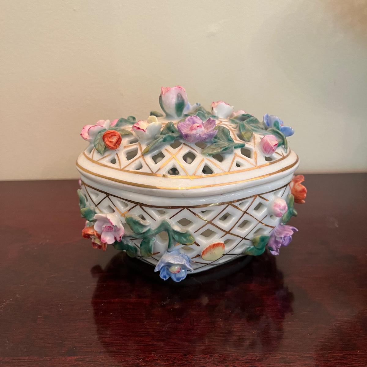 Lot includes floral lattice footed bowl and jar, floral plate, floral bowl, footed floral jar and a deep floral bowl. Footed lattice bowl measures 7” x 9” x 6.75”.