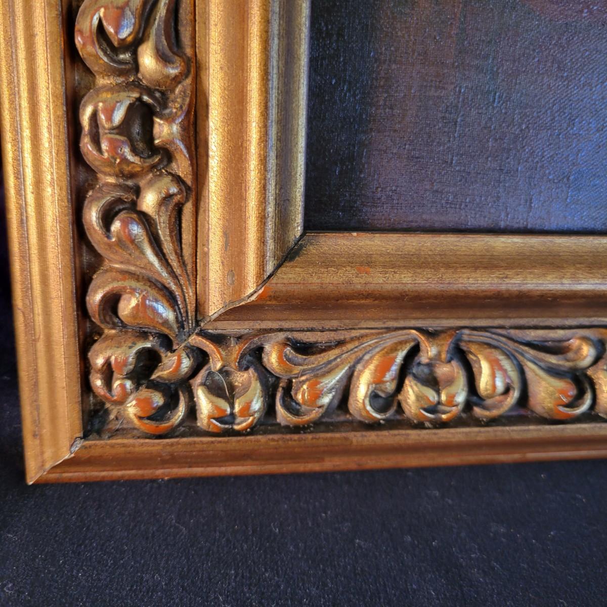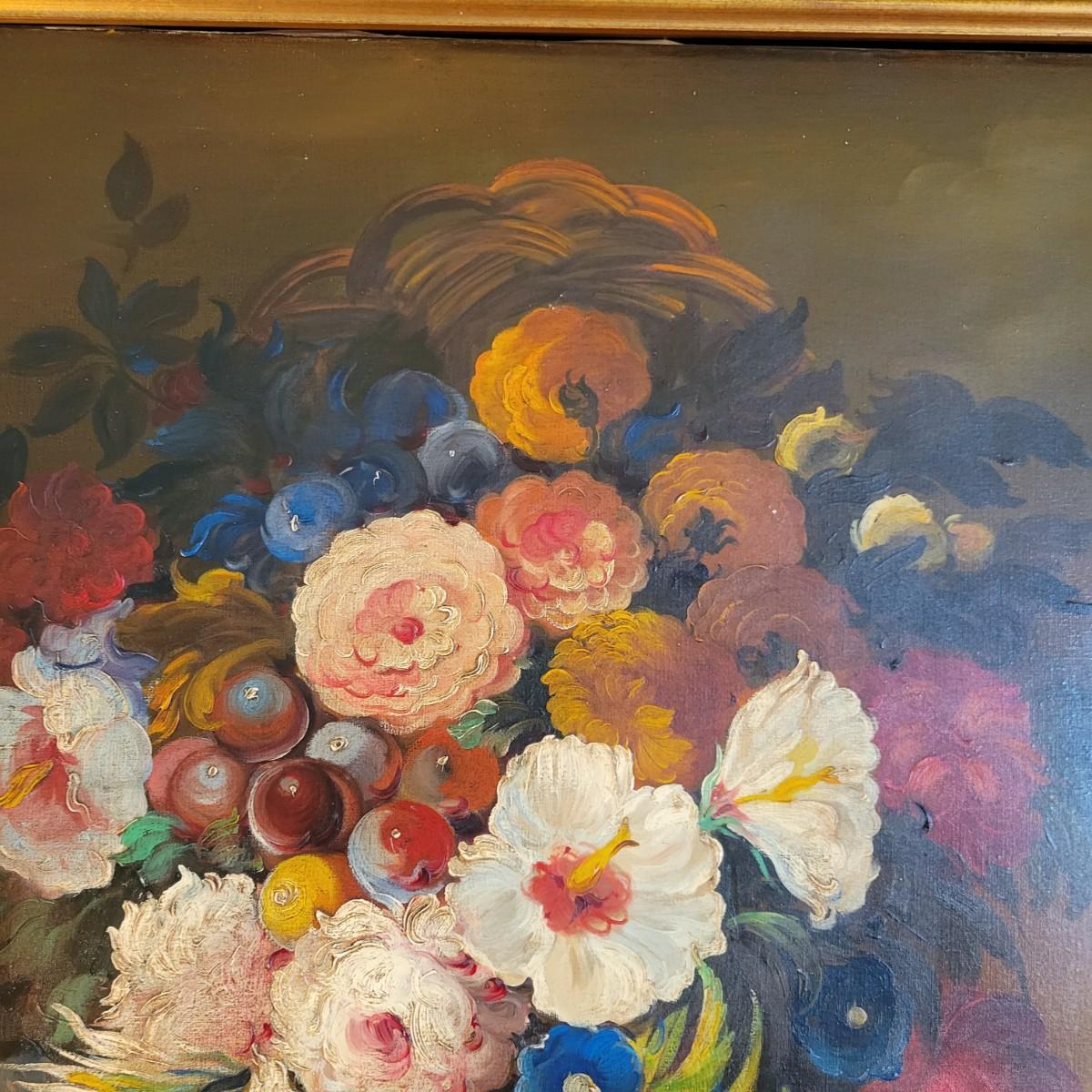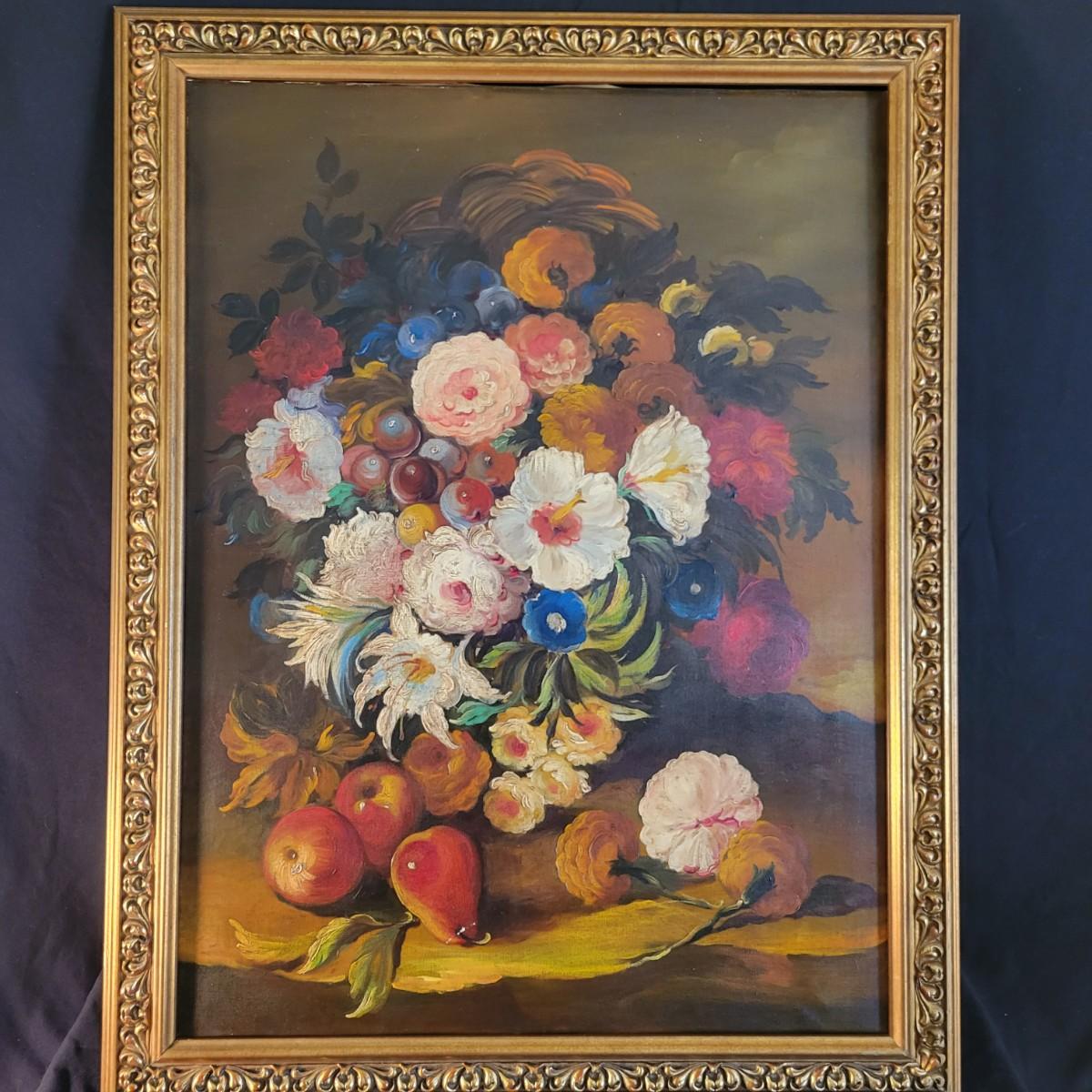 A floral still life original oil in an ornate gold frame that is in good condition, but the canvas is loose in the frame on the top and side andnthebframenhas a few minor blemishes. This piece is an unsigned original of fruit and flowers in a ornate gold frame made of wood. Measures approximately 28" x 36" x 1.5". Shipping available. Shipping Art can be costly please call UPS store at 828-252-6930 for quote