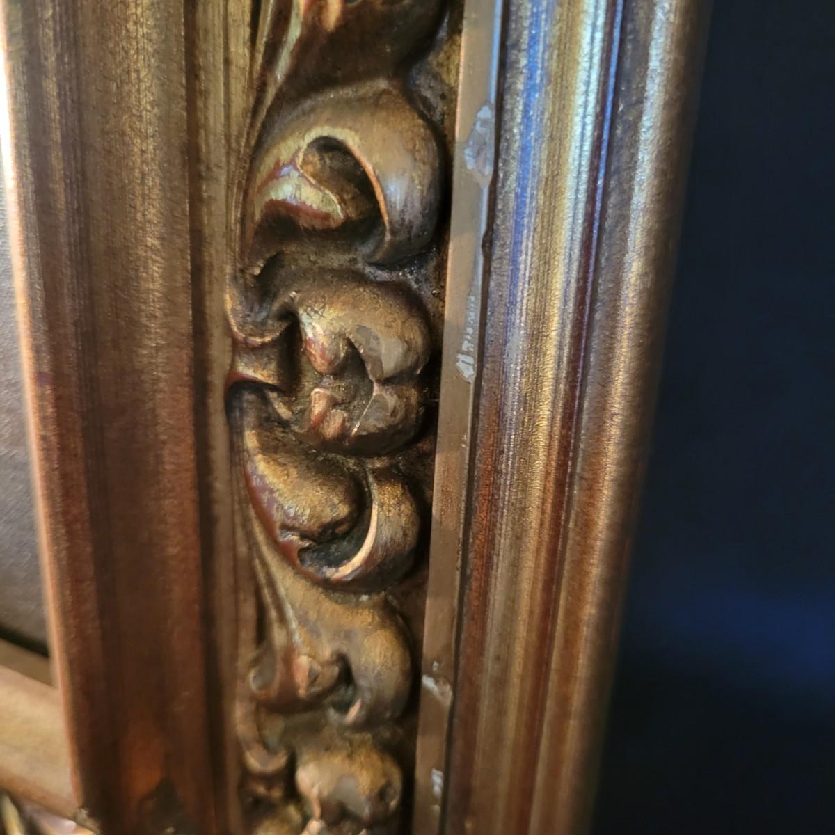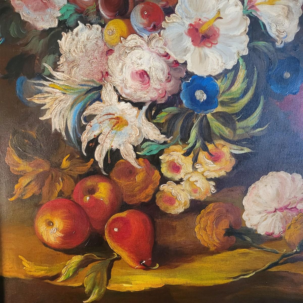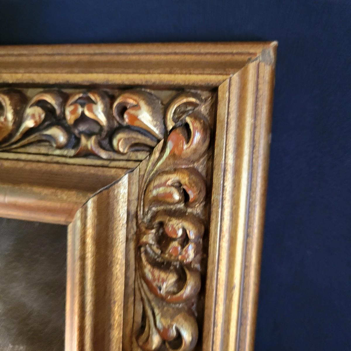 A floral still life original oil in an ornate gold frame that is in good condition, but the canvas is loose in the frame on the top and side andnthebframenhas a few minor blemishes. This piece is an unsigned original of fruit and flowers in a ornate gold frame made of wood. Measures approximately 28" x 36" x 1.5". Shipping available. Shipping Art can be costly please call UPS store at 828-252-6930 for quote