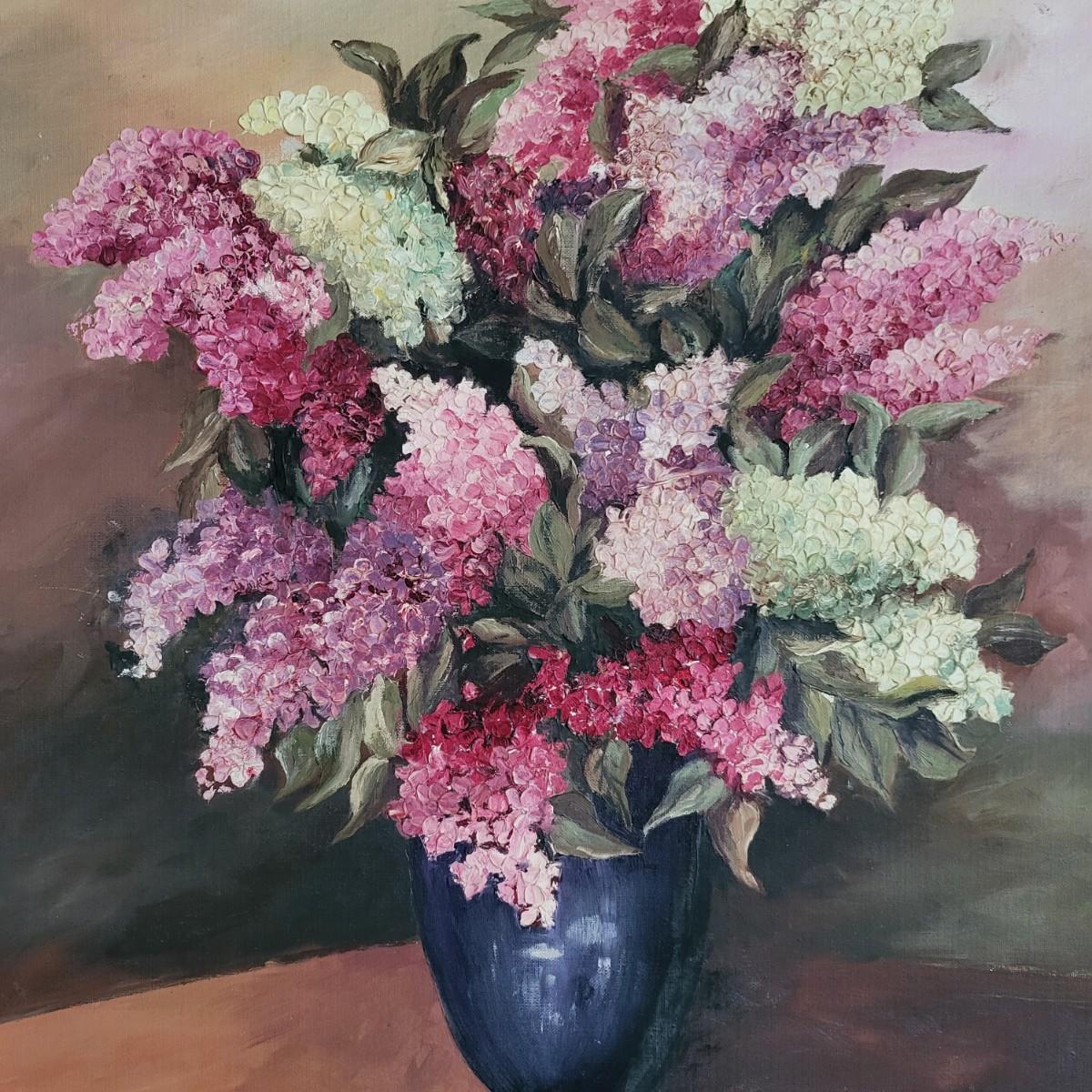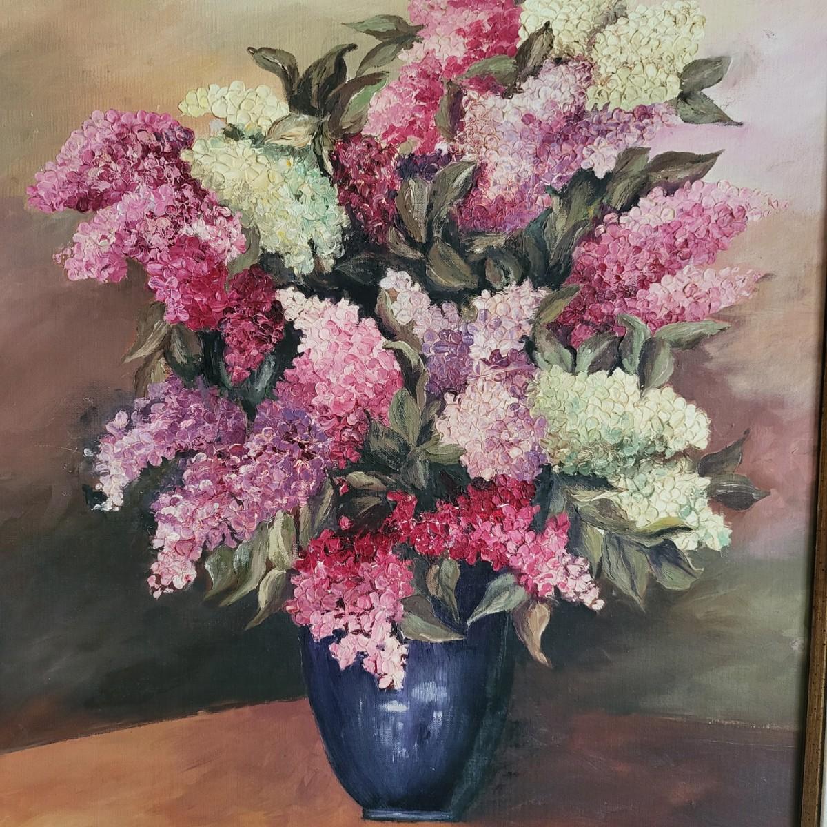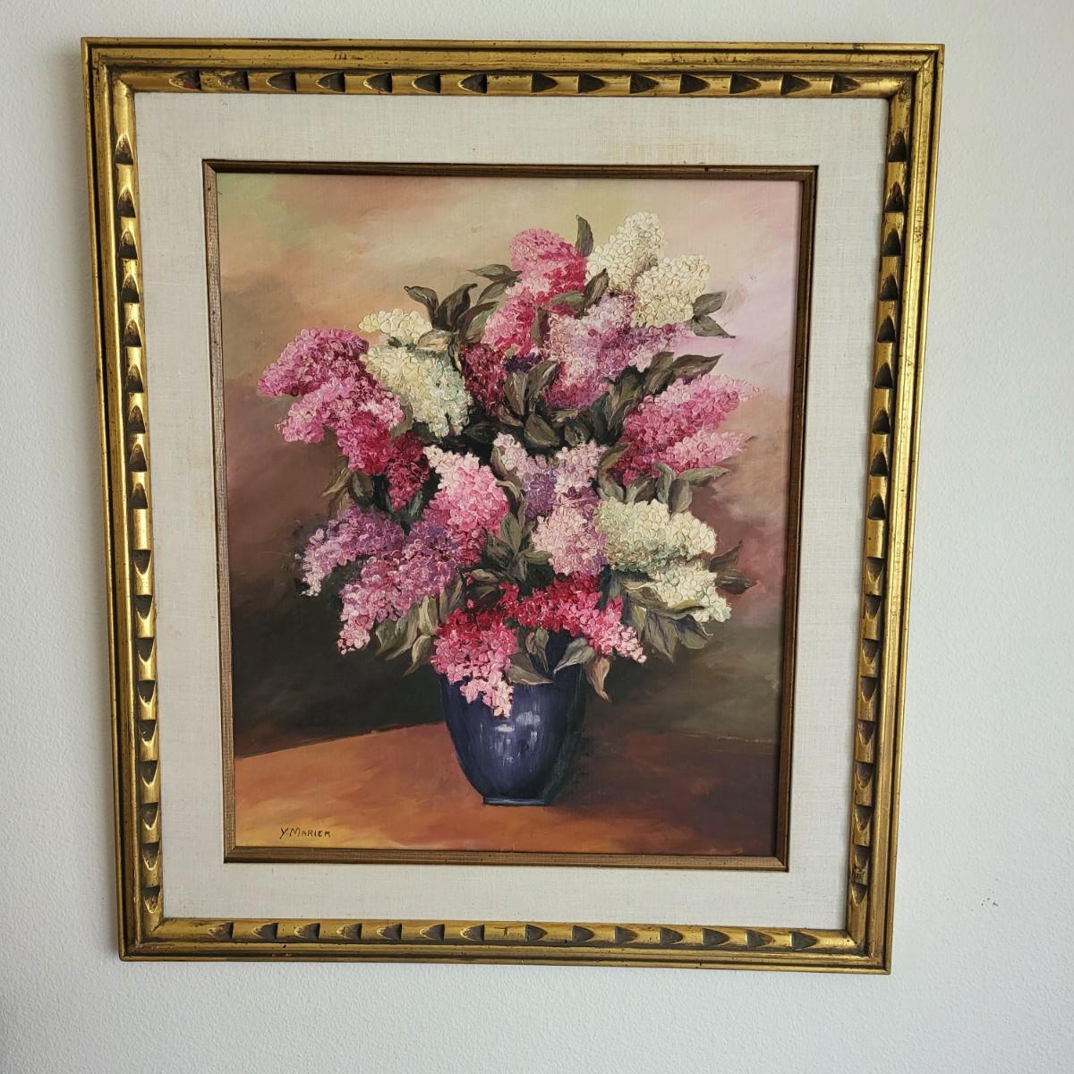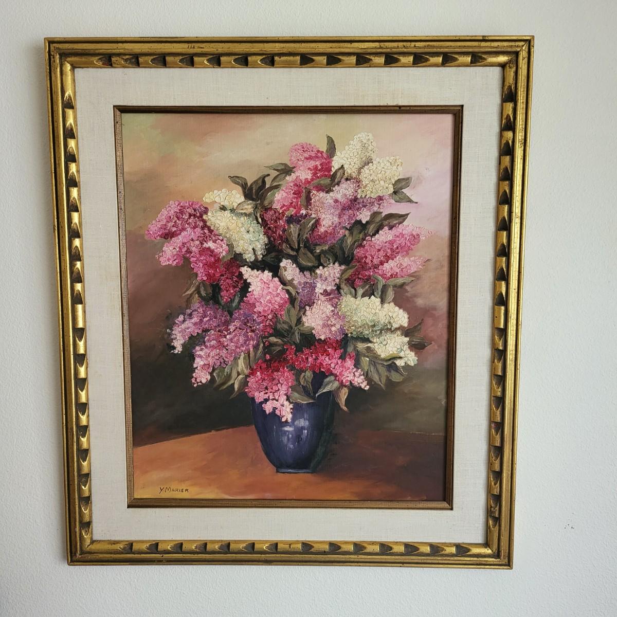 Beautiful still life painting of lilacs bouquet in vase. Overall measures 28" x 32". Wood, gold gilt frame (no glass). Flowers have a raised texture from the method of painting used. Signed by artist Y. Marier.