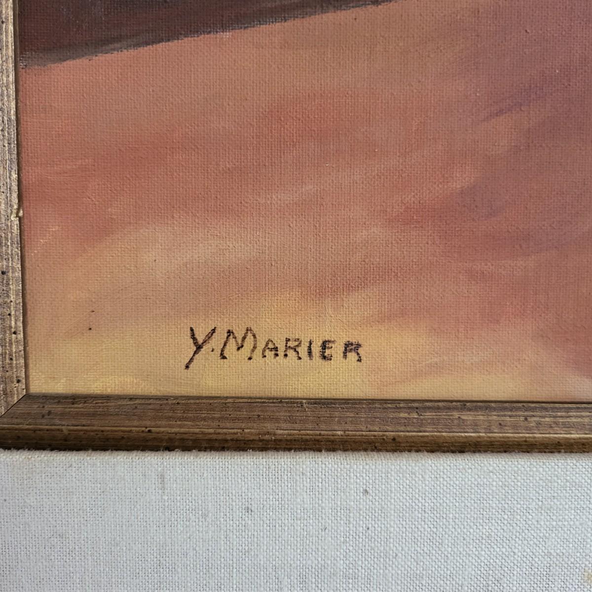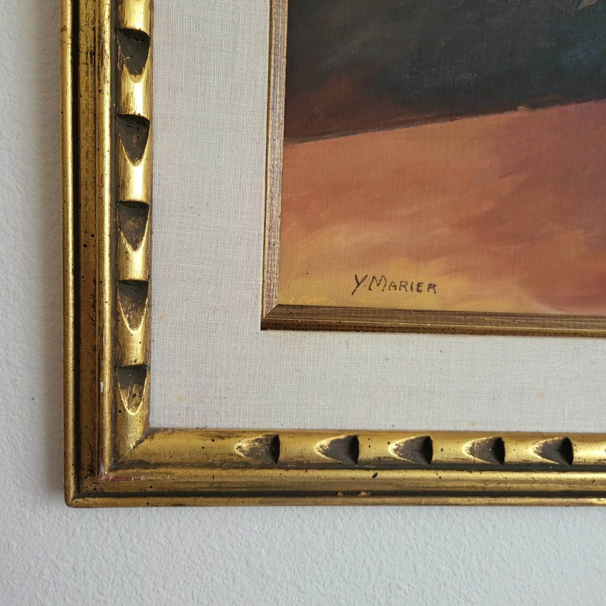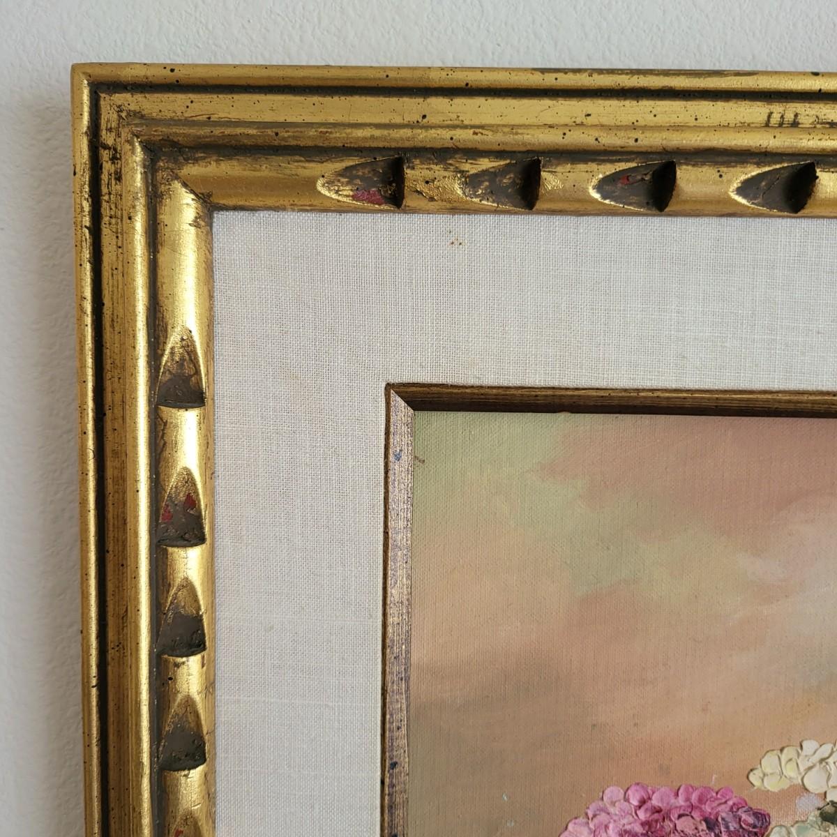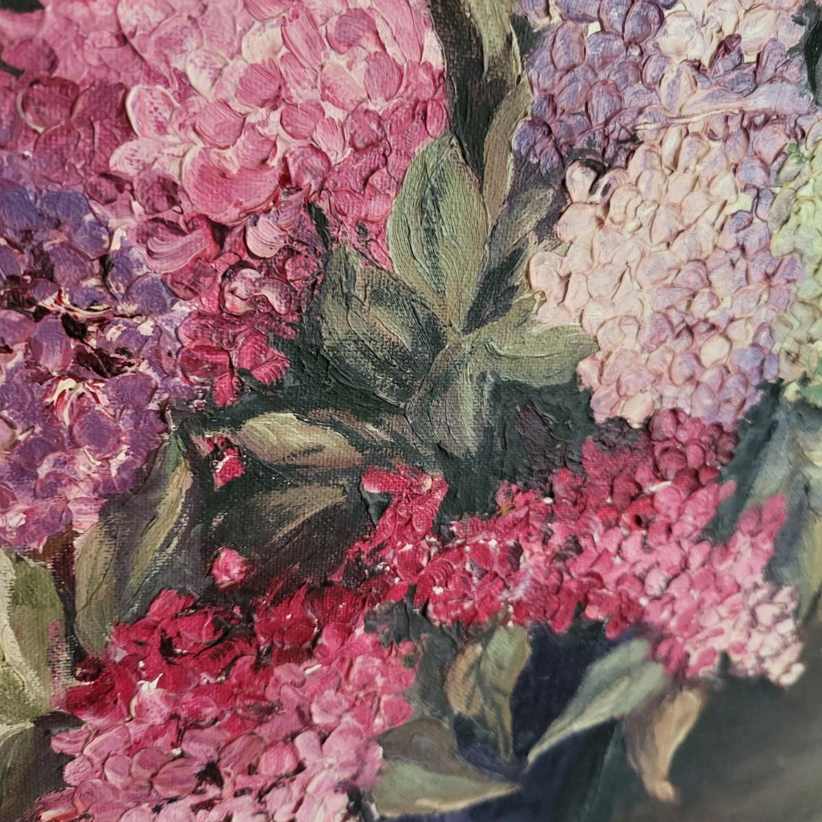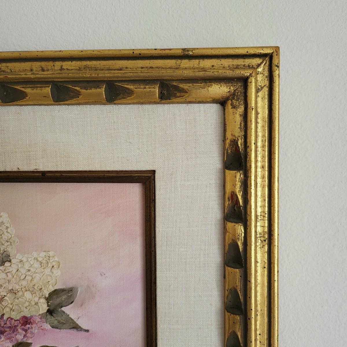 Beautiful still life painting of lilacs bouquet in vase. Overall measures 28" x 32". Wood, gold gilt frame (no glass). Flowers have a raised texture from the method of painting used. Signed by artist Y. Marier.