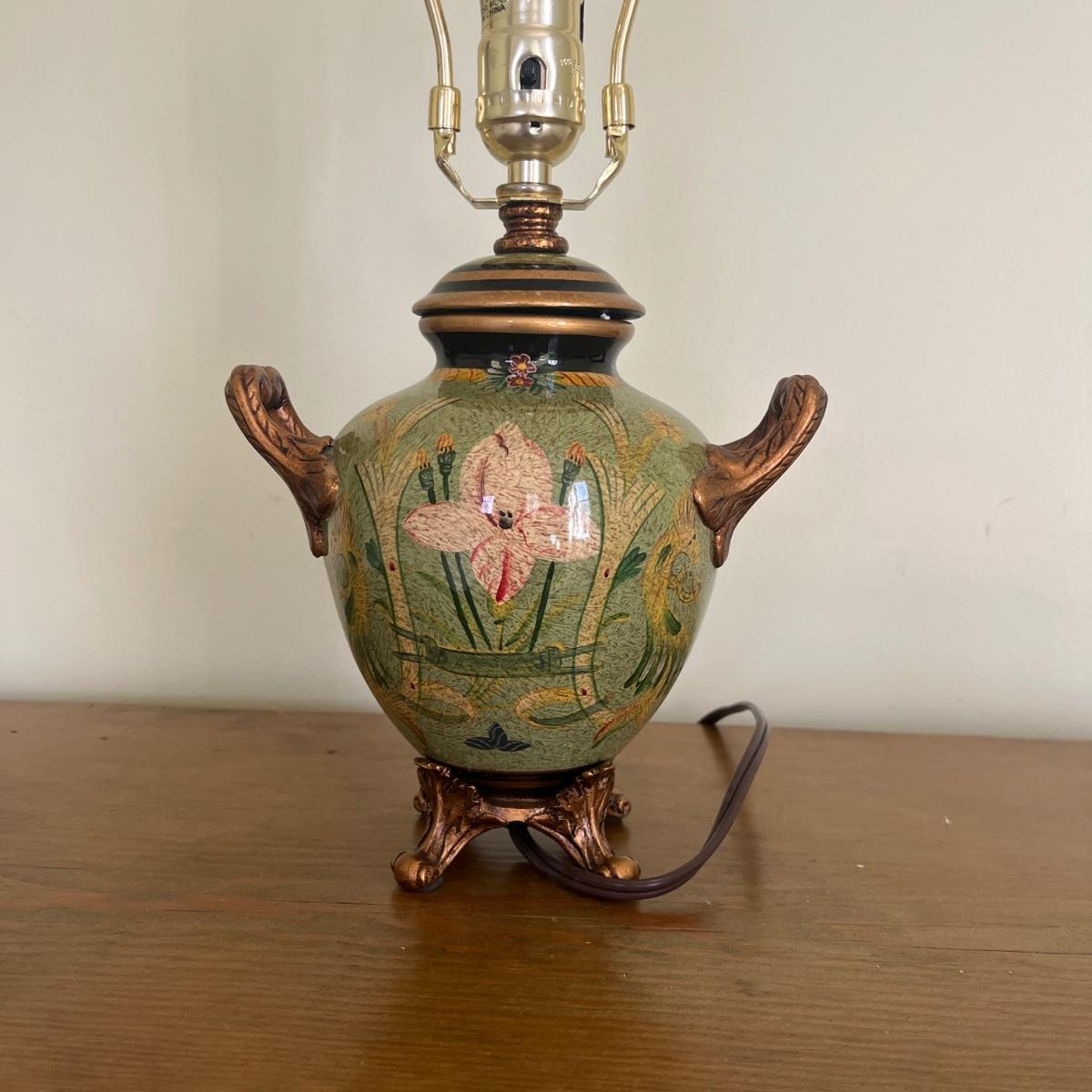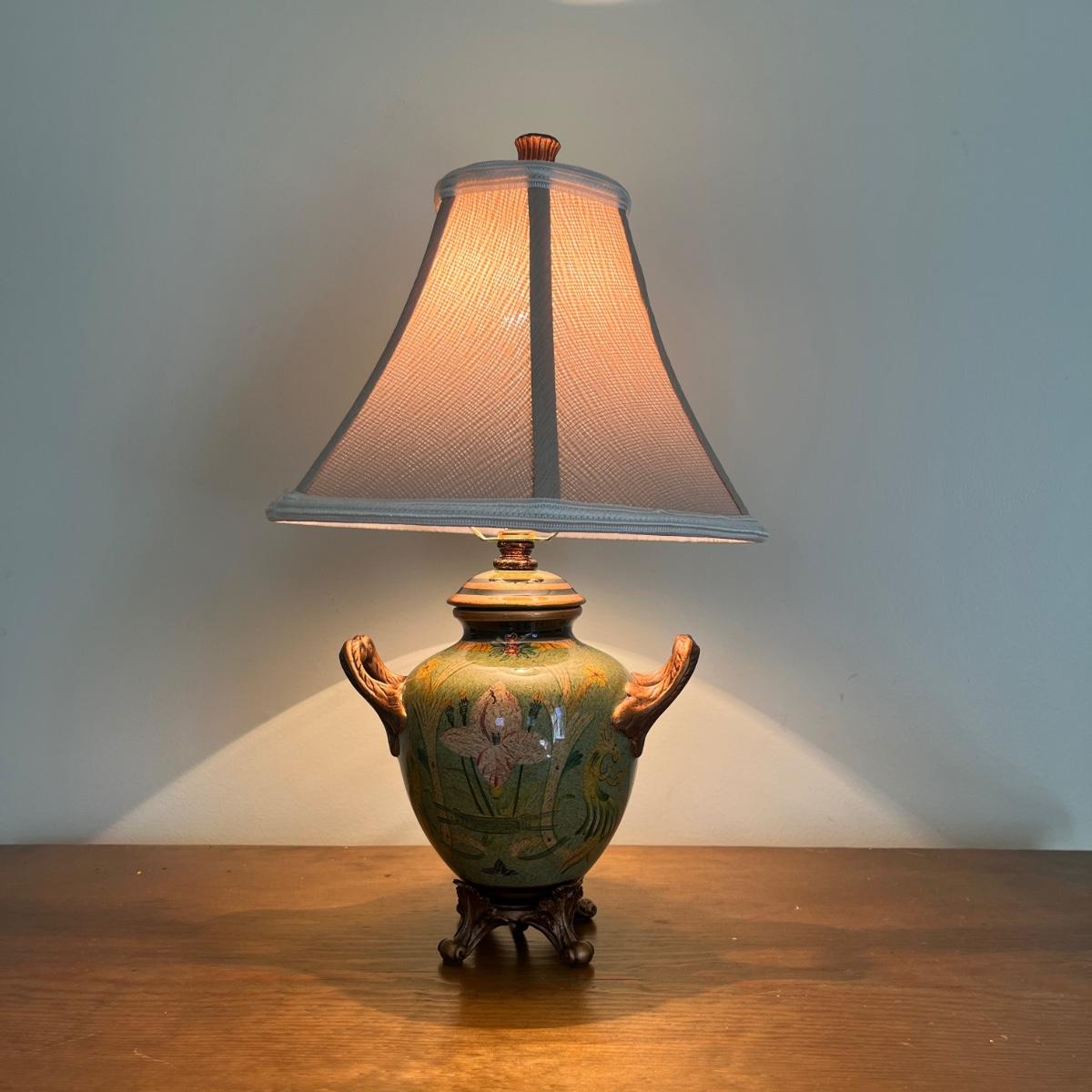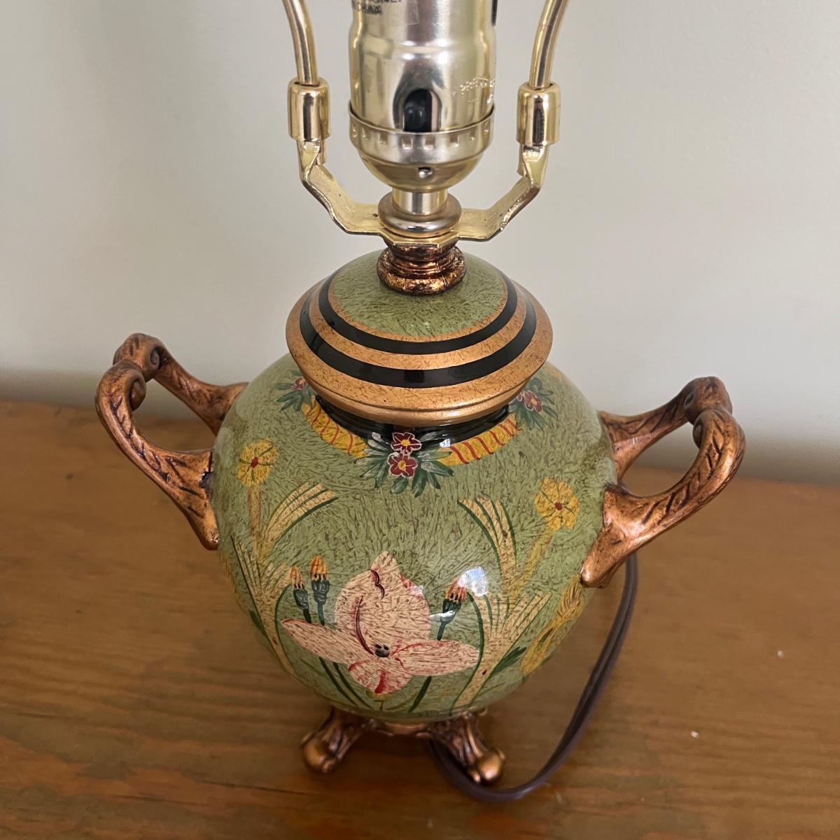 Lot includes a ceramic table lamp with a floral design. Lamp measures 10.5” x 17.5”H with shade. Lamp powered on when plugged in.