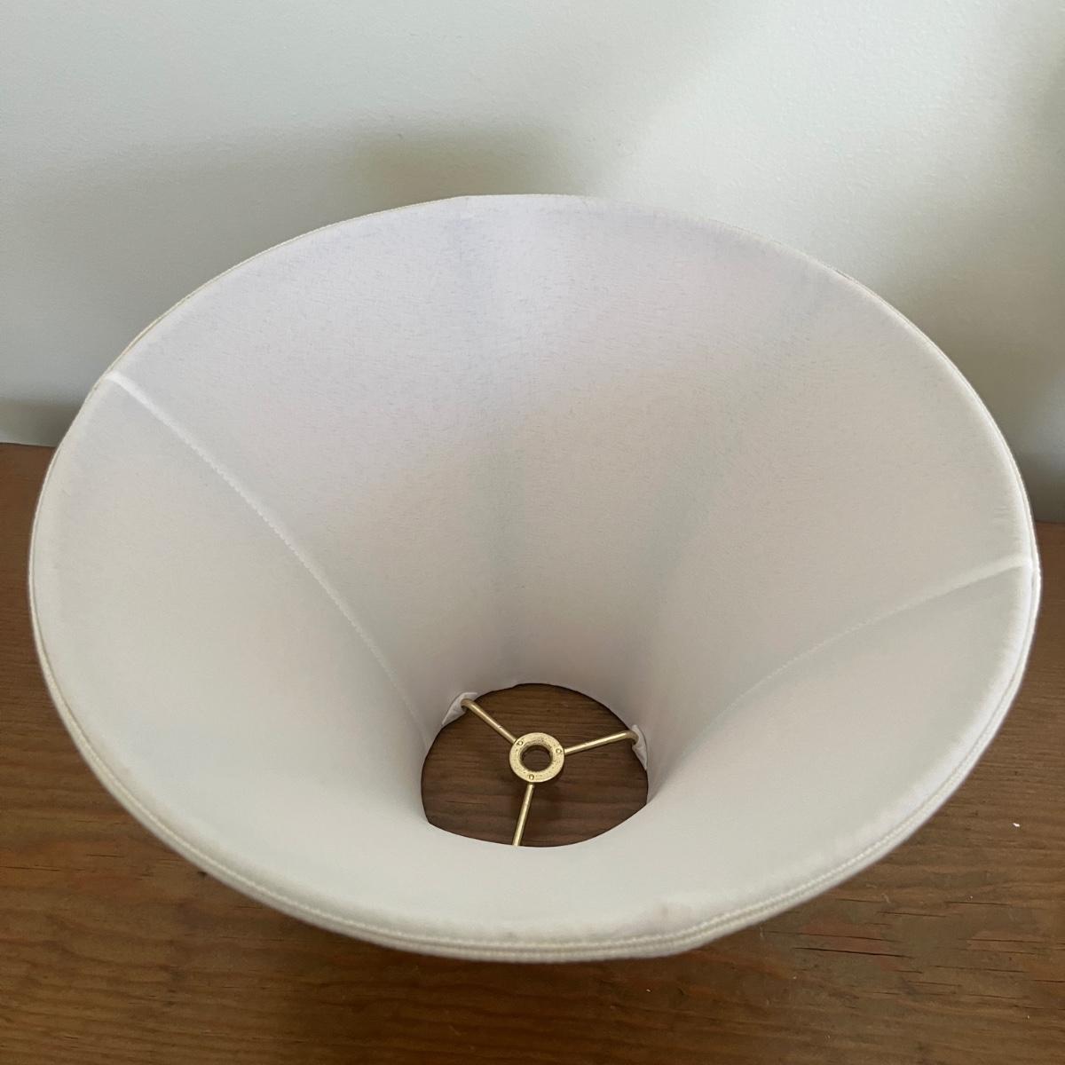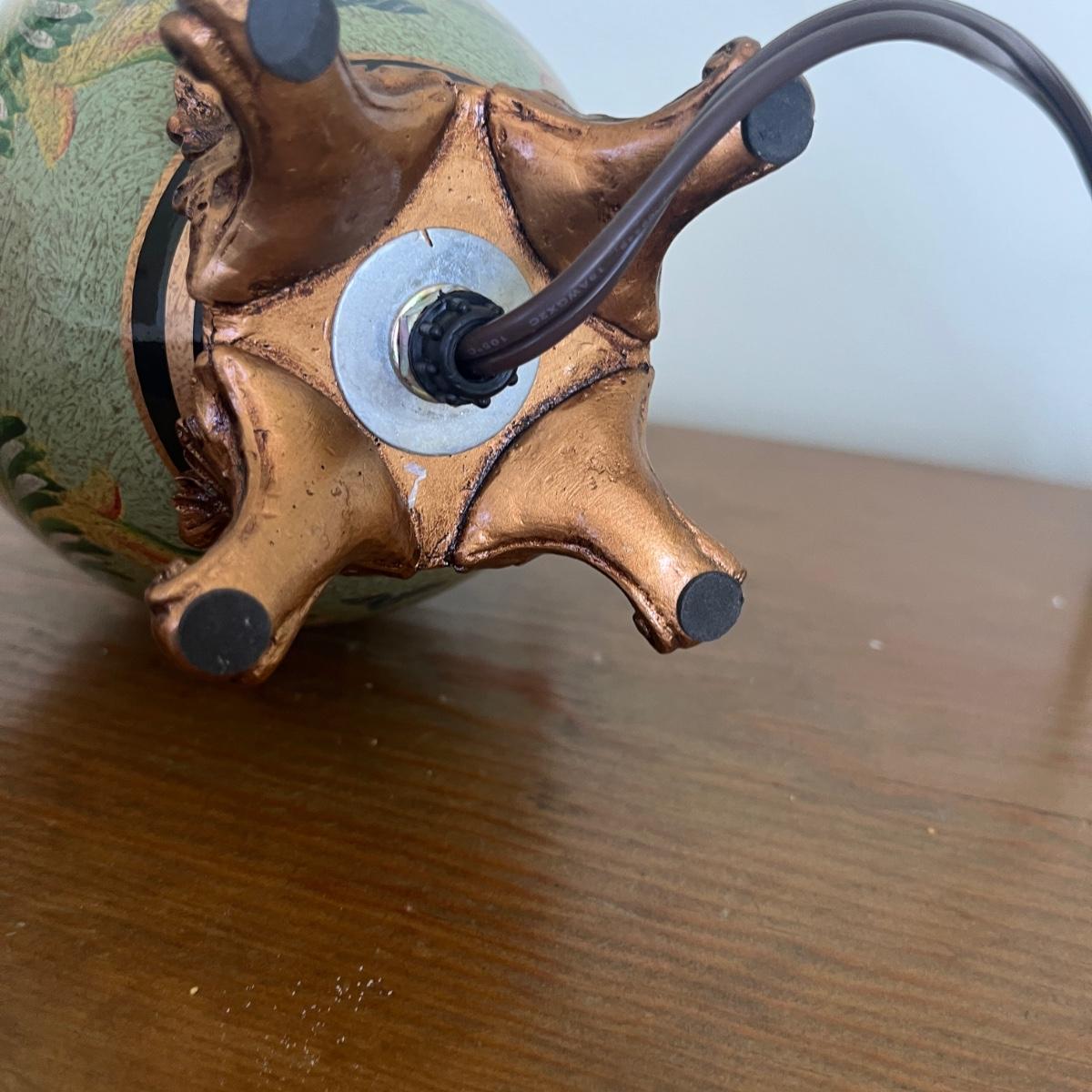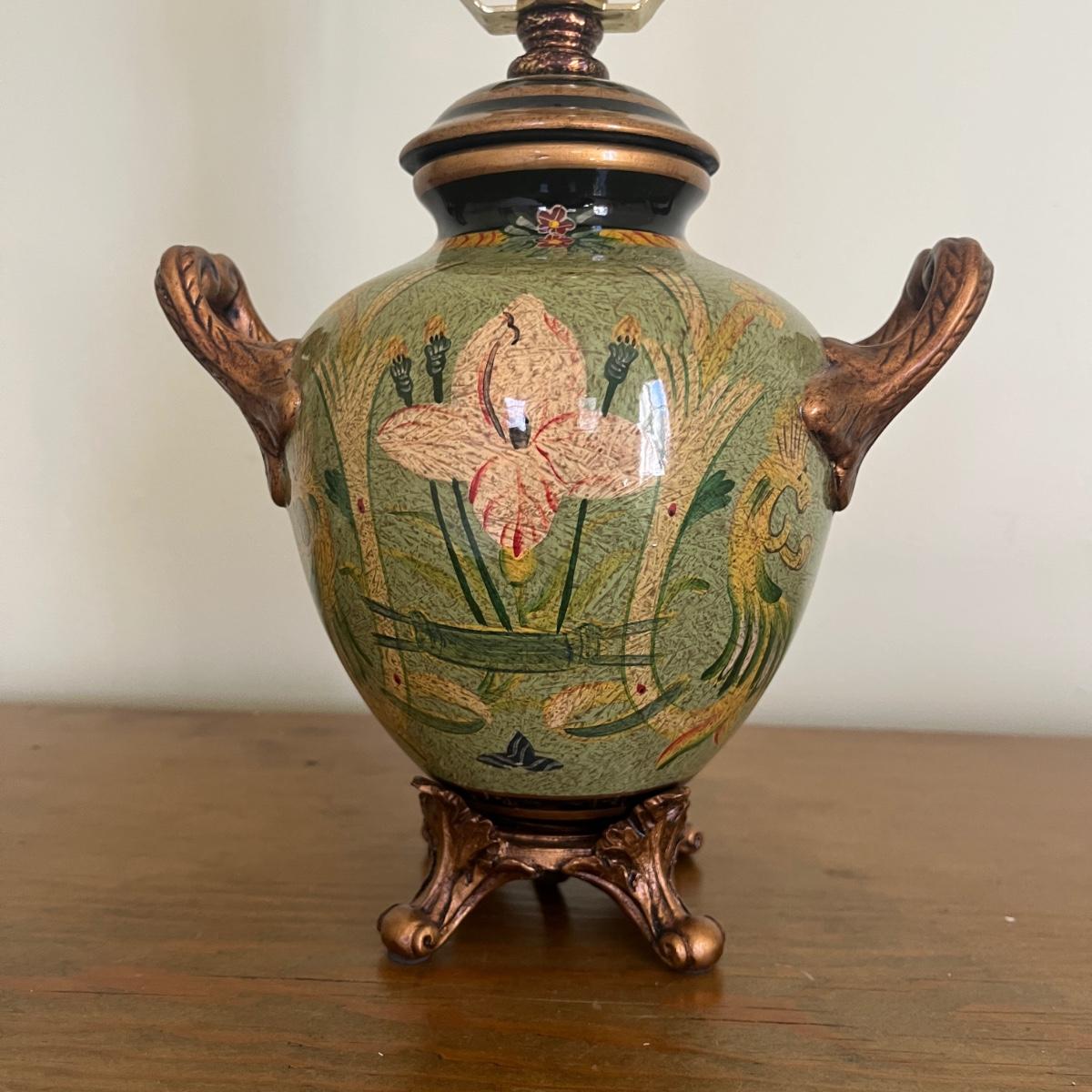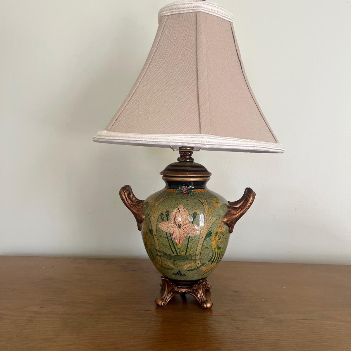 Lot includes a ceramic table lamp with a floral design. Lamp measures 10.5” x 17.5”H with shade. Lamp powered on when plugged in.