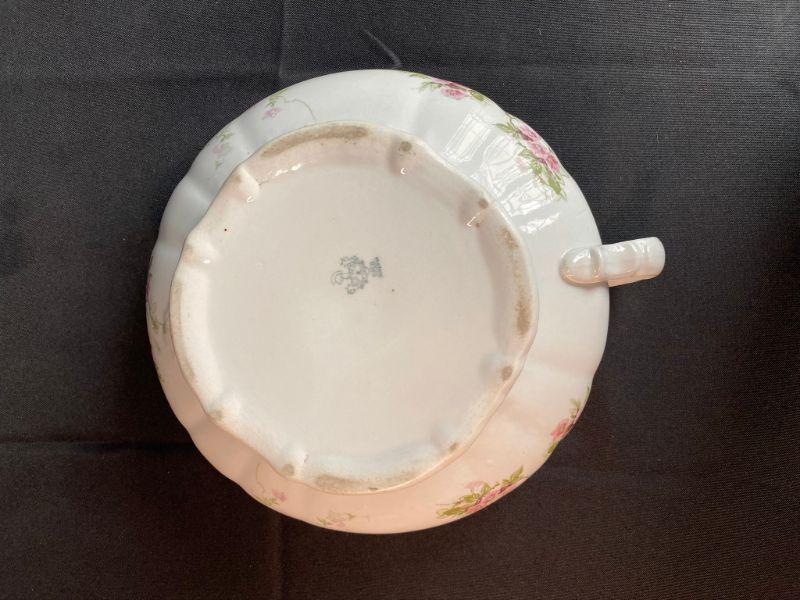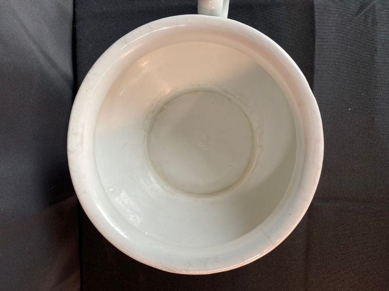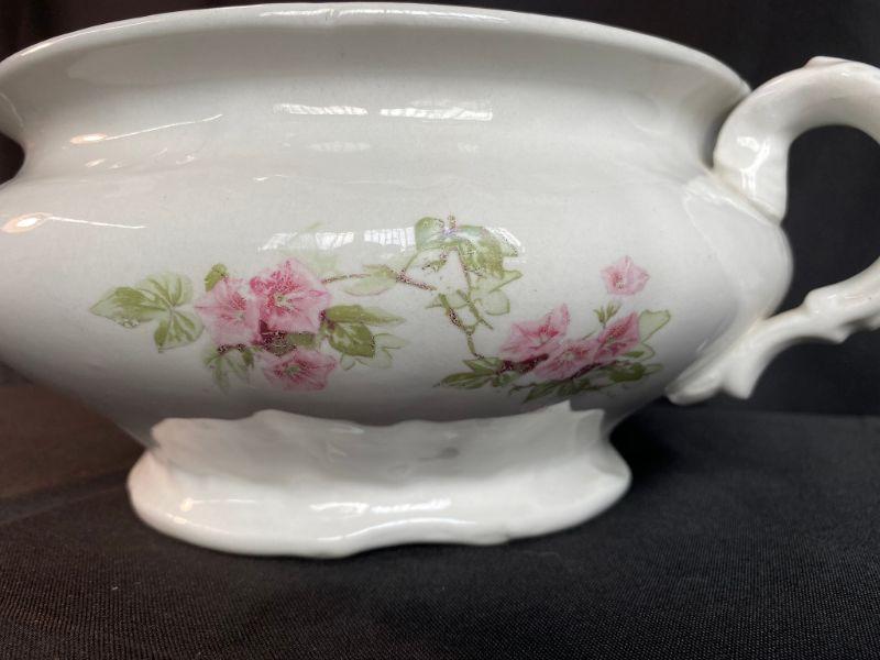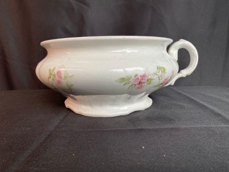 Pink flower patterned chamber pot. Has signs of age in the finish.