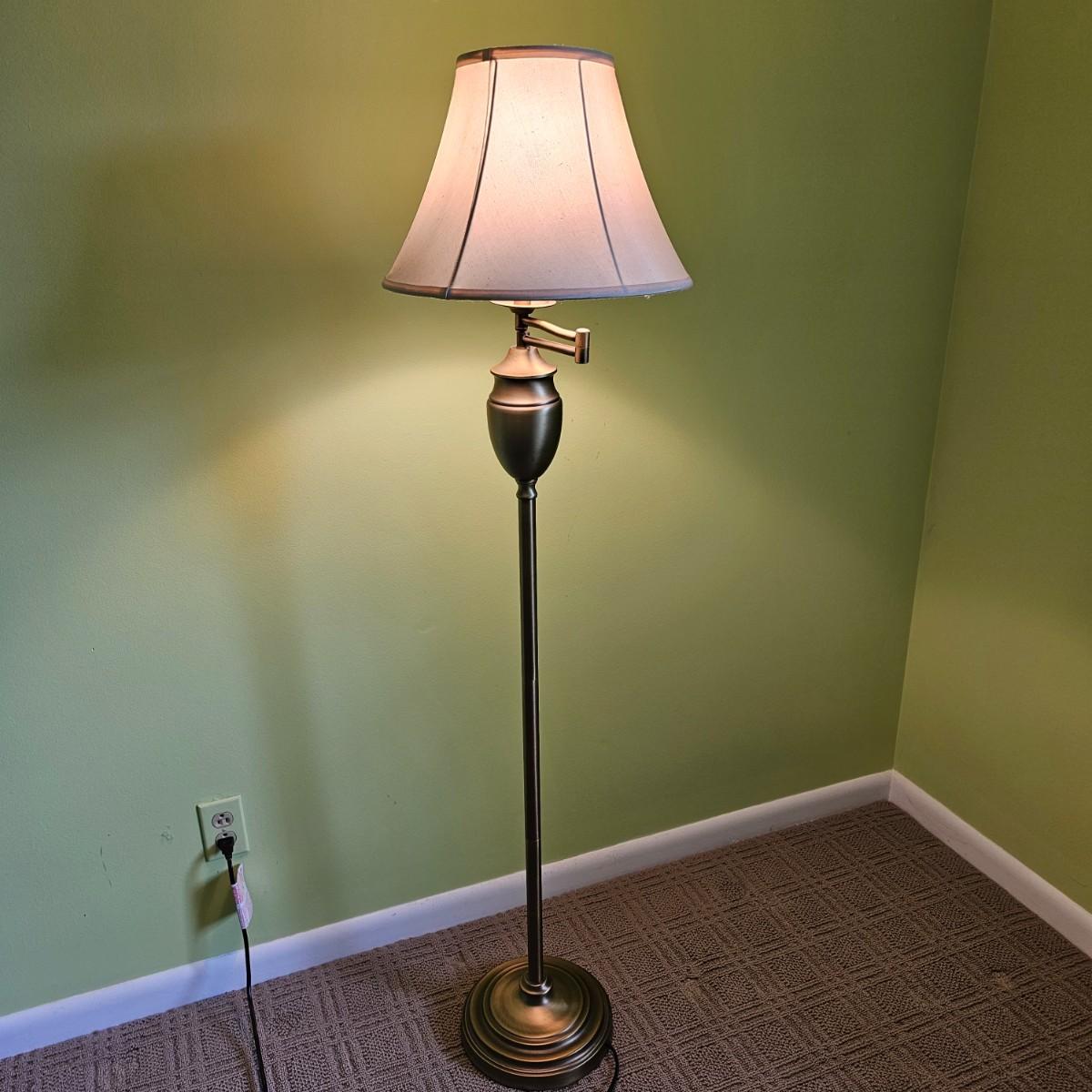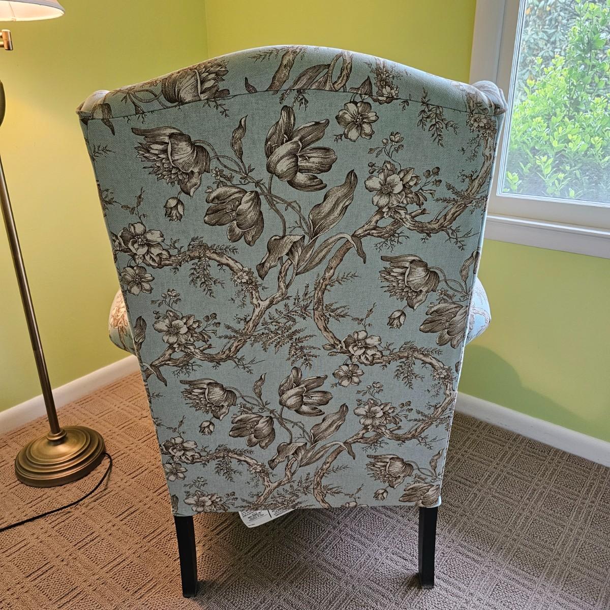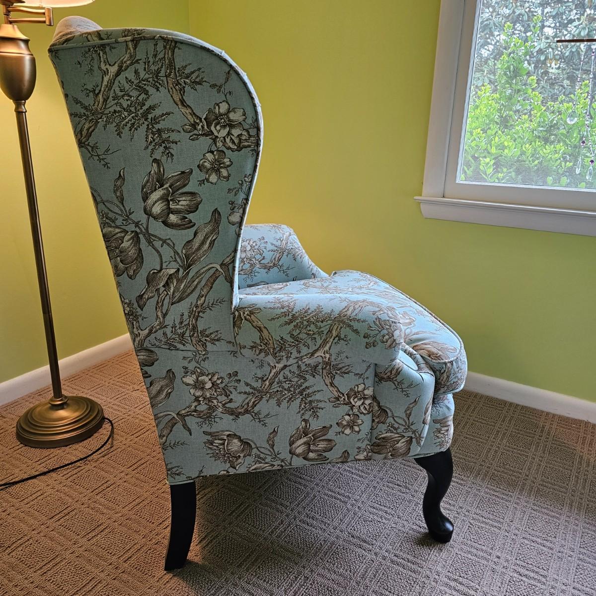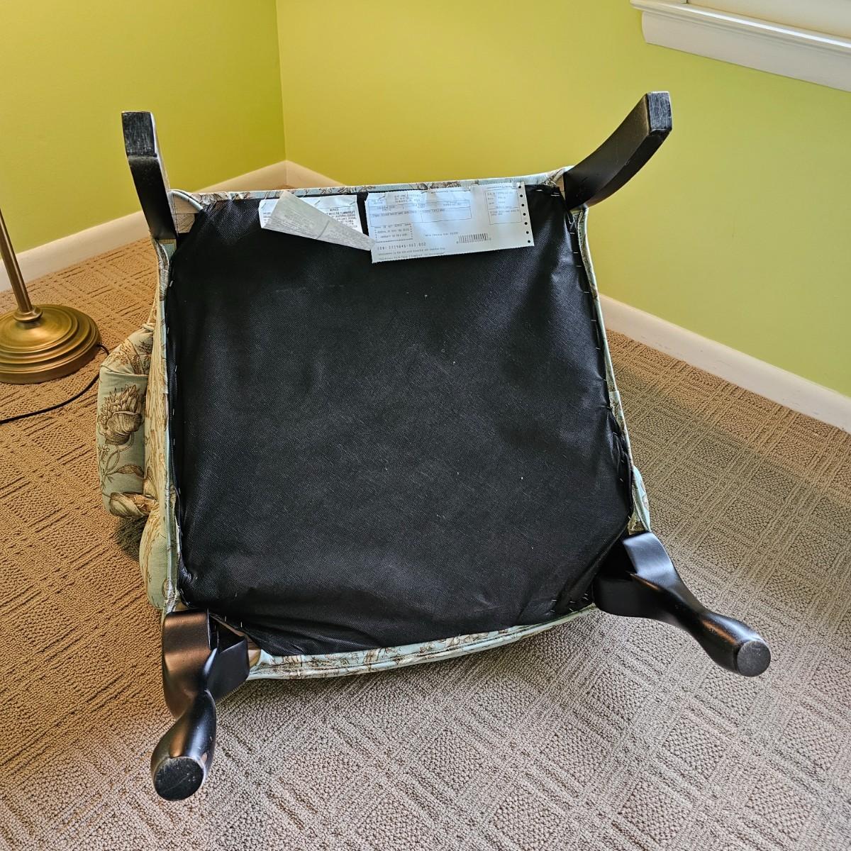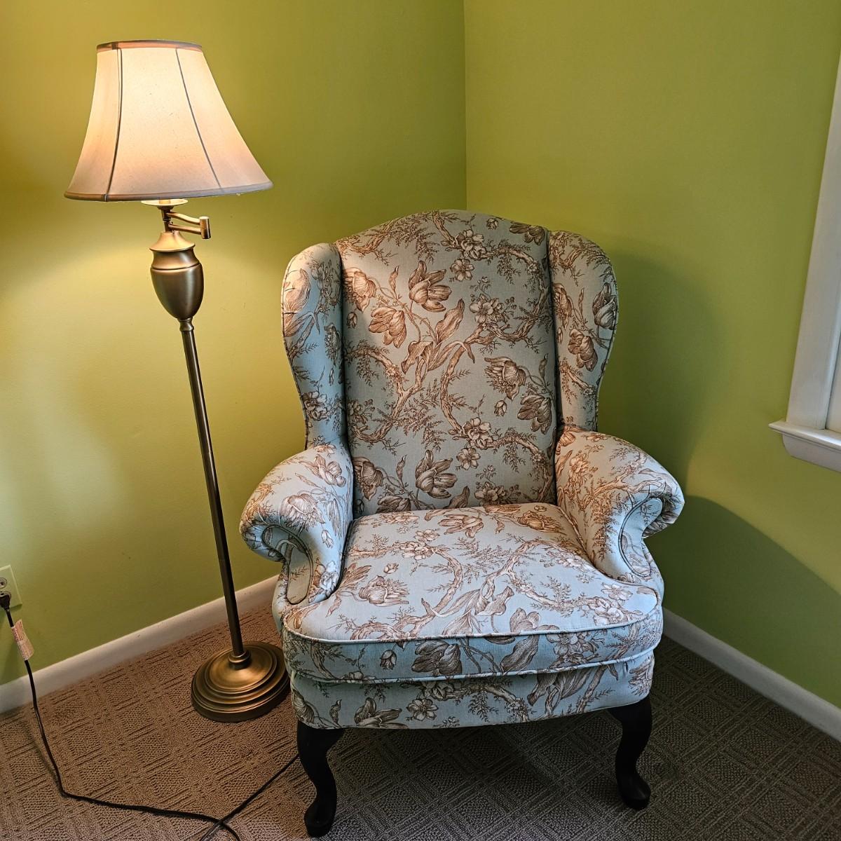 Floral vining pattern on green/grey broadcloth fabric. Wooden semi Queen Anne style legs. Chair measures 35" x 32" x 44"H, has 20" seat height. Manufactured by Best Chair of Indiana. Floor lamp is goldtone satin finish metal, has swing head and cloth shade. 15" D x 59" H, lamp powered on when plugged in. See photos for details. Local pickup only.