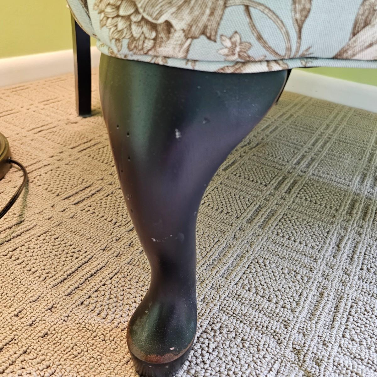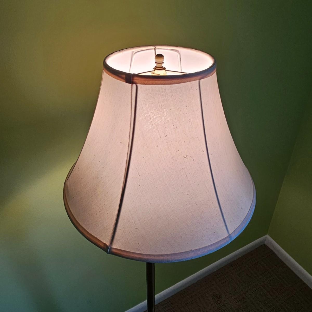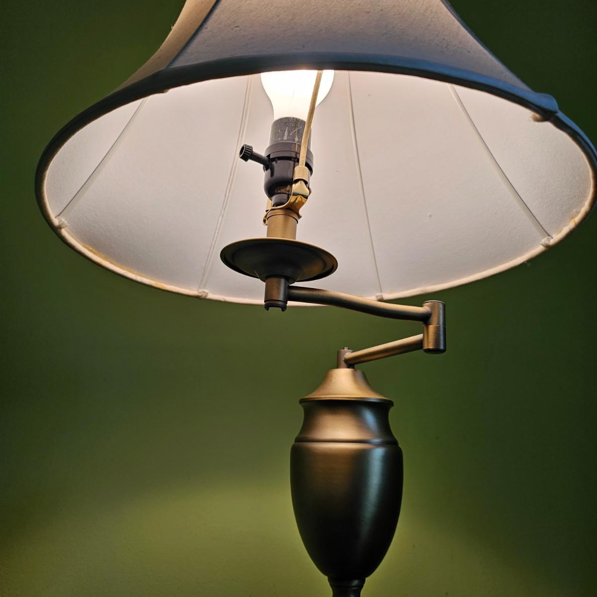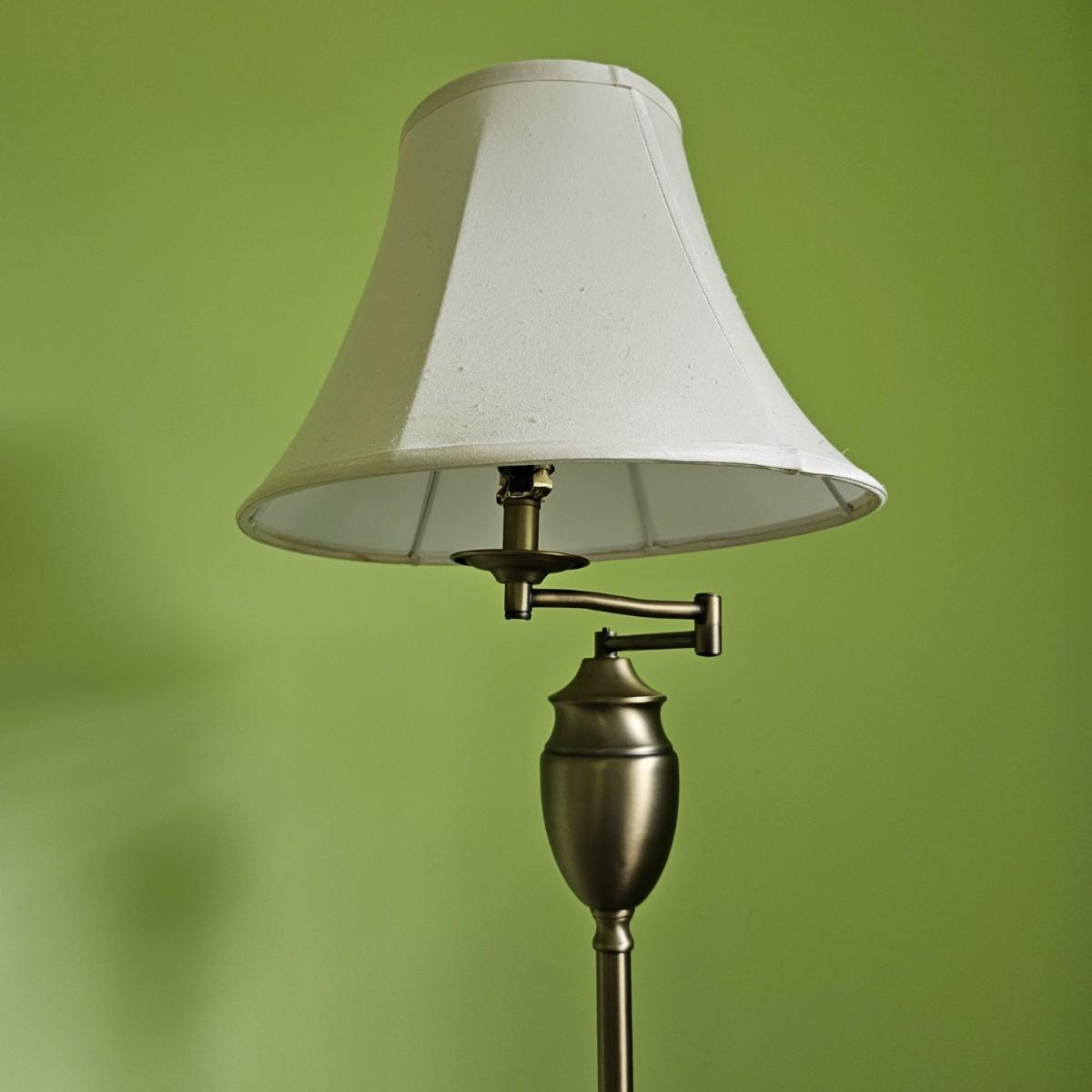 Floral vining pattern on green/grey broadcloth fabric. Wooden semi Queen Anne style legs. Chair measures 35" x 32" x 44"H, has 20" seat height. Manufactured by Best Chair of Indiana. Floor lamp is goldtone satin finish metal, has swing head and cloth shade. 15" D x 59" H, lamp powered on when plugged in. See photos for details. Local pickup only.