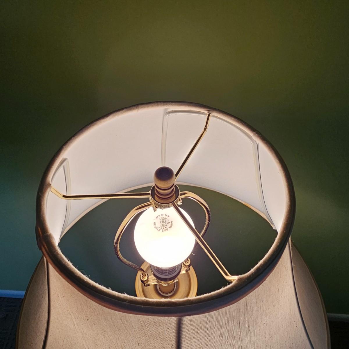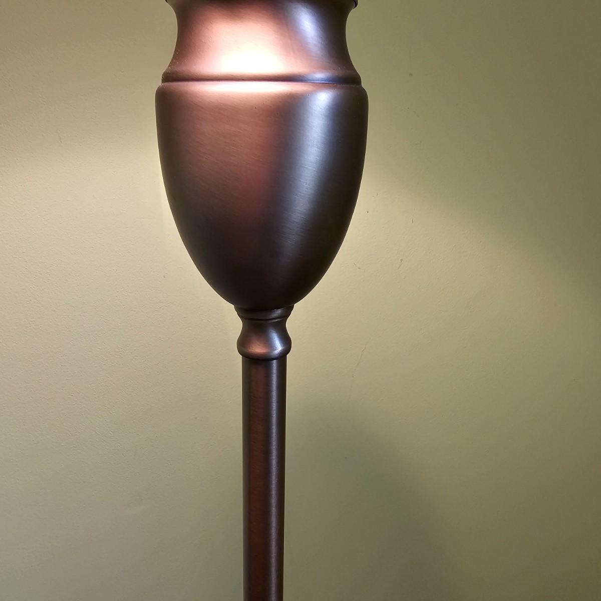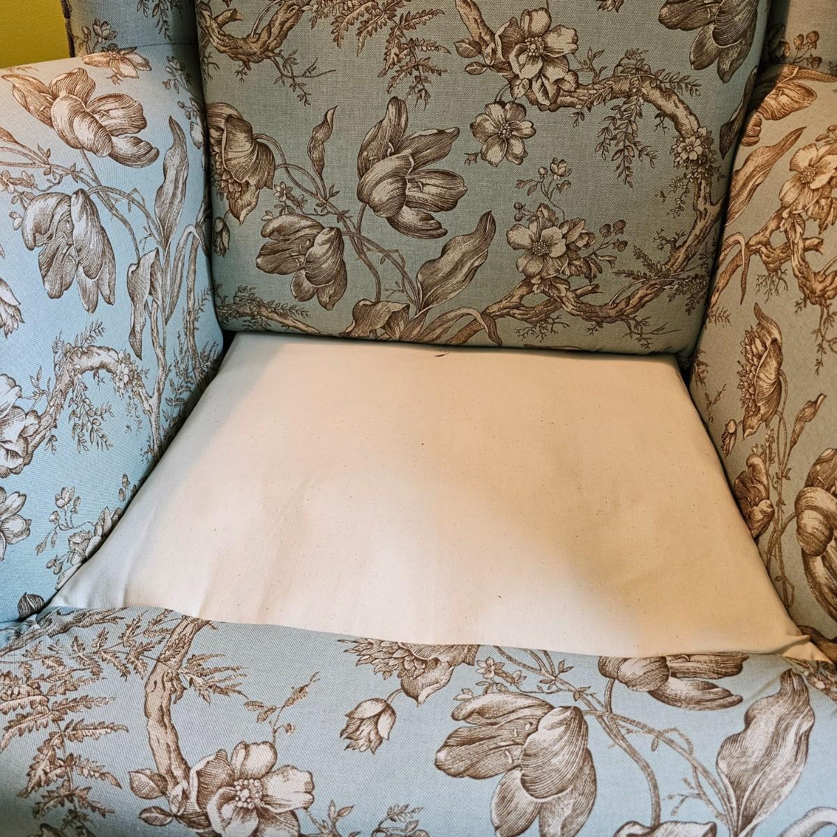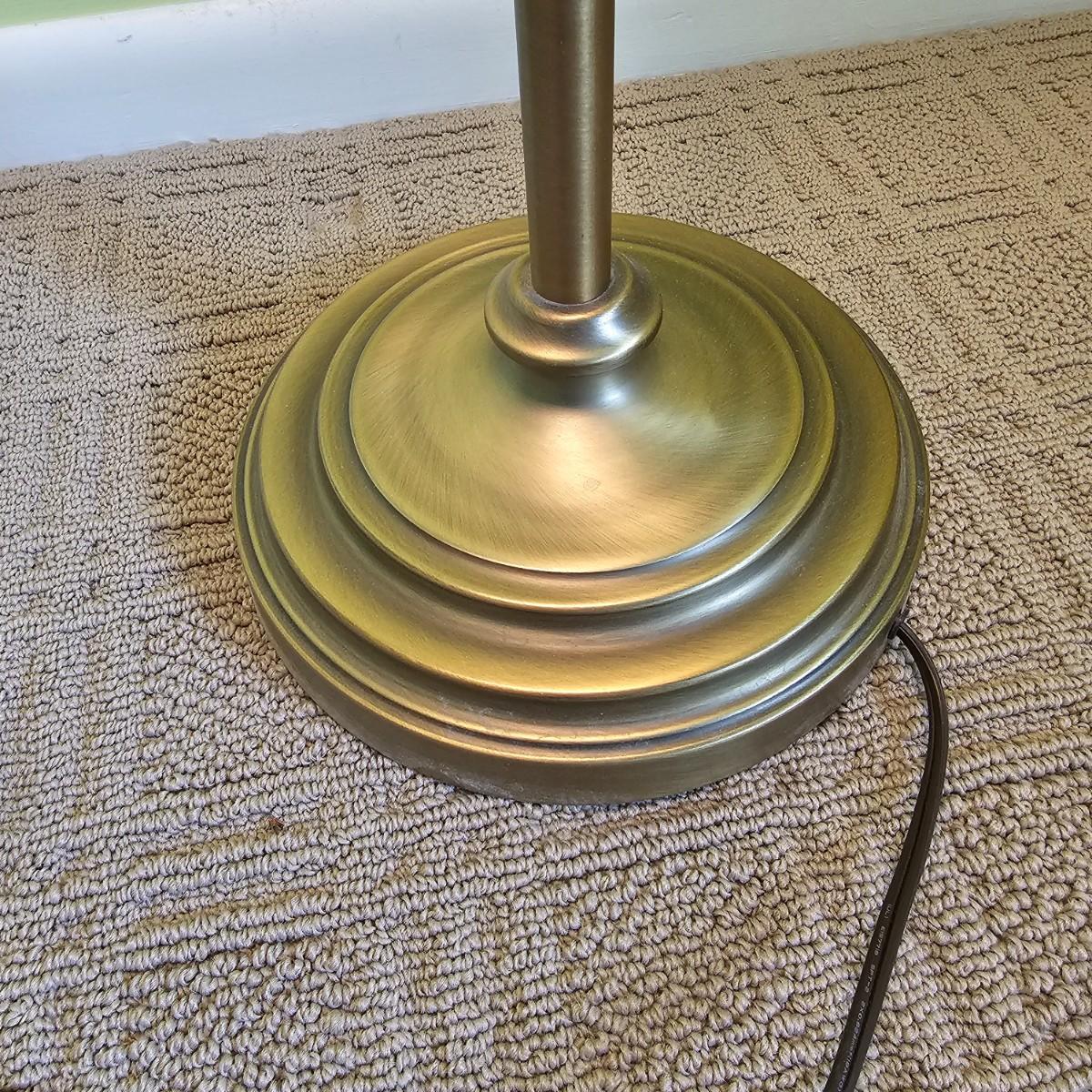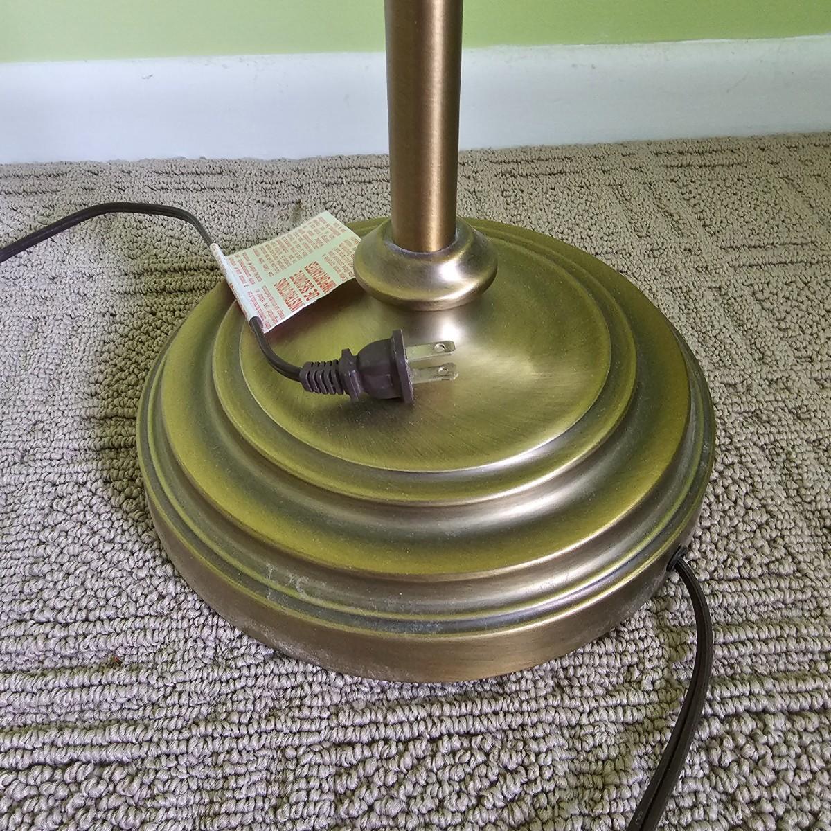 Floral vining pattern on green/grey broadcloth fabric. Wooden semi Queen Anne style legs. Chair measures 35" x 32" x 44"H, has 20" seat height. Manufactured by Best Chair of Indiana. Floor lamp is goldtone satin finish metal, has swing head and cloth shade. 15" D x 59" H, lamp powered on when plugged in. See photos for details. Local pickup only.
