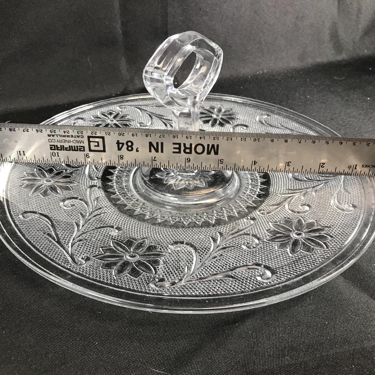 Glass serving dish in a floral pattern with a single center handle. Measures approximately 11.75“ across; see pictures.