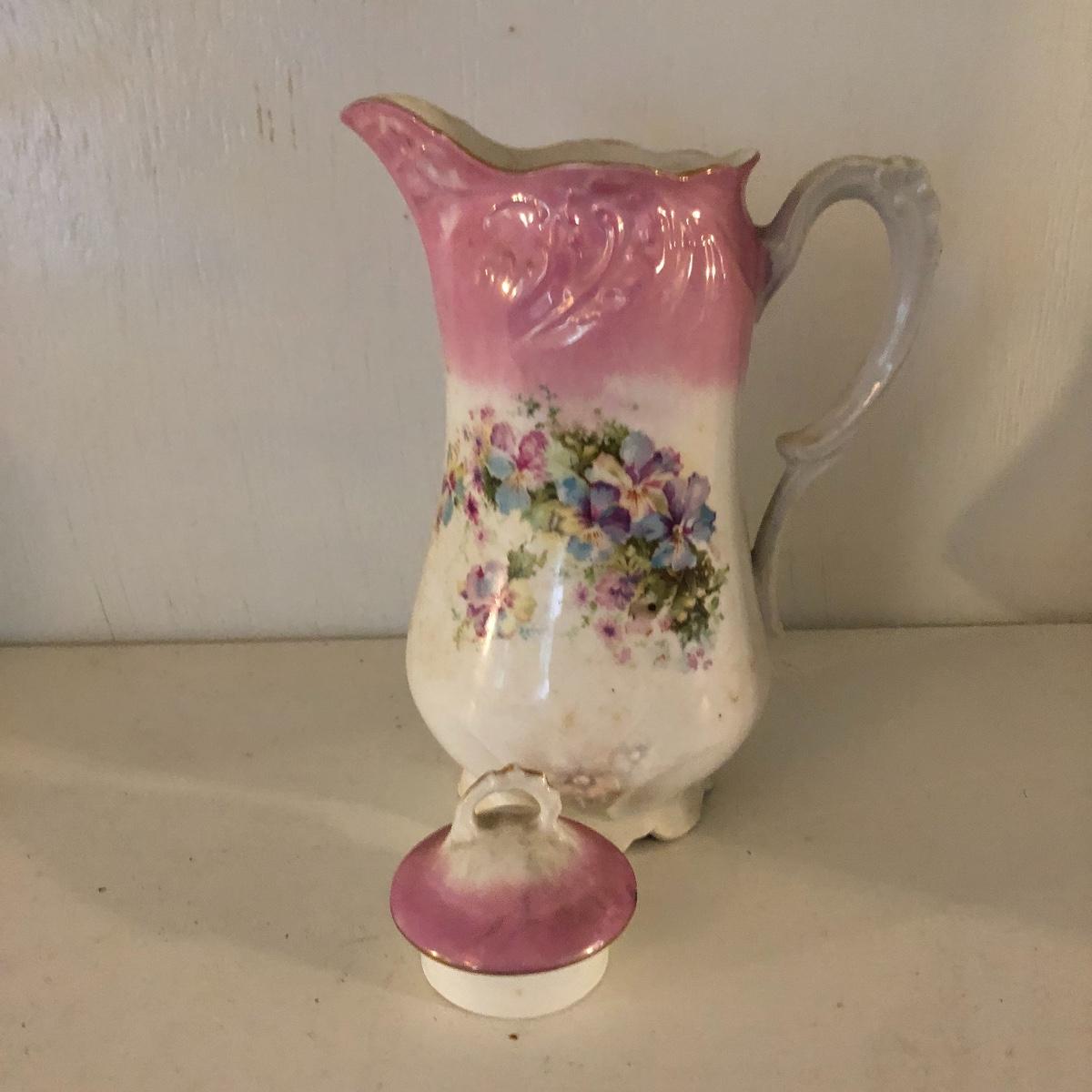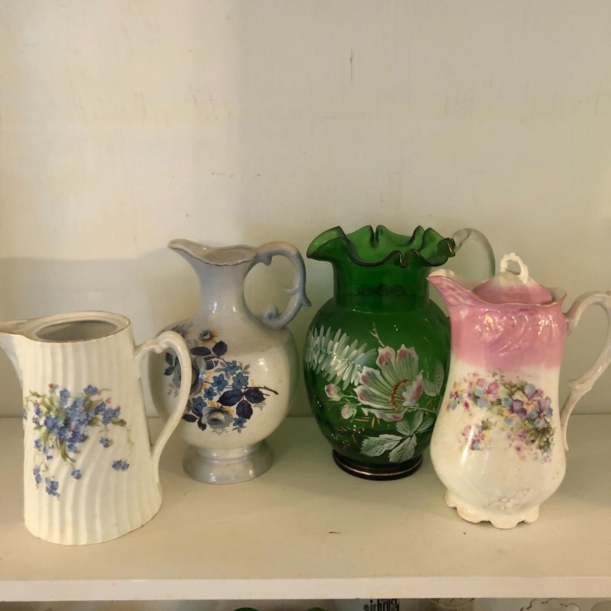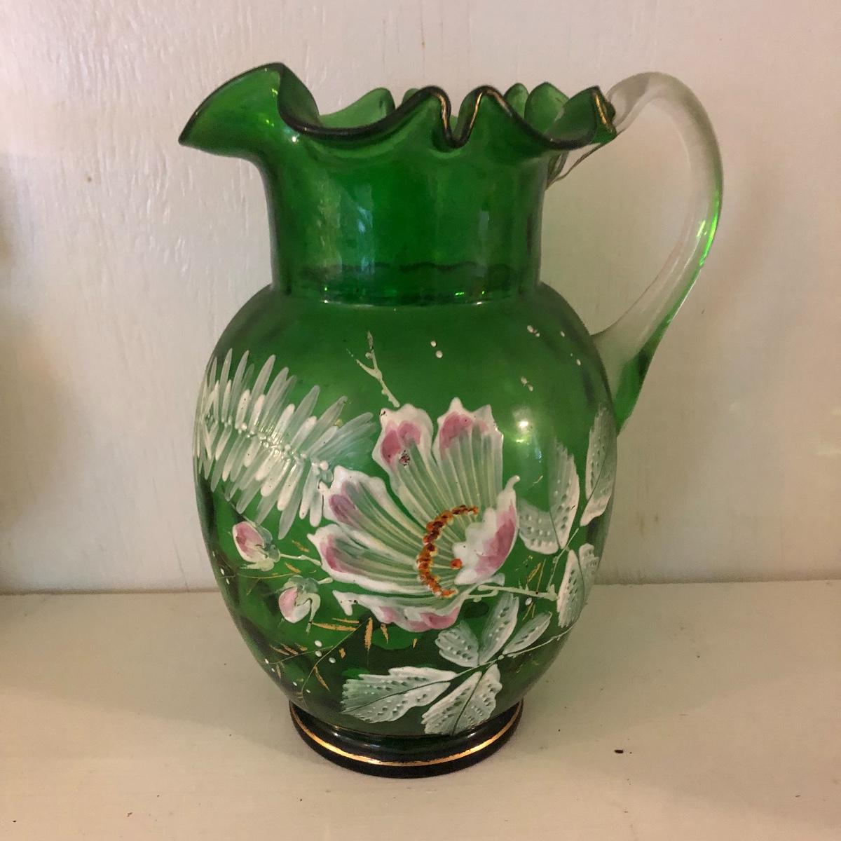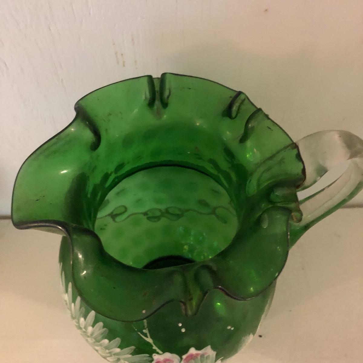 Lot includes green glass pitcher that appears to be blown glass and hand painted, pitcher with top and a pitcher with blue rose with both not marked and pitcher marked Bavaria that is missing top. Largest pitcher measures 6”D x 9.5” tall.