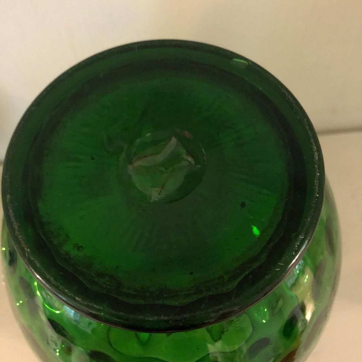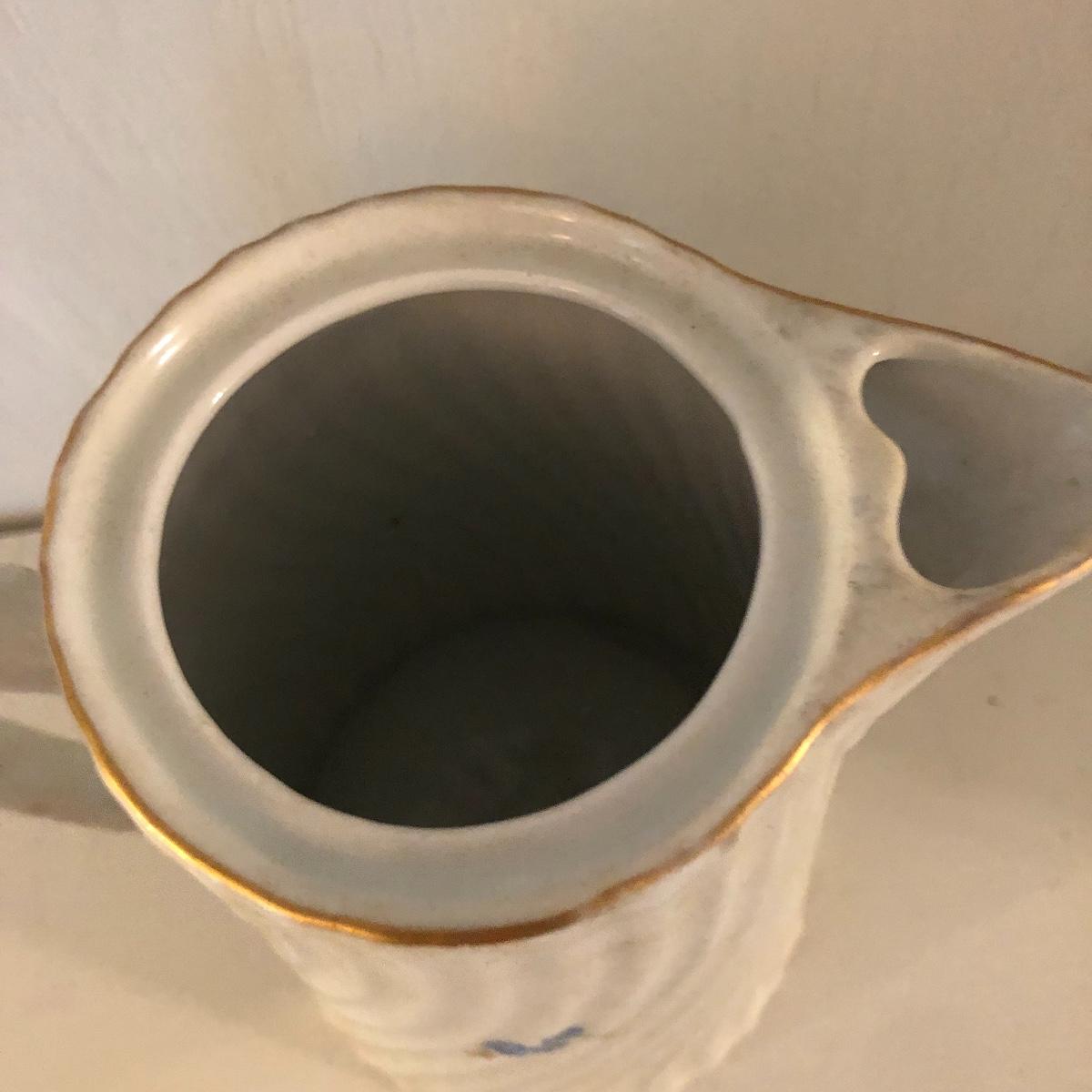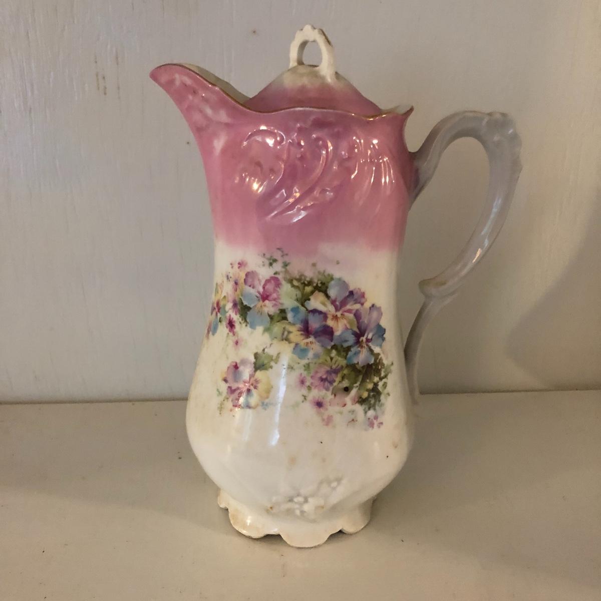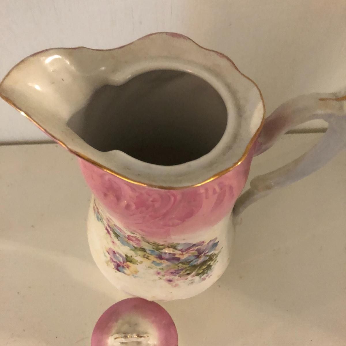 Lot includes green glass pitcher that appears to be blown glass and hand painted, pitcher with top and a pitcher with blue rose with both not marked and pitcher marked Bavaria that is missing top. Largest pitcher measures 6”D x 9.5” tall.