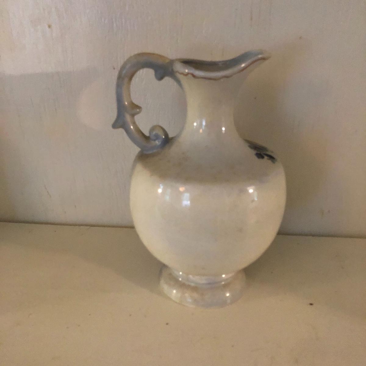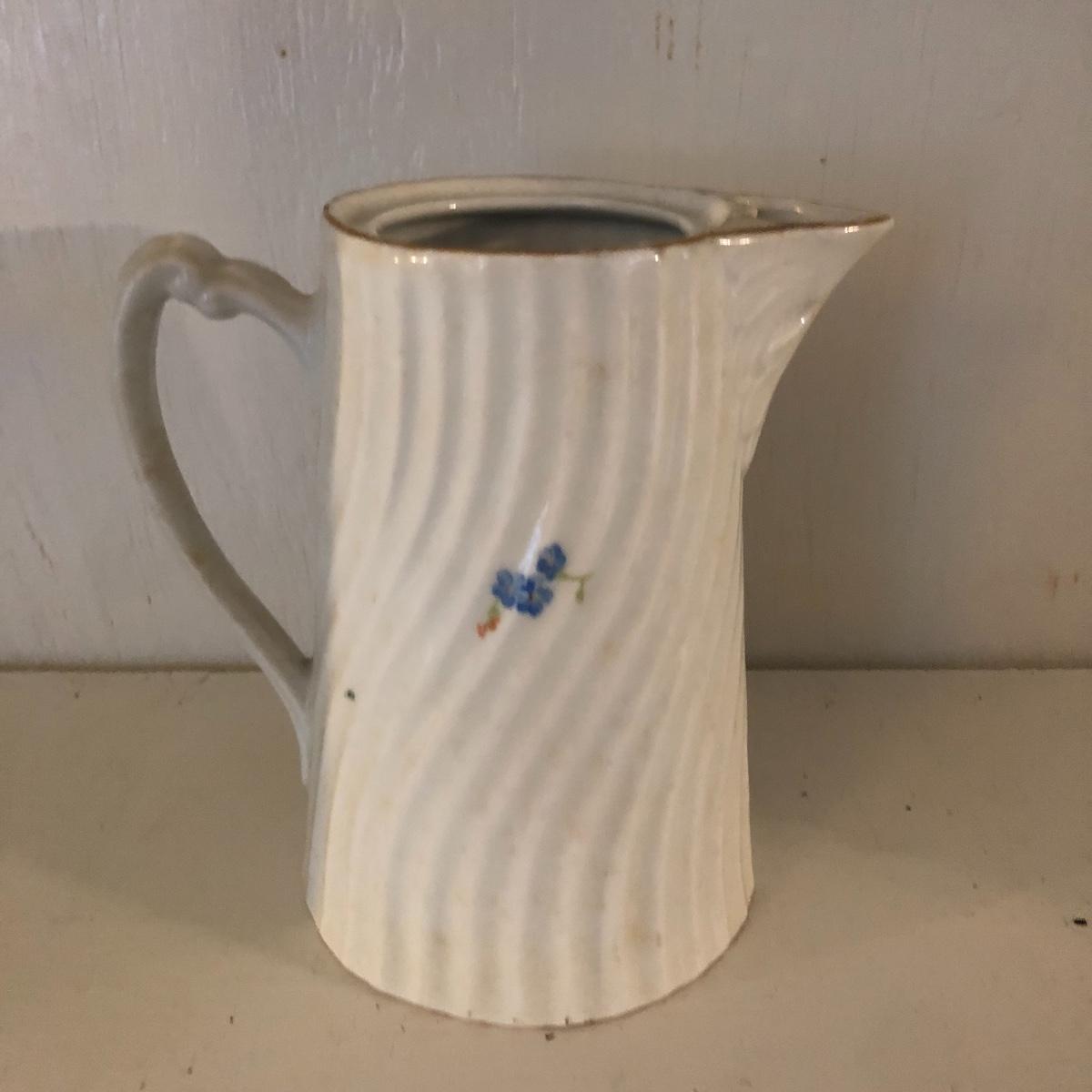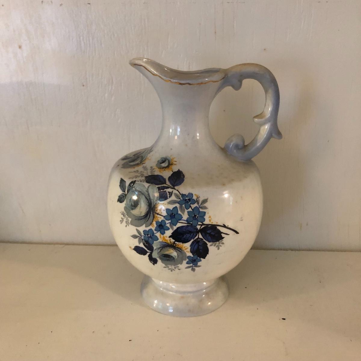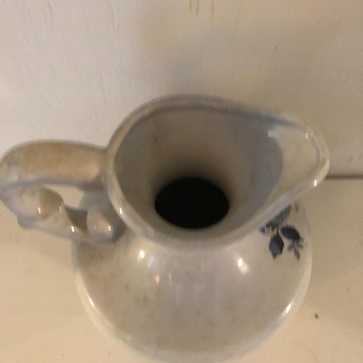 Lot includes green glass pitcher that appears to be blown glass and hand painted, pitcher with top and a pitcher with blue rose with both not marked and pitcher marked Bavaria that is missing top. Largest pitcher measures 6”D x 9.5” tall.