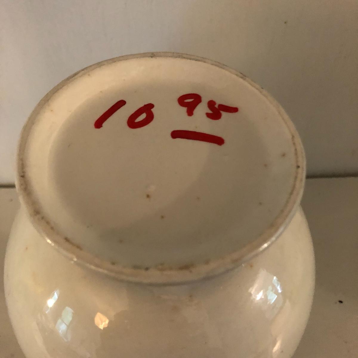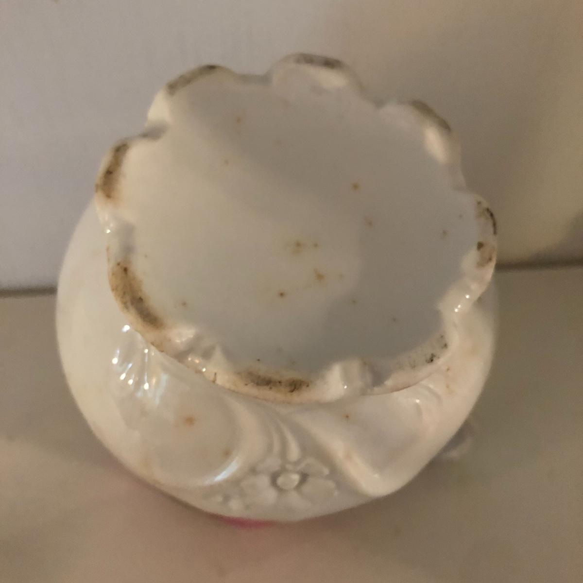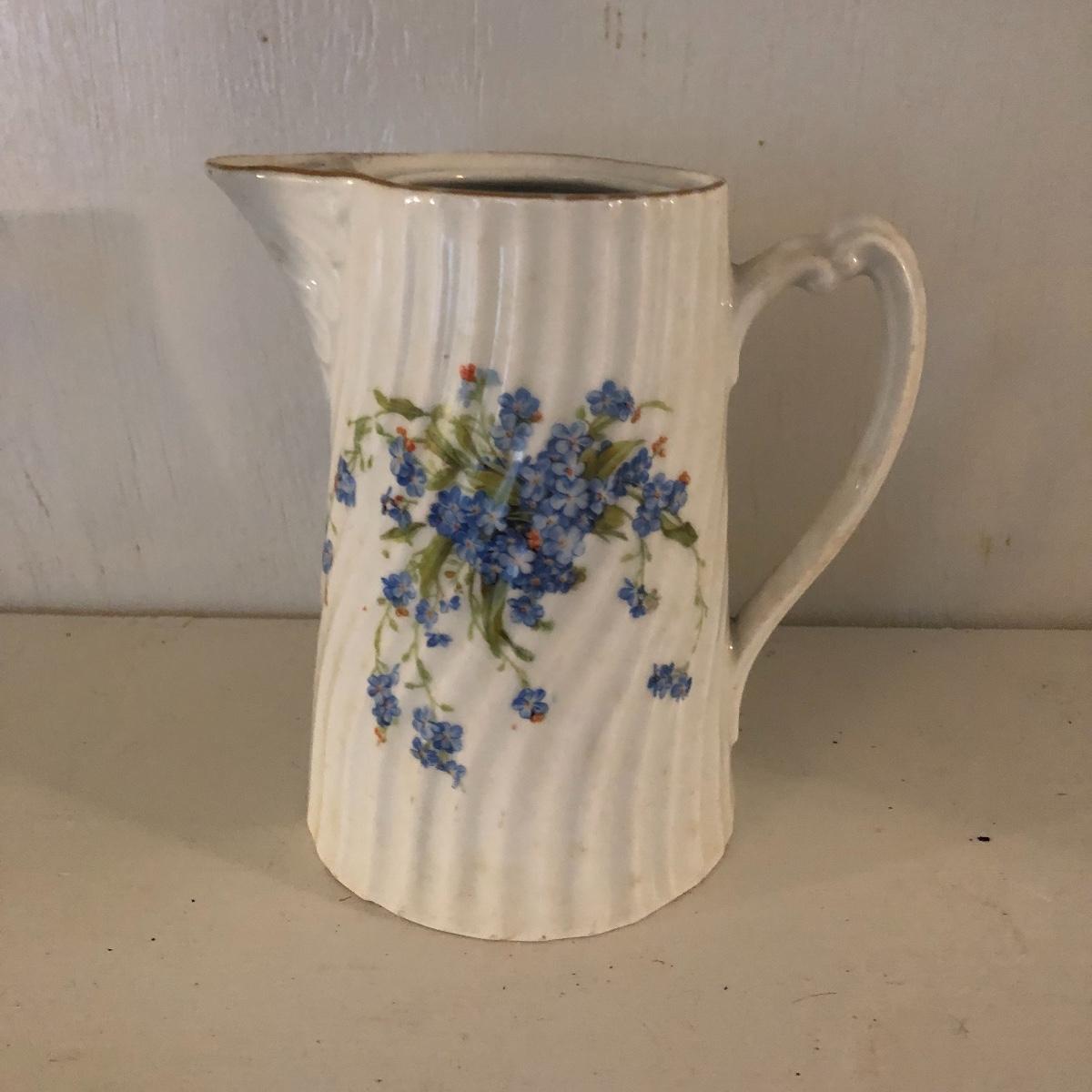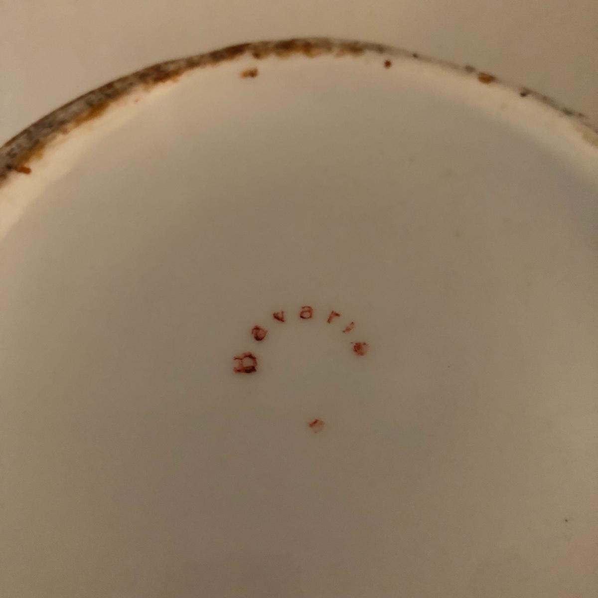 Lot includes green glass pitcher that appears to be blown glass and hand painted, pitcher with top and a pitcher with blue rose with both not marked and pitcher marked Bavaria that is missing top. Largest pitcher measures 6”D x 9.5” tall.