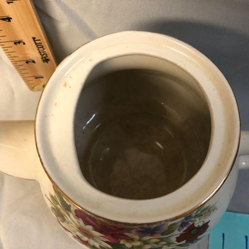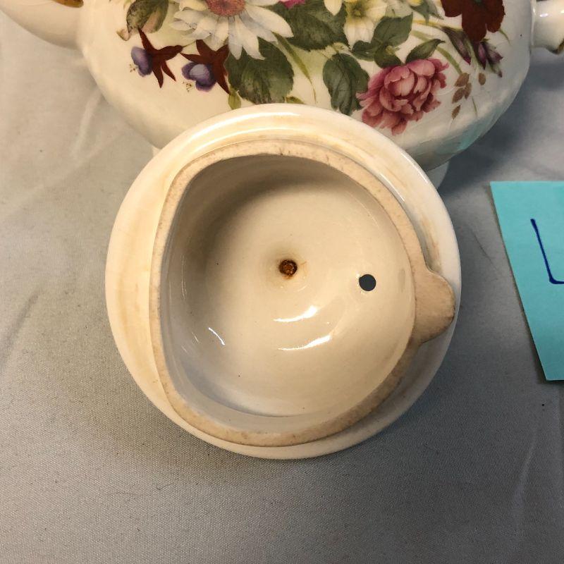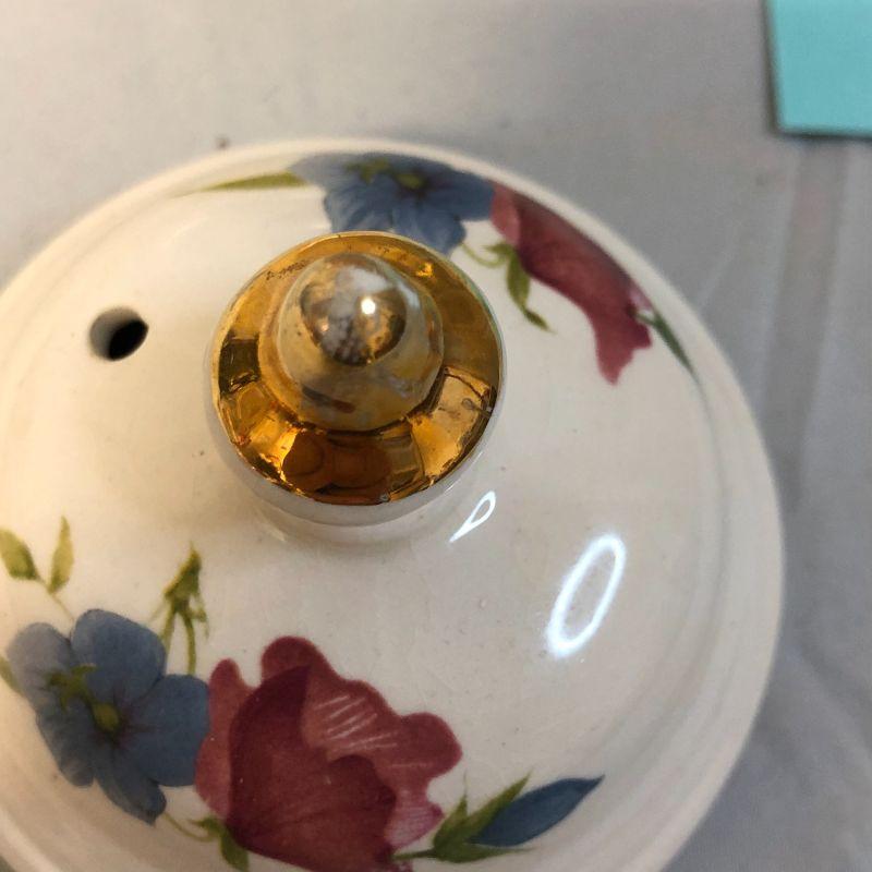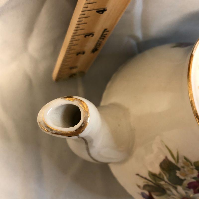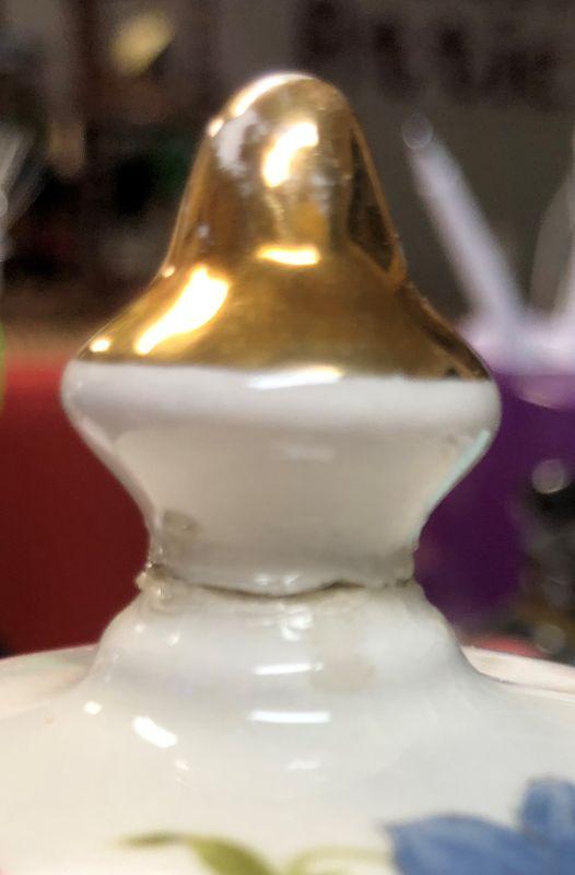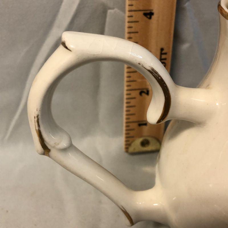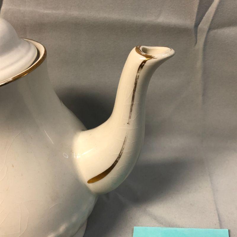 There is gold trim loss and the finial has been repaired. Otherwise, this teapot is in good condition. It does appear that it was actually used to make tea. It is about 7.25" tall.